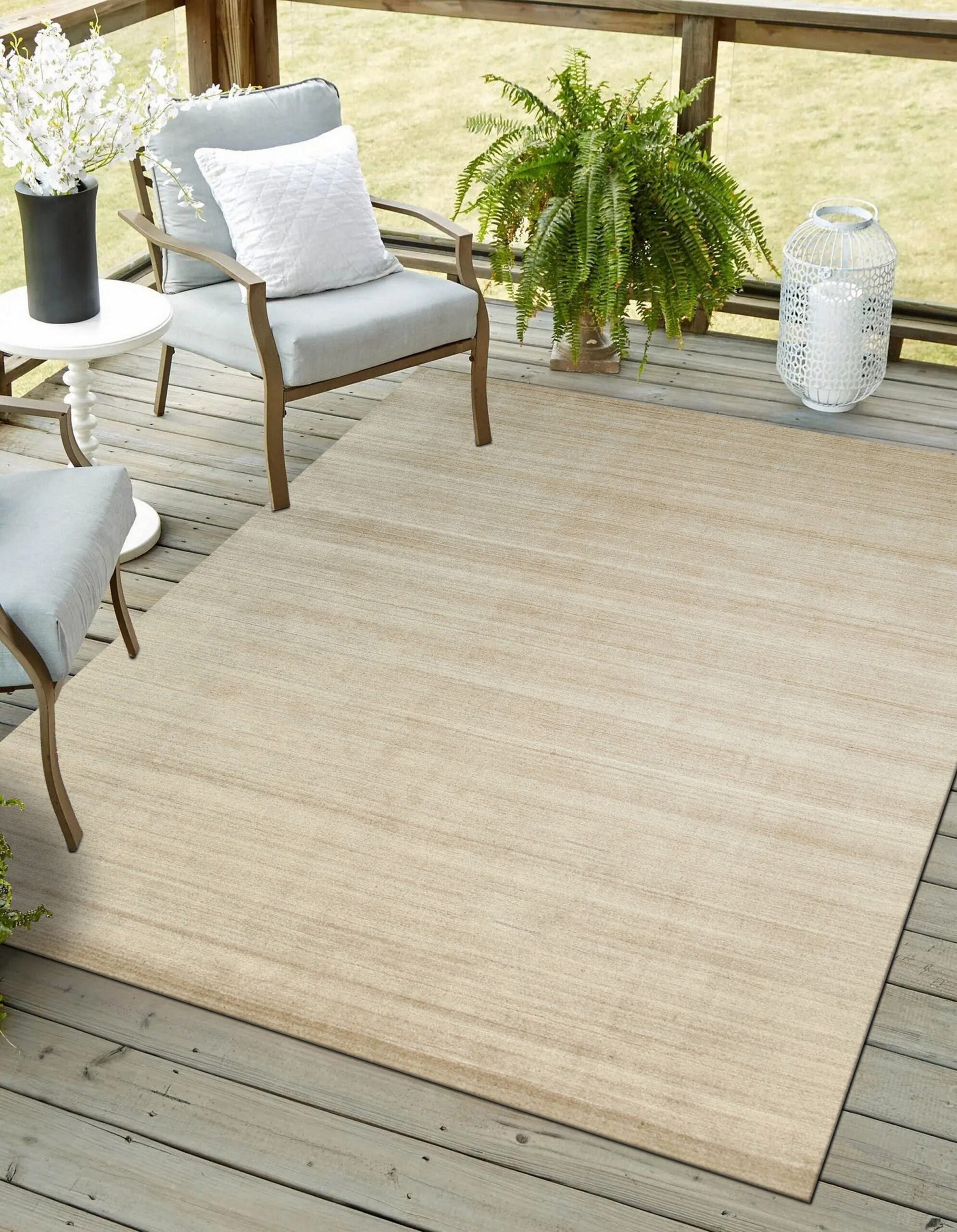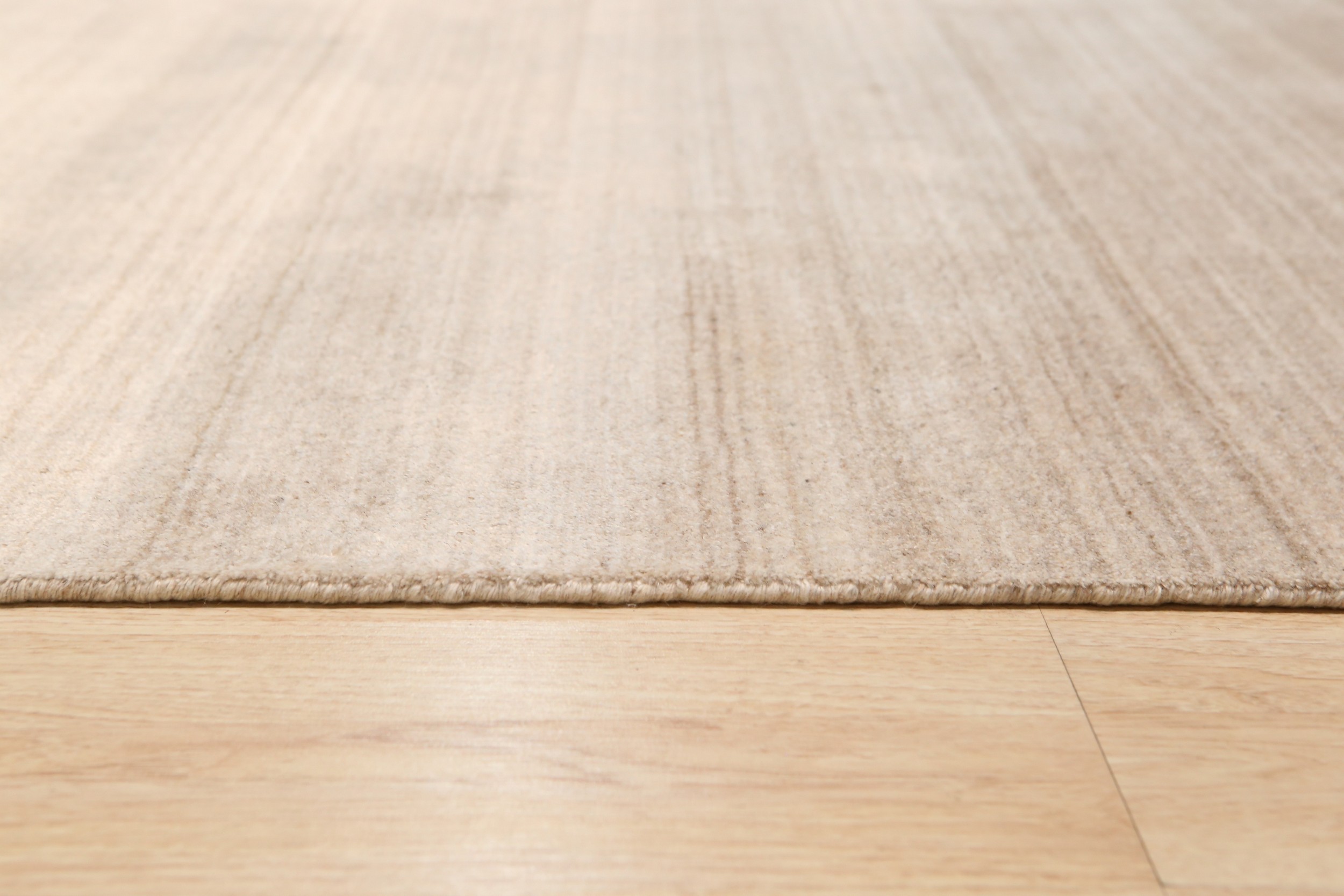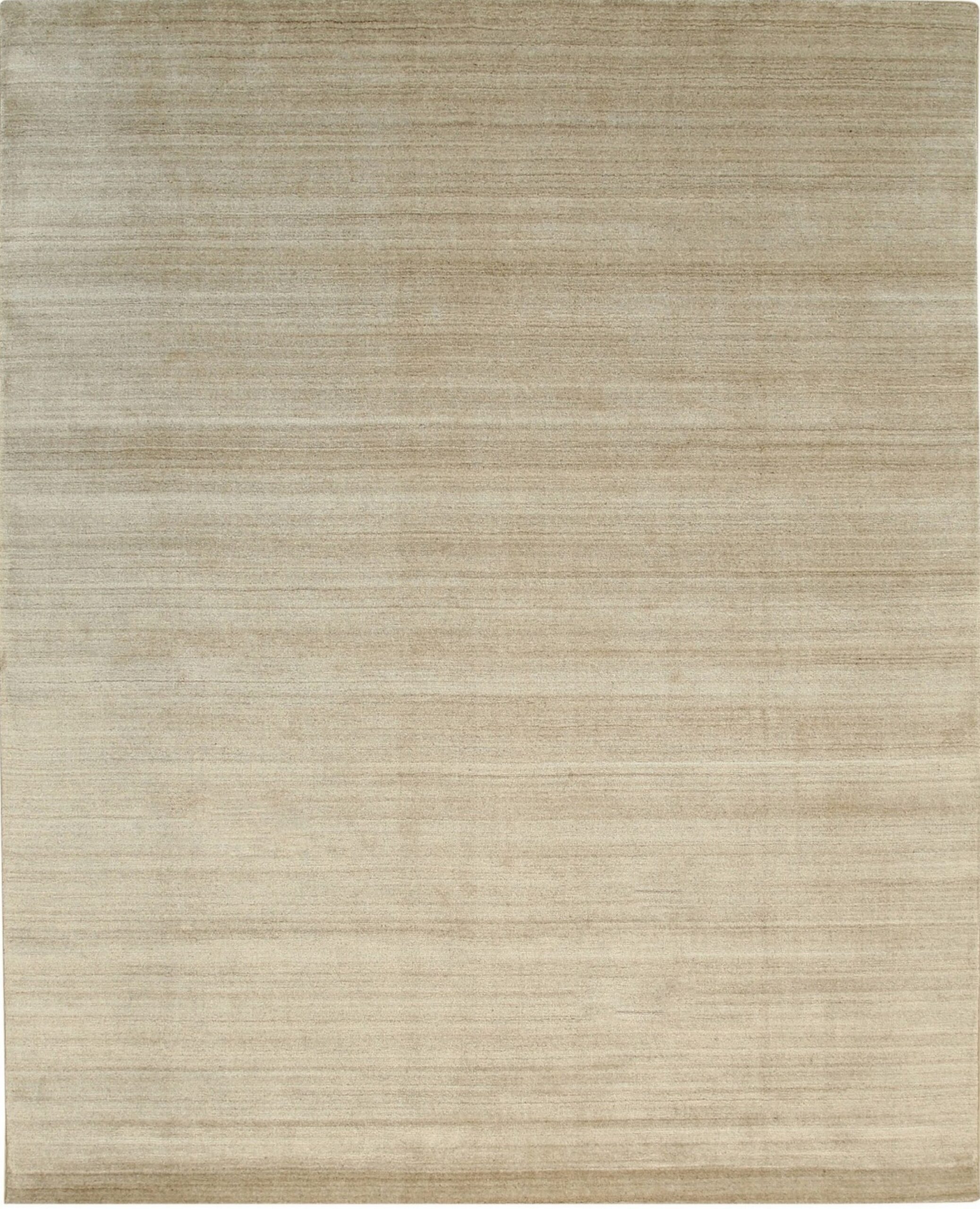 The palette features a delicate, light gold hue, offering a neutral yet warm foundation perfect for contemporary interiors. The subtle horizontal striations, known as abrash, create a dynamic movement across the field, ensuring that this piece complements other gold color rugs while maintaining its unique visual depth.