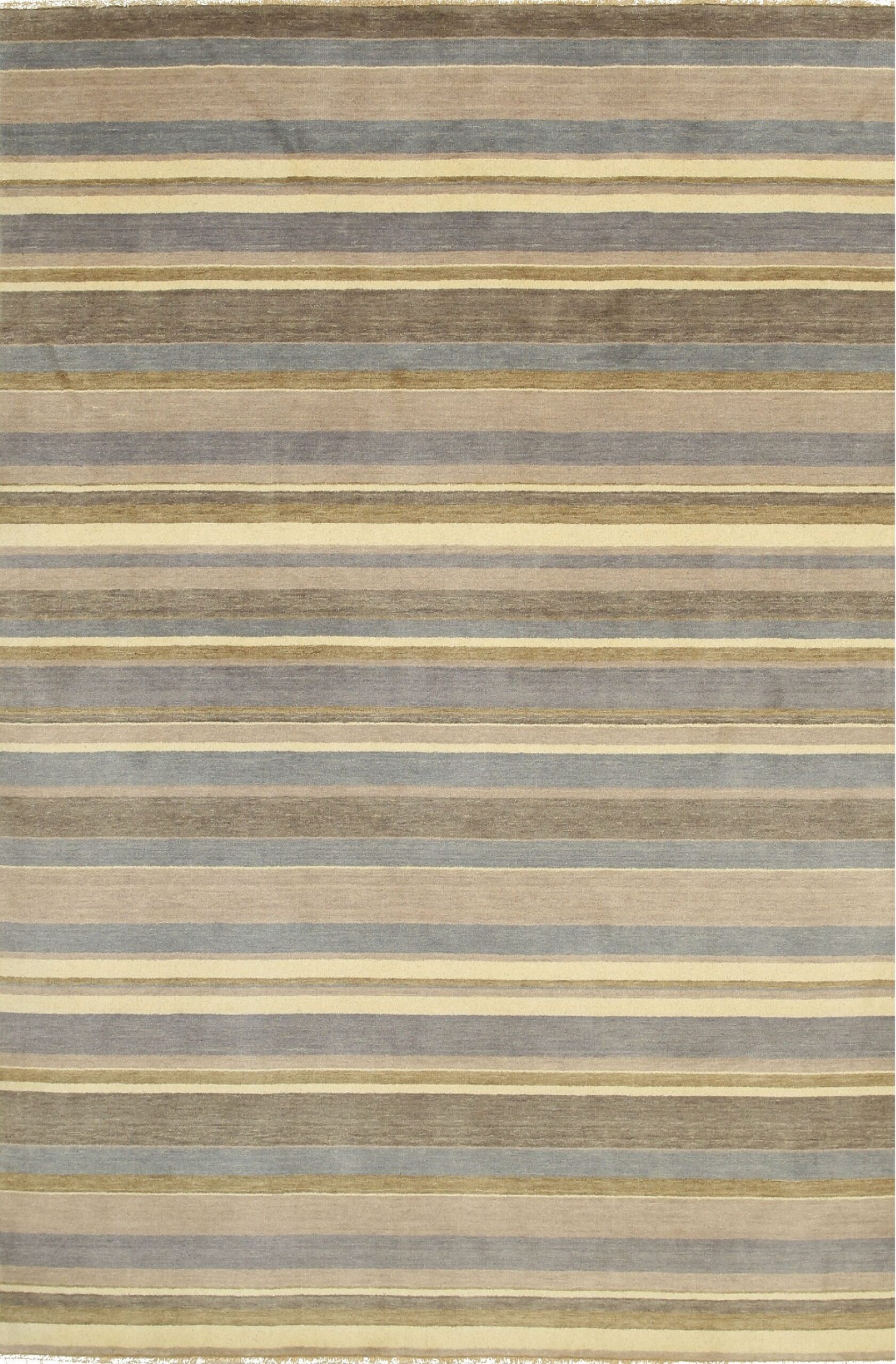 The palette is a masterful study in tonal variation, blending rich rustic browns and warm taupes with subtle bands of pale cream and slate gray. The inclusion of these cooler tones, particularly the soft, muted blue, provides a sophisticated counterpoint to the earthier hues, appealing to collectors seeking blue color rugs that offer understated elegance rather than vibrant saturation.