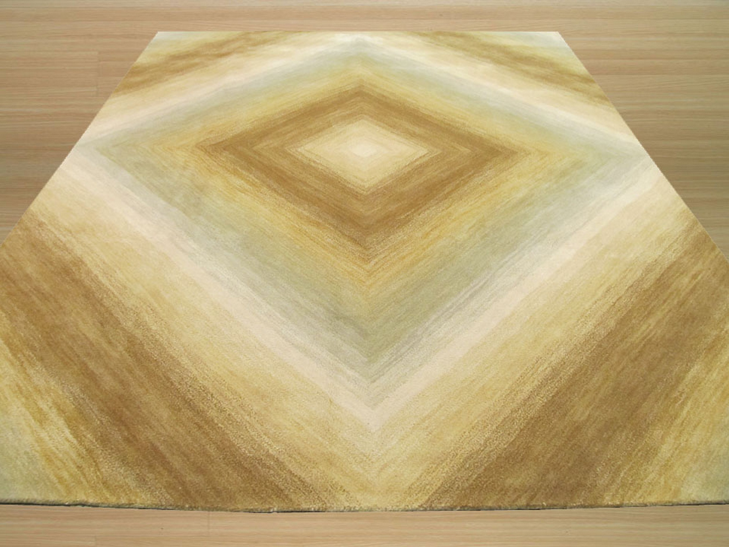 The design centers on a striking, large-scale diamond motif, created by painterly diagonal bands of color that converge at the center. The palette is a masterful study in warm neutrality, featuring rich shades of ivory, taupe, and subtle hints of sage, providing a luminous, sun-drenched effect that aligns beautifully with gold yellow orange color rugs.