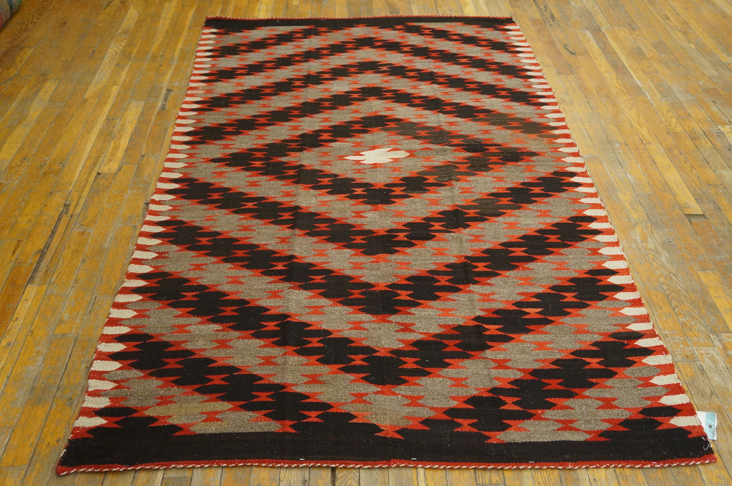 The field employs a powerful, repeating diamond or hourglass motif set against a vibrant ground of saturated rust red. The contrasting elements of deep black and mottled natural tan wool create a dynamic visual rhythm, typical of the finest examples of Native American Navajo rugs from this period, where simplicity of form yields maximum impact.