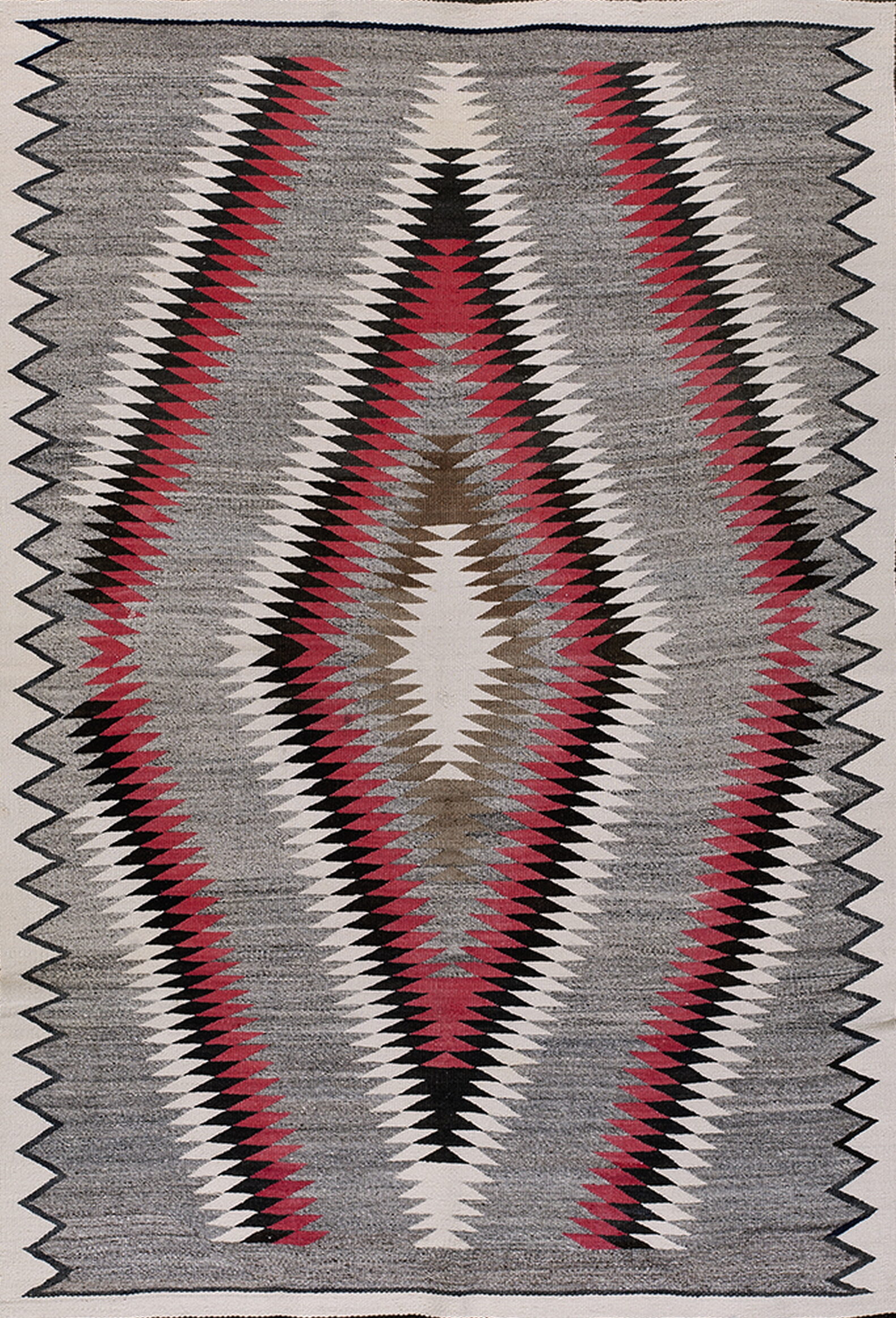 The composition is dominated by a striking, elongated central diamond, rendered through meticulously executed serrated edges and sharp points. This complex interplay of lines and angles defines the powerful aesthetic of geometric rugs from this region, where traditional motifs were often adapted into bold, modernistic statements suitable for the trading post era.