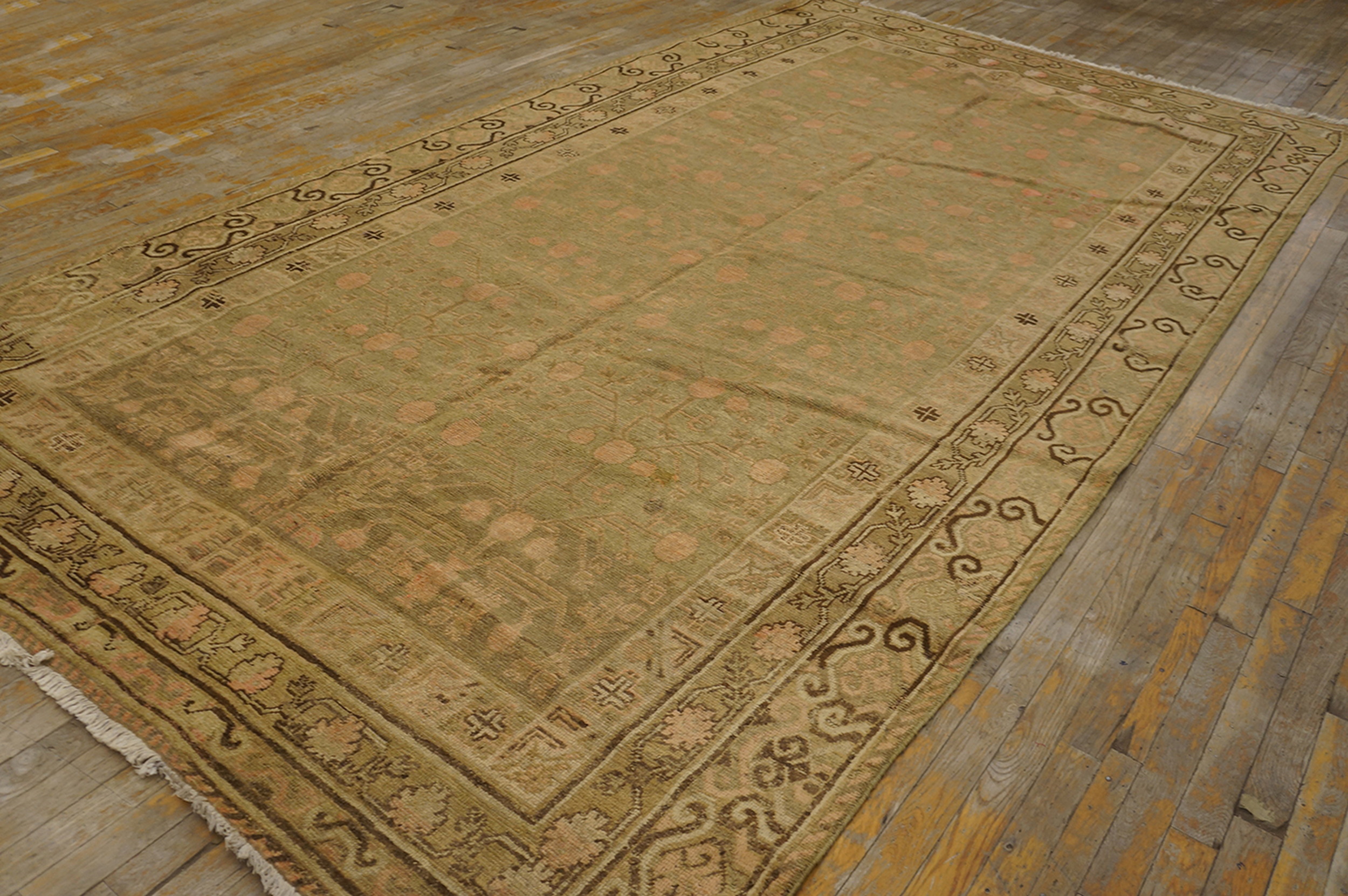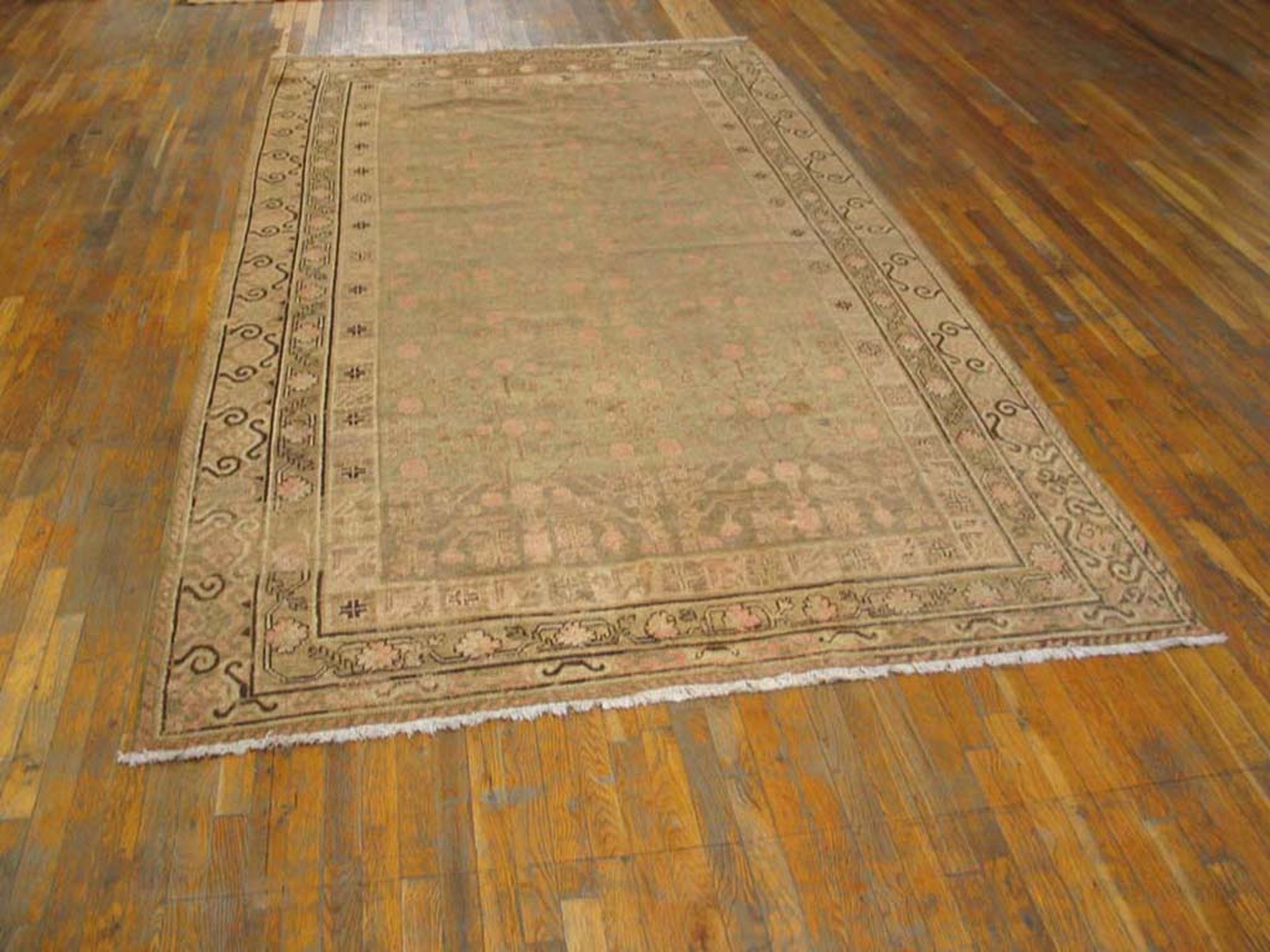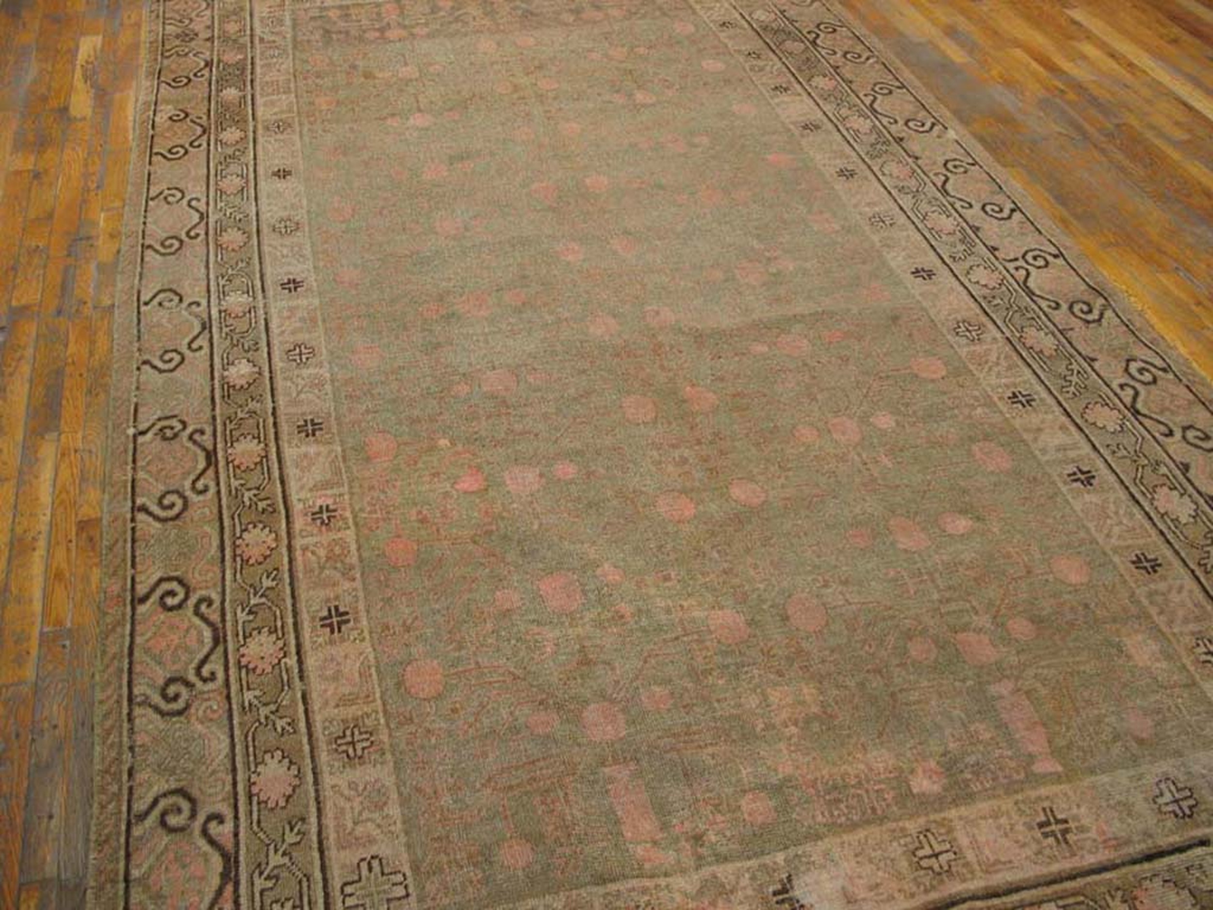 Antique East Turkestan Wool Hand Knotted Pile Rug, Country of Origin: East Turkestan, Circa Date: 1920s. This exquisite piece represents the refined aesthetic of early 20th-century East Turkestan rugs, often characterized by their luxurious wool pile and subtle color palettes. The 1920s saw a rise in export-quality weaving, blending traditional motifs with Western tastes for understated elegance.