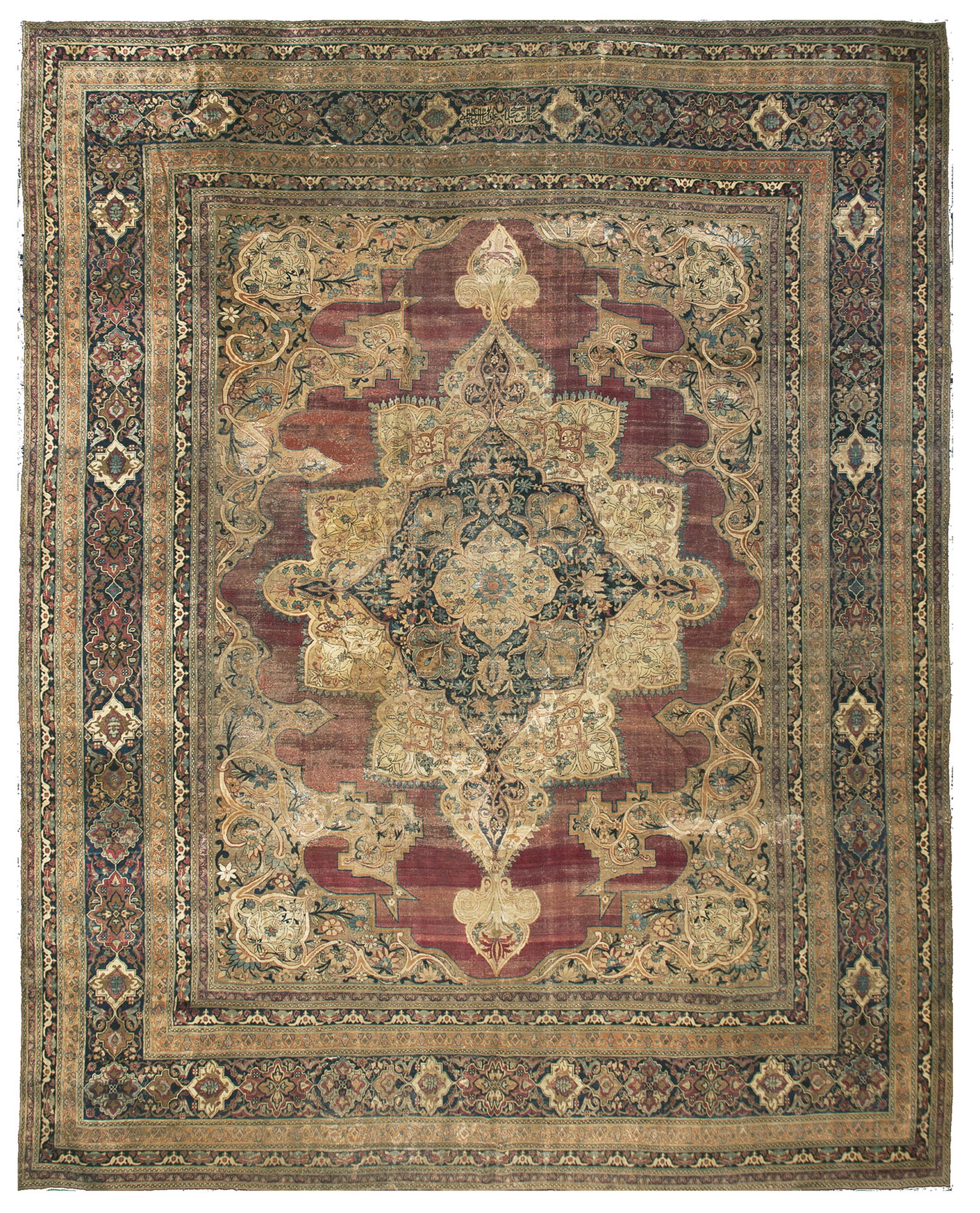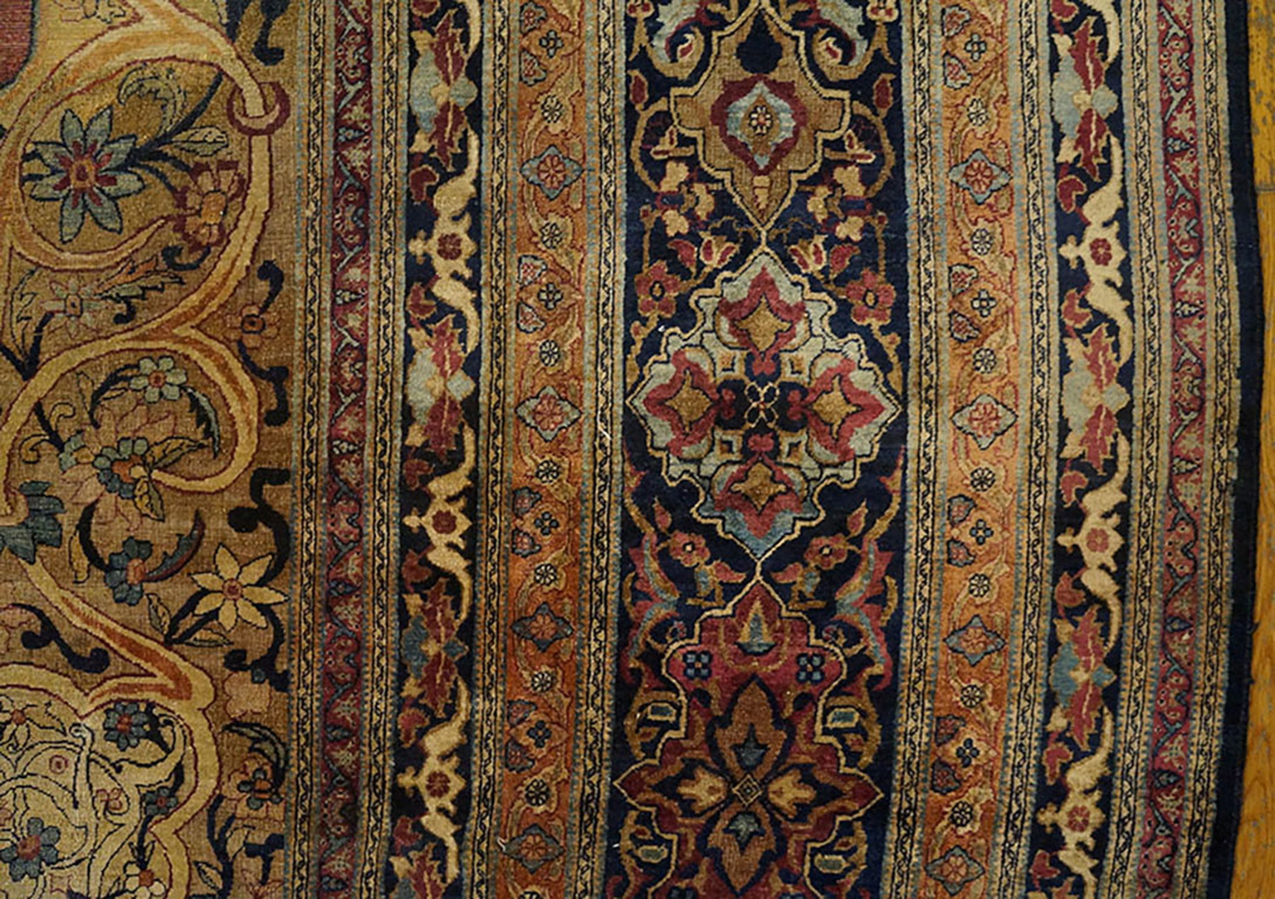The overall composition is a testament to classical Persian design principles, balancing intricate detail with stately symmetry. The field is densely populated with stylized palmettes, vines, and blossoms, creating a lush garden effect characteristic of the finest floral rugs produced in the region. Note the subtle, finely drawn cartouches integrated into the border, a hallmark of master weaver workshops.