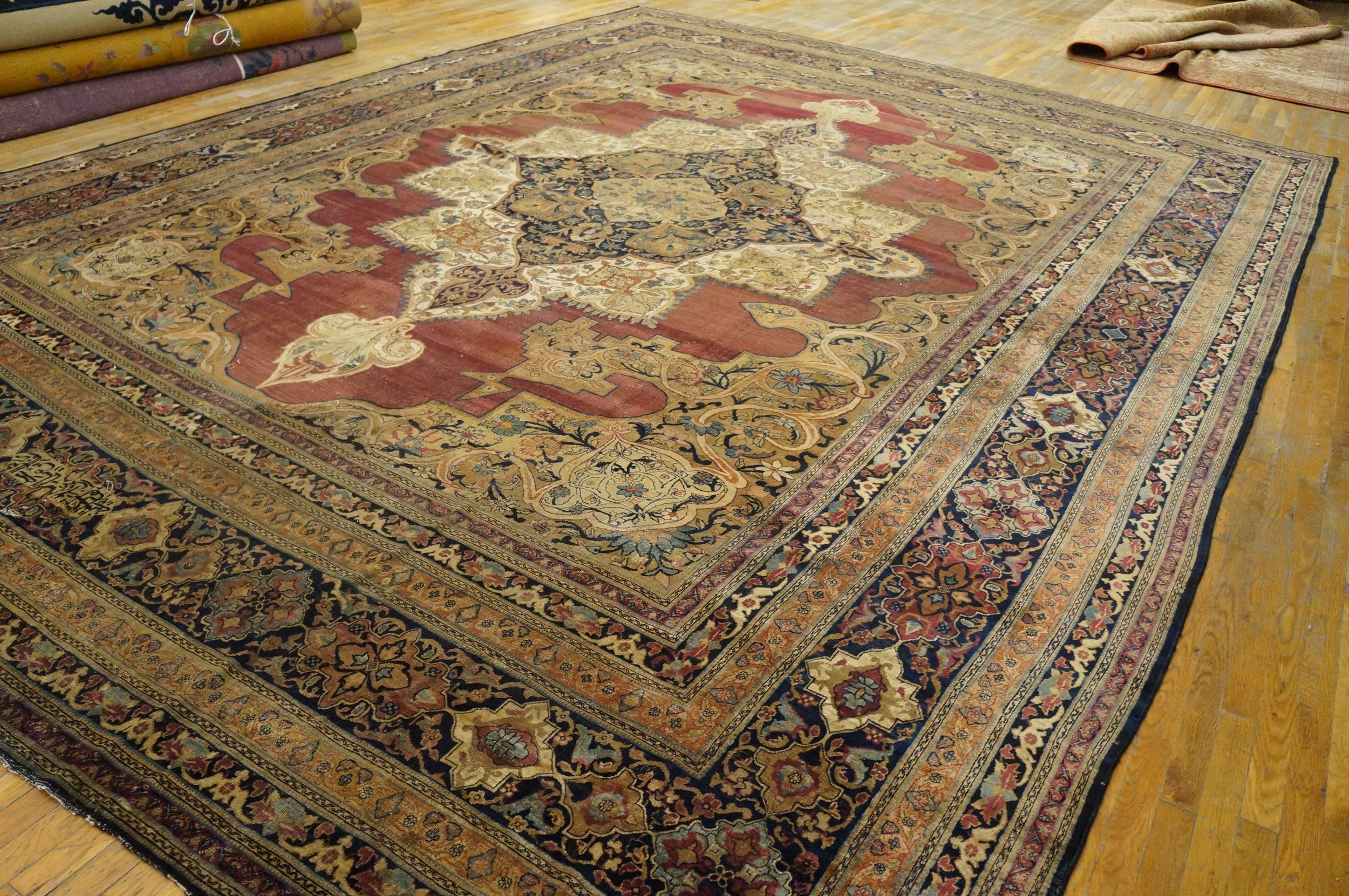 Given its impressive dimensions, this piece is classified among the large oversized big rugs, making it an ideal anchor for a grand reception room or formal dining area. Its excellent condition and historical provenance confirm its status as a significant, investment-grade piece within the canon of antique rugs.