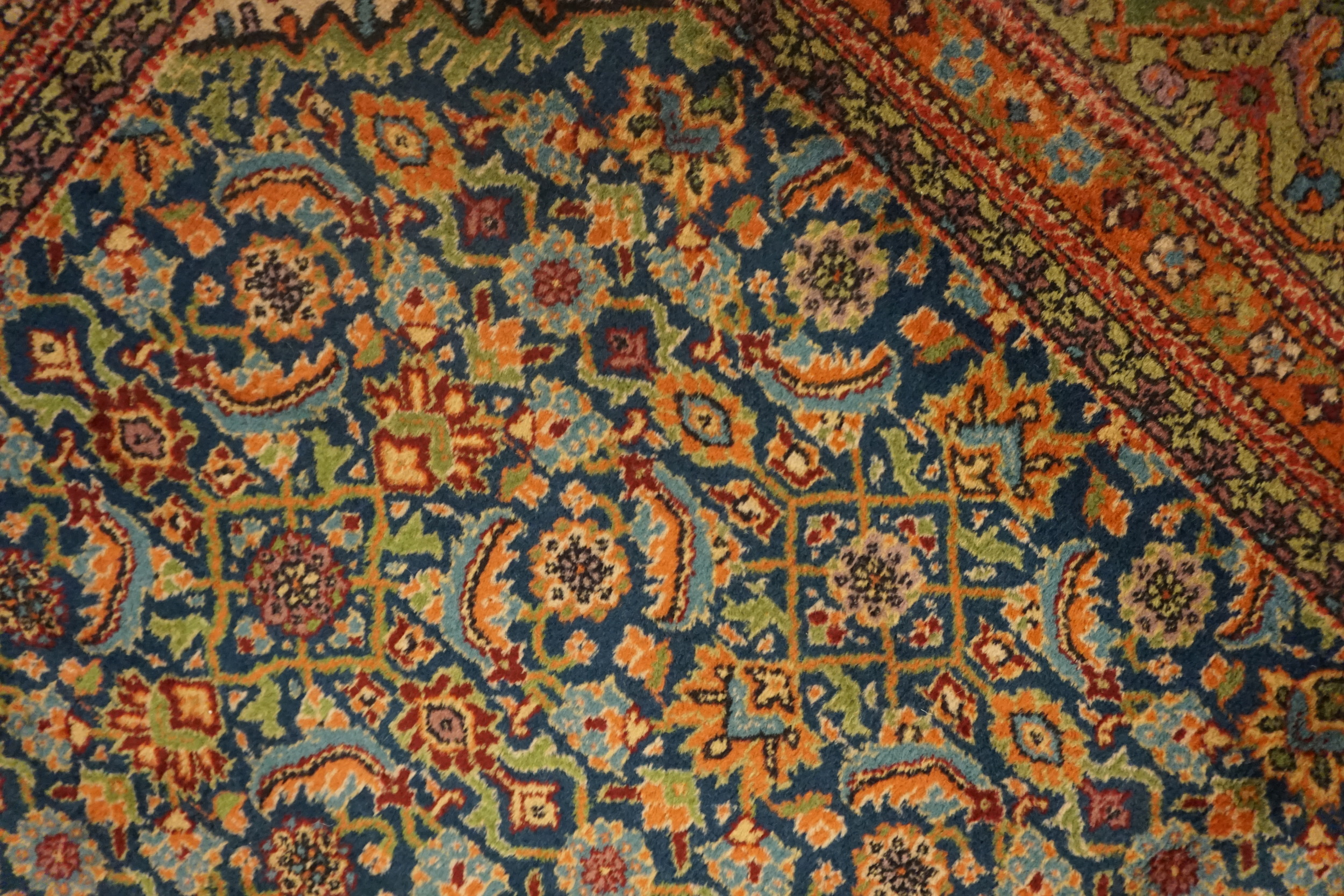 The dense, repeating field pattern utilizes a sophisticated palette centered on deep indigo and slate, establishing it firmly within the category of blue color rugs. Secondary hues of rust, olive, and soft gold are meticulously incorporated, lending depth and complexity to the all-over design. The finely spun wool pile retains a beautiful, subtle sheen that speaks directly to its quality and age.