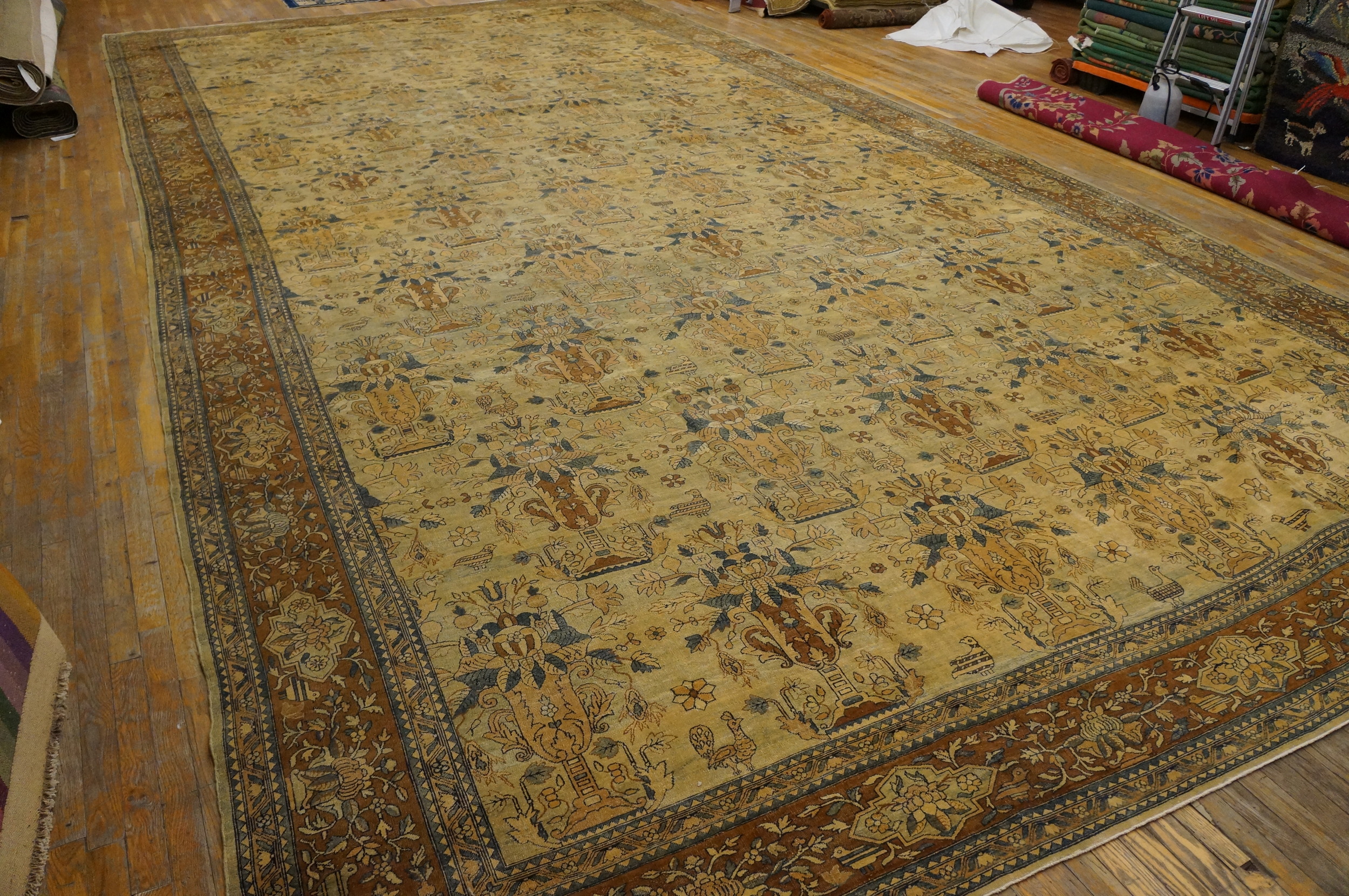Given its impressive dimensions, this piece functions as a monumental statement, perfectly suited for grand interiors requiring a large oversized rug. The delicate, all-over pattern ensures that despite its scale, the rug maintains an elegant visual flow, making it a highly desirable example among all available antique rugs of the period.