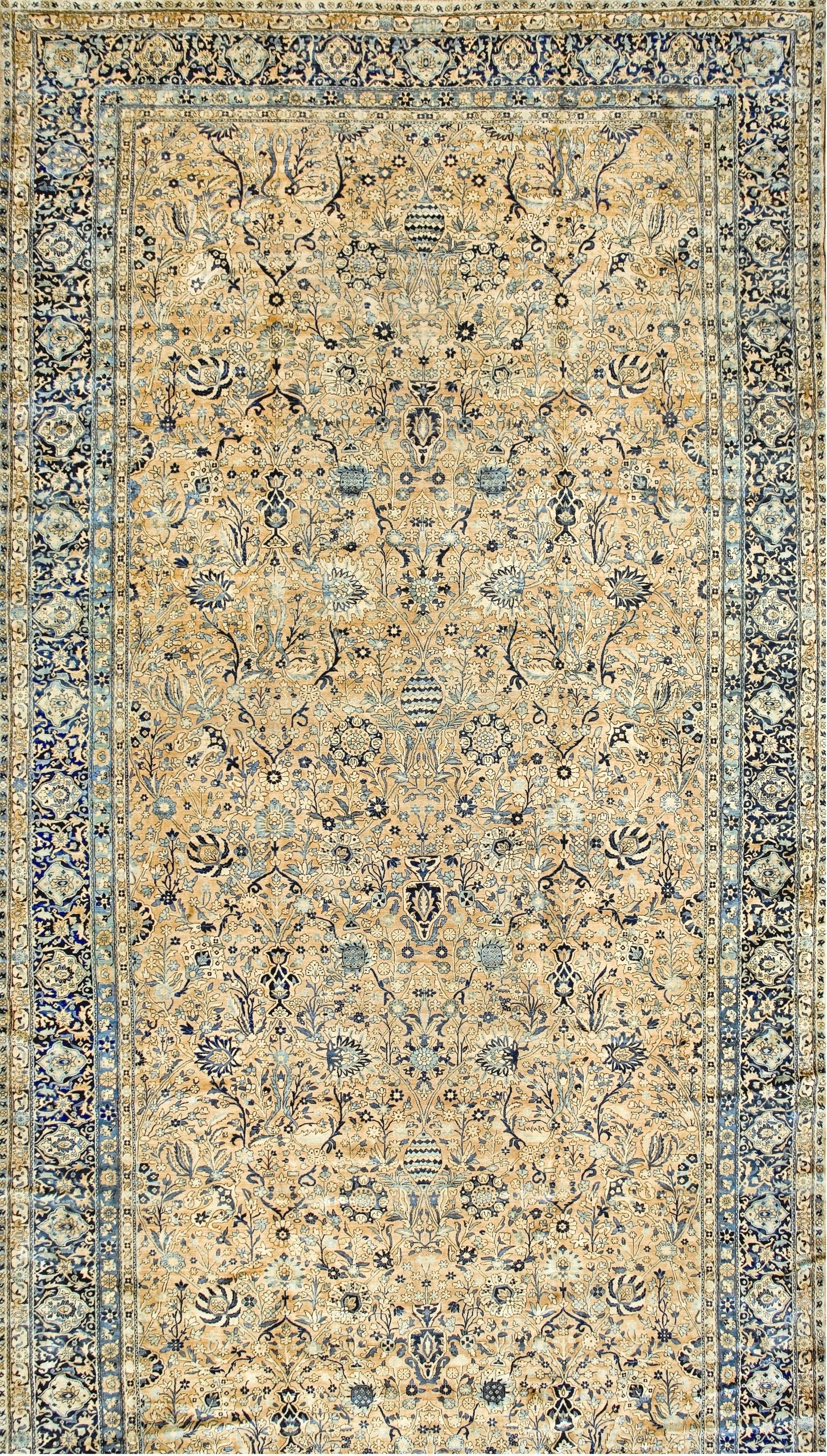 This fine antique Persian Kerman carpet, distinguished by its monumental scale and luminous warm cream field, is a superlative example of the “Vase” design tradition that flourished in South-Central Iran during the nineteenth-century revival of Safavid artistry. Kerman has long been celebrated as the cradle of Persian floral sophistication, a reputation bolstered by the region’s unique geographical isolation and its access to exceptionally soft, high-altitude wool known as kork. Unlike the tribal weaves of the north, antique Persian carpets from Kerman were designed by master “ustads” (designers) who translated the intricate beauty of Persian miniature paintings into textile form. This specific piece features an overflowing floral vase motif, an ancient symbolic representation of the “Tree of Life” and the eternal abundance of the celestial garden—a theme deeply embedded in the poetic and spiritual fabric of Persian culture.
