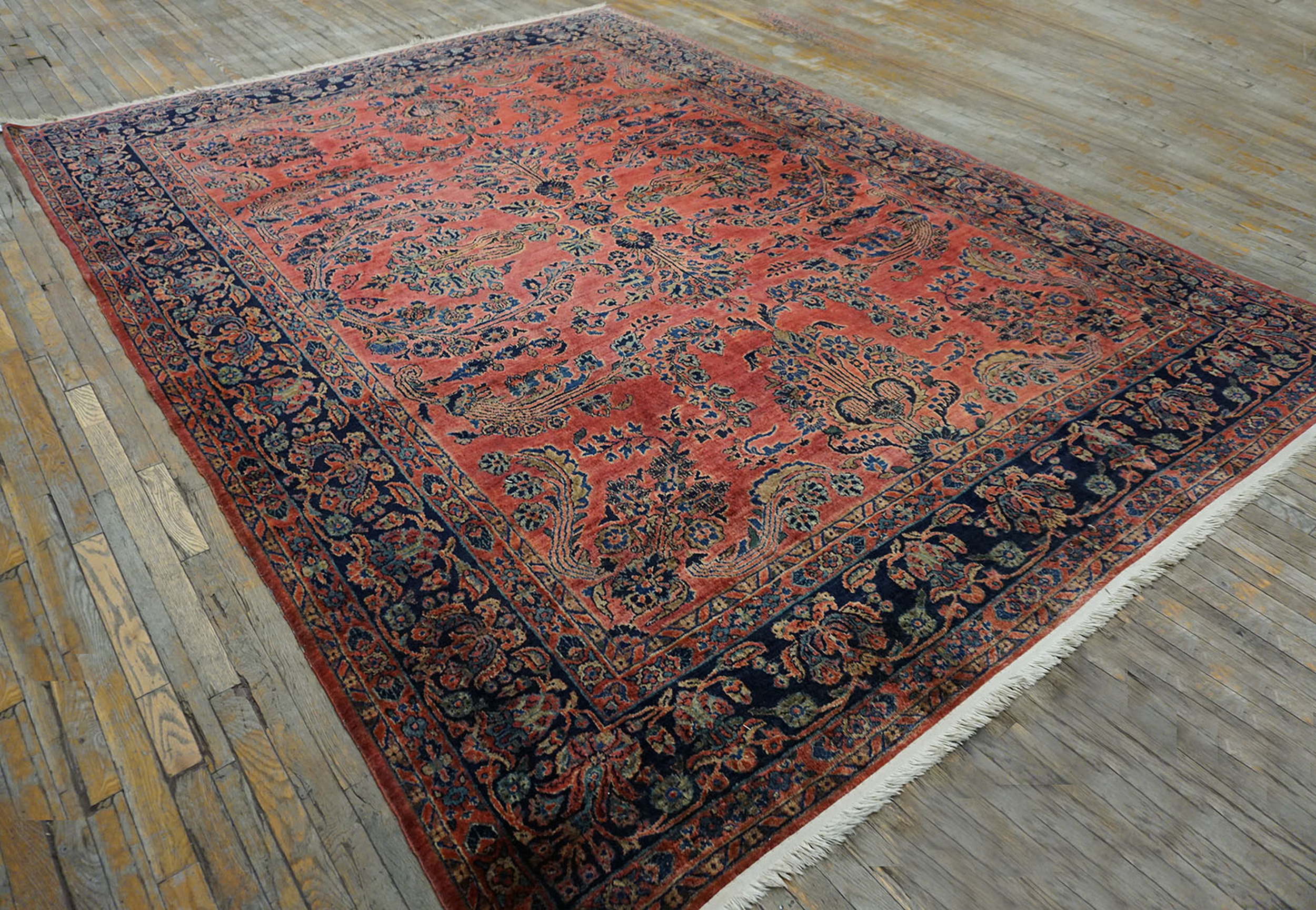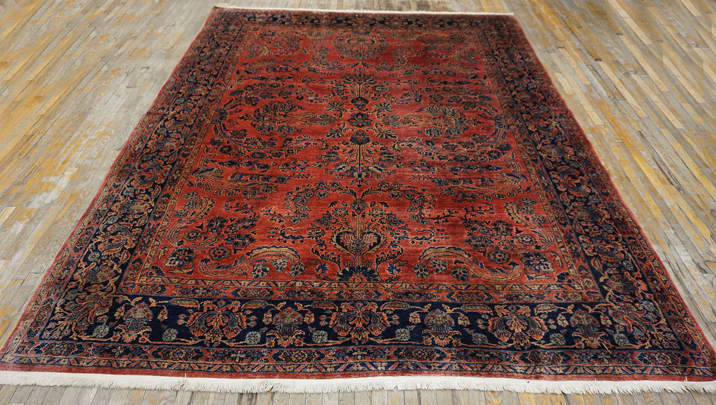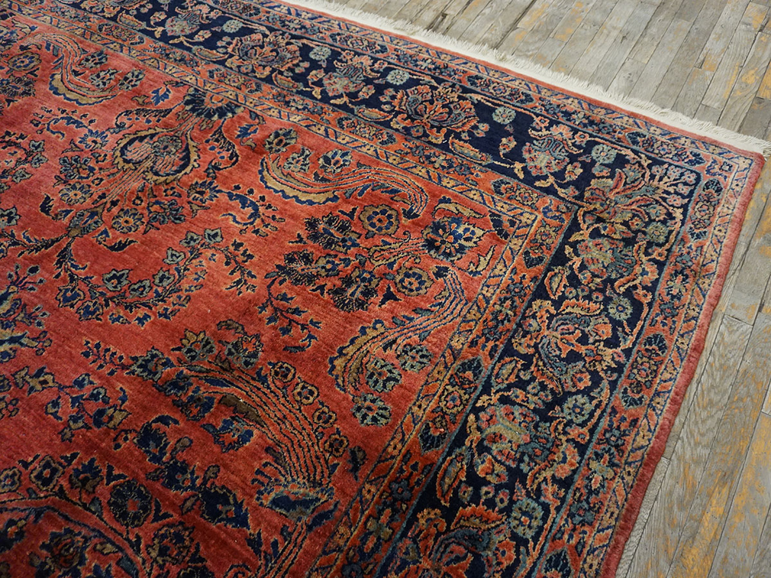 Antique Sarouk Room Size Wool Rug, Country of Origin: Iran / Persia, Circa Date: 1920s. This magnificent example of early 20th-century weaving represents the pinnacle of the sarouk style, renowned for its dense construction and sophisticated use of color, characteristic of the Arak region.