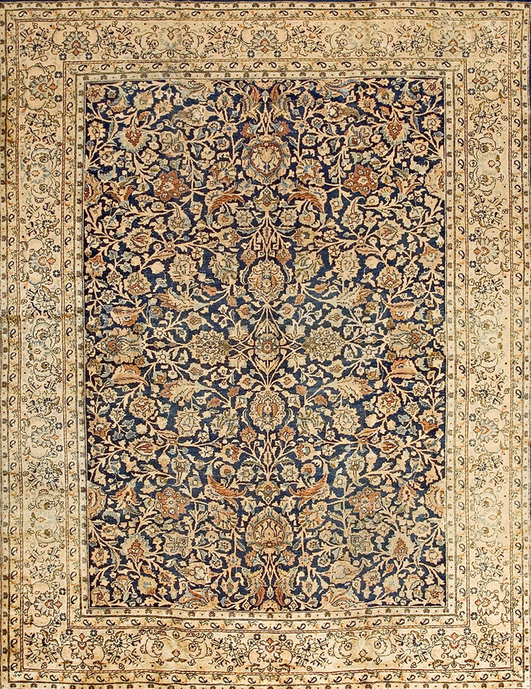 The primary field is dominated by a rich, saturated indigo, providing a dramatic backdrop for the complex botanical motifs. This use of deep, resonant blue color rugs is characteristic of the region’s masterful dyeing techniques, beautifully contrasted by the soft ivory and subtle accents of terracotta and pale gold.