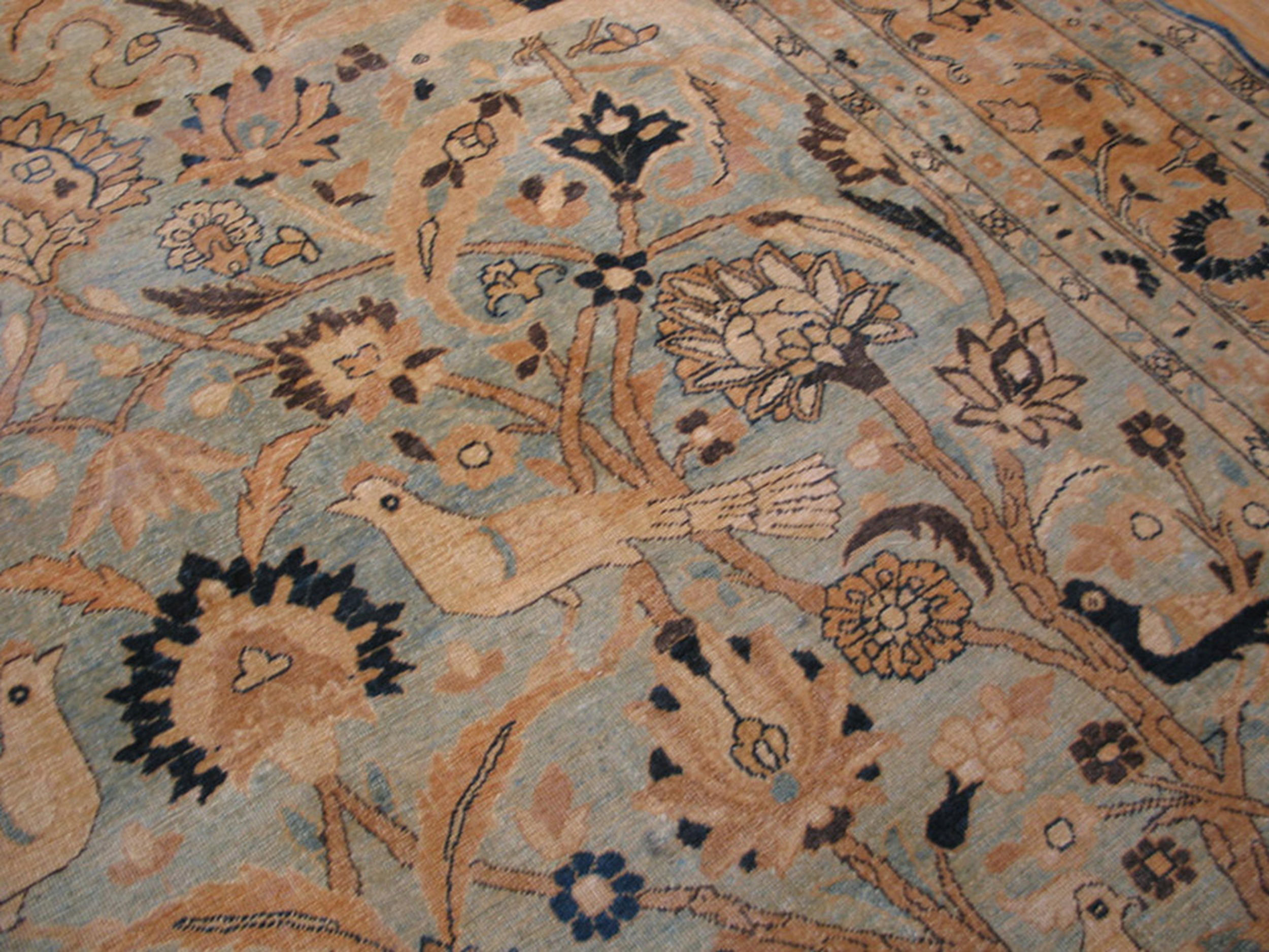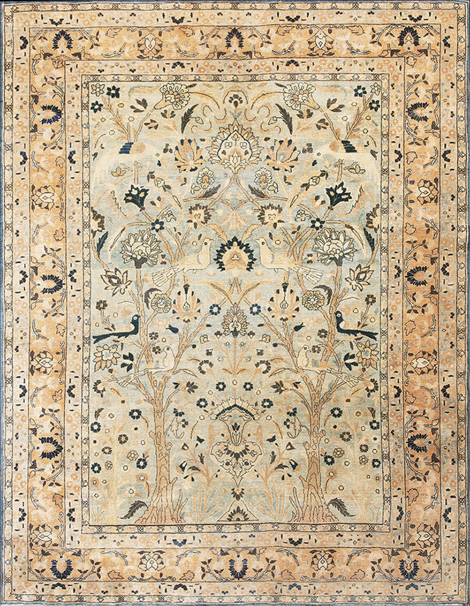 The primary pattern is a sublime interpretation of the Tree of Life motif, featuring stylized cypress trees, blossoming flowers, and pairs of elegant birds. While the design is highly centralized, the dense arrangement of flora and fauna across the entire surface creates an effective allover design that avoids heavy negative space, characteristic of the finest Moud artistry.