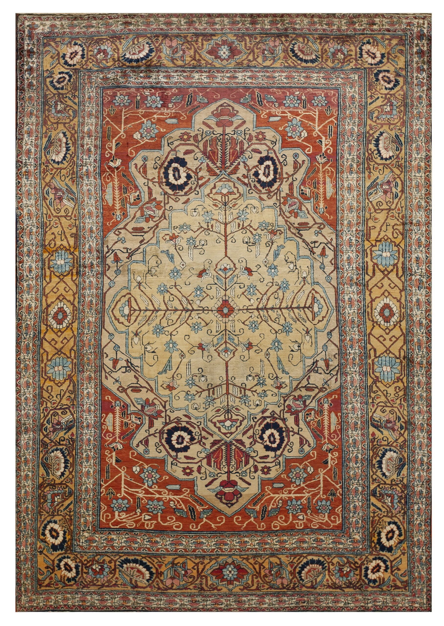 Antique Heriz – Silk Persian Medallion Knotted Rug, Circa Date: 1850s. This exquisite piece is a testament to 19th-century Persian weaving mastery. The use of silk in this Heriz medallion design elevates the traditional geometric structure, lending a remarkable sheen and unparalleled detail to the knotting, positioning it among the finest antique rugs of the period.