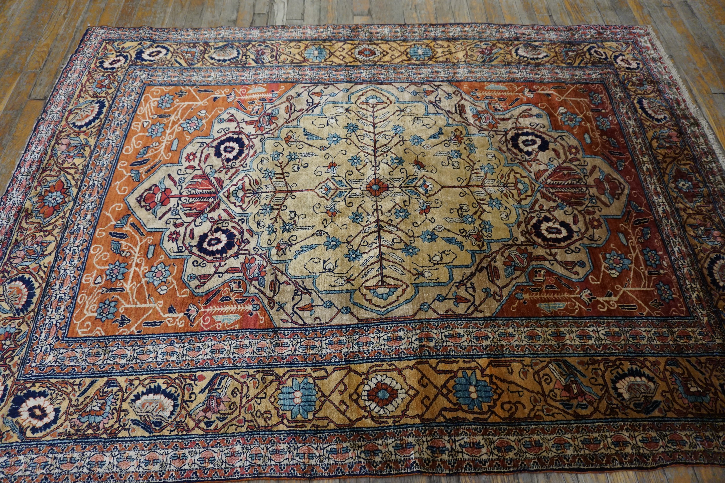 Given its age and the delicate nature of silk, the preservation of this piece is exceptional. Its refined scale makes it an ideal accent for smaller, intimate spaces, offering a concentrated burst of historical artistry. This rare silk Heriz is perfectly suited as a decorative element or a treasured addition to a collection of small scatter size rugs.