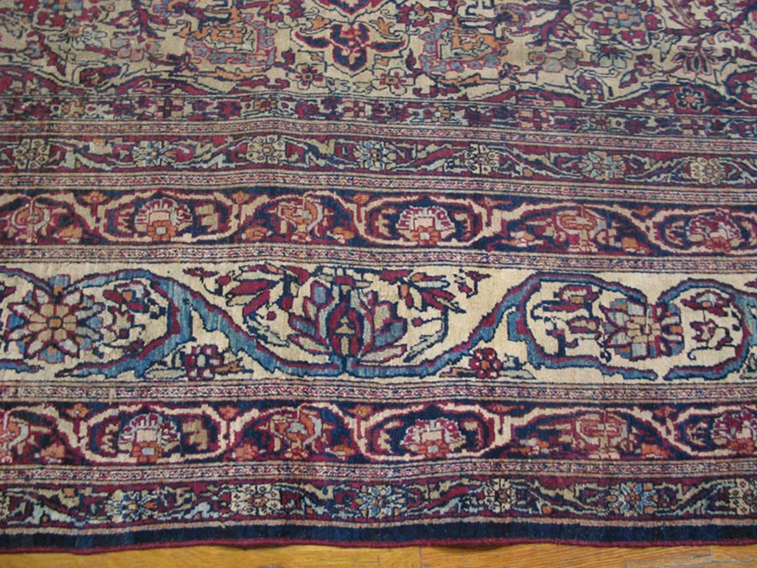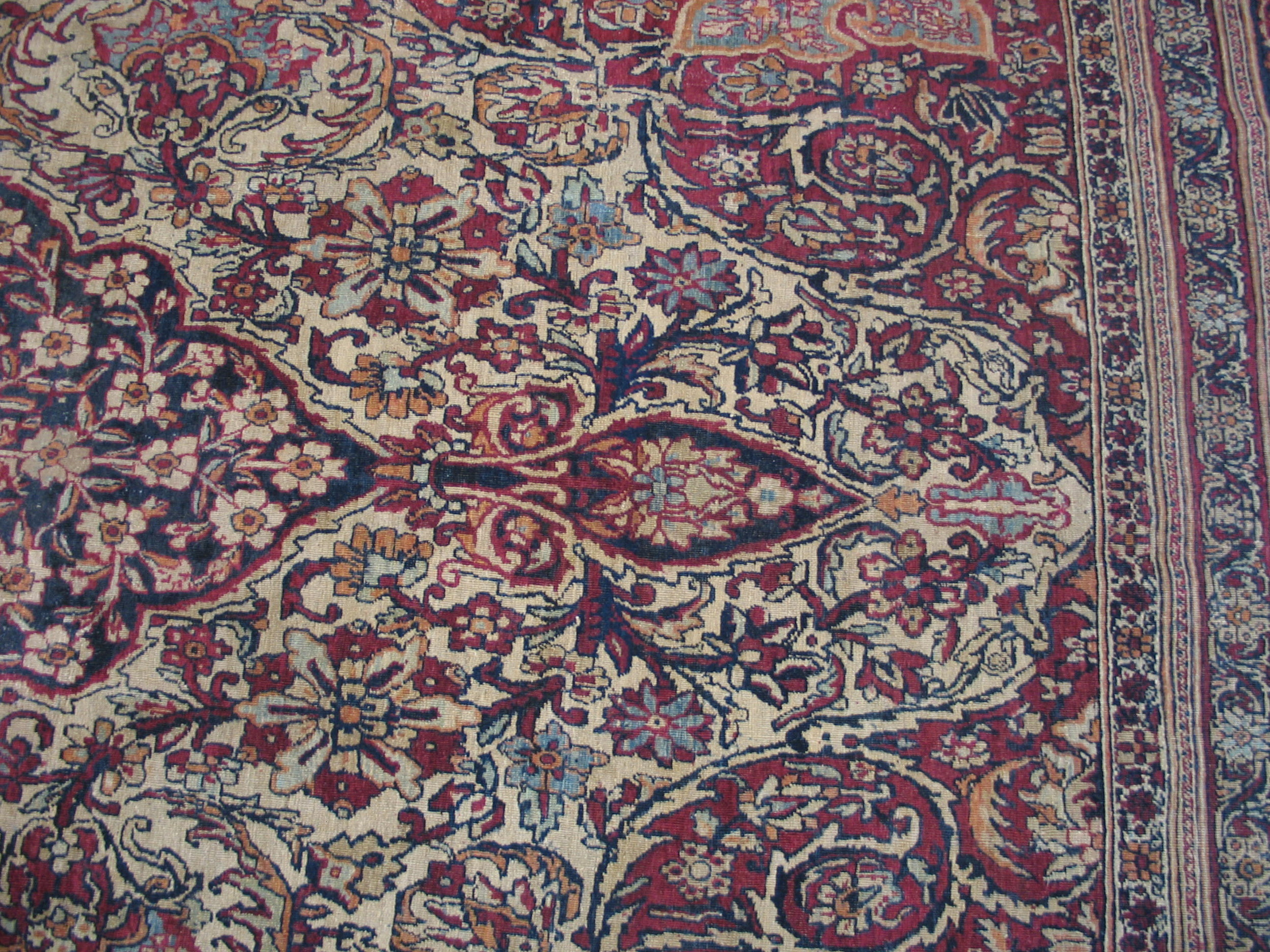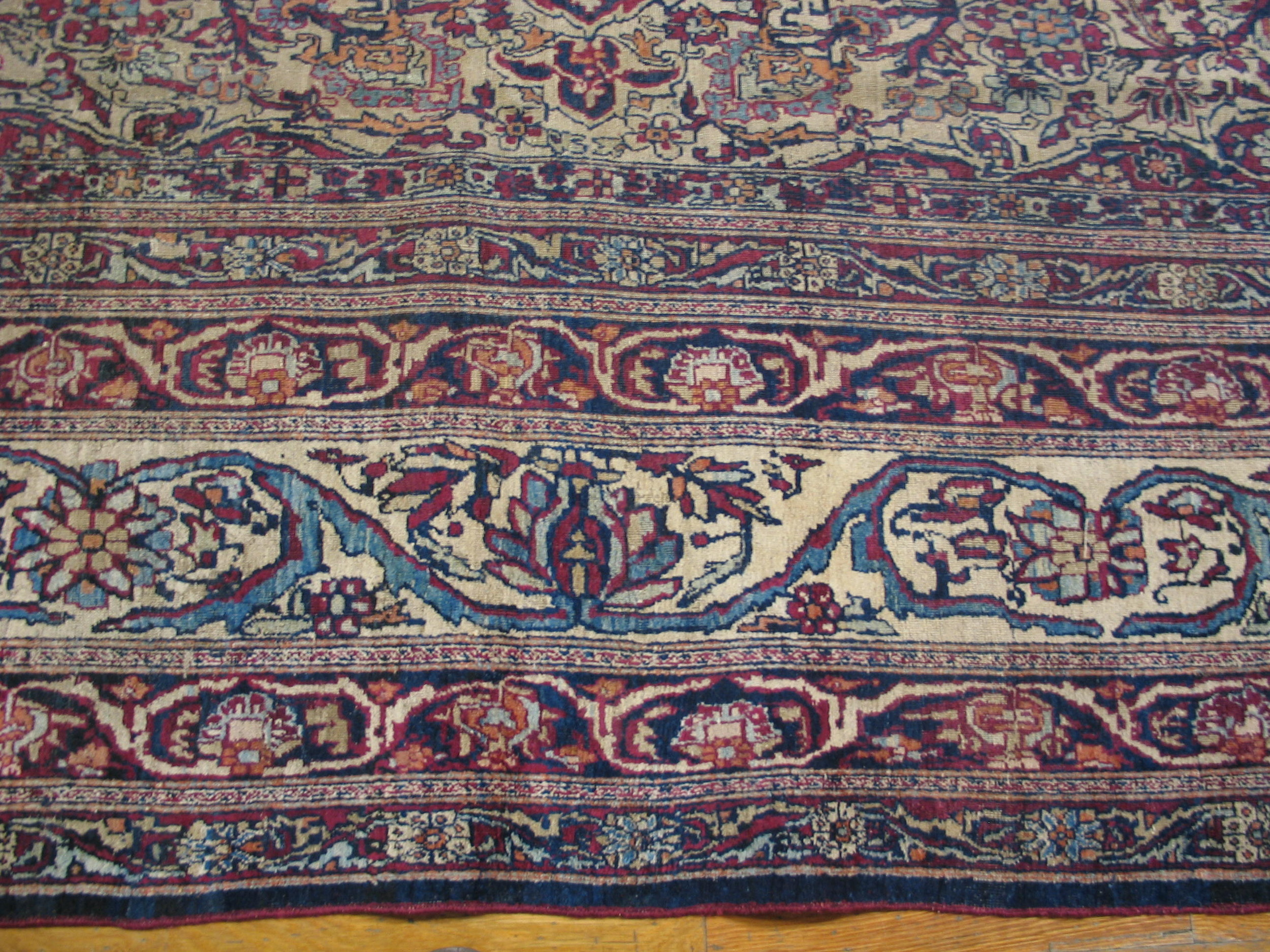 The composition is dominated by a magnificent central medallion, densely populated with delicate floral sprays and boteh motifs. Against the ivory field, deep indigo and rich madder tones create a striking contrast, typical of the finest Lavar production, allowing the complex arabesques to truly flourish across the surface.