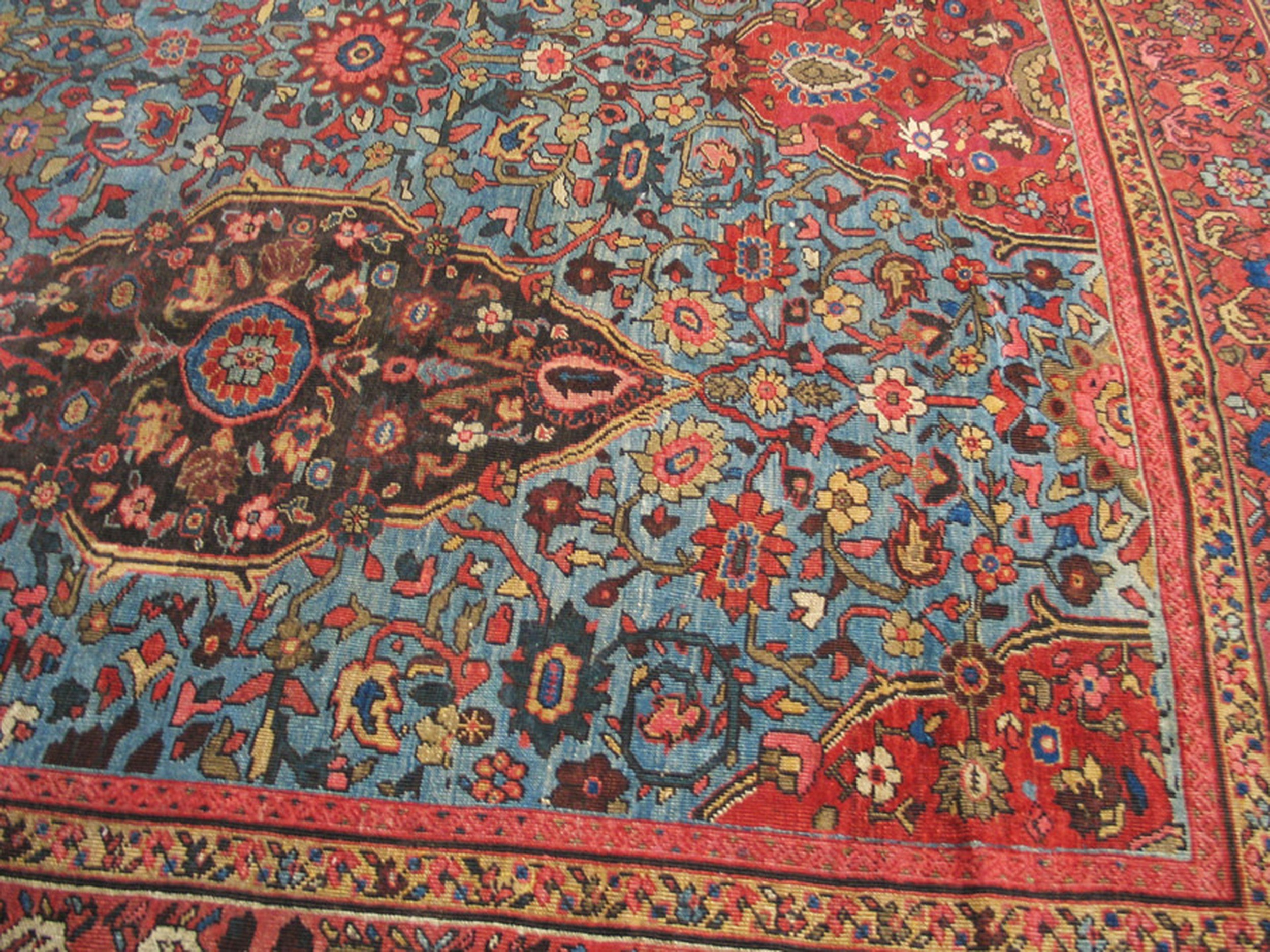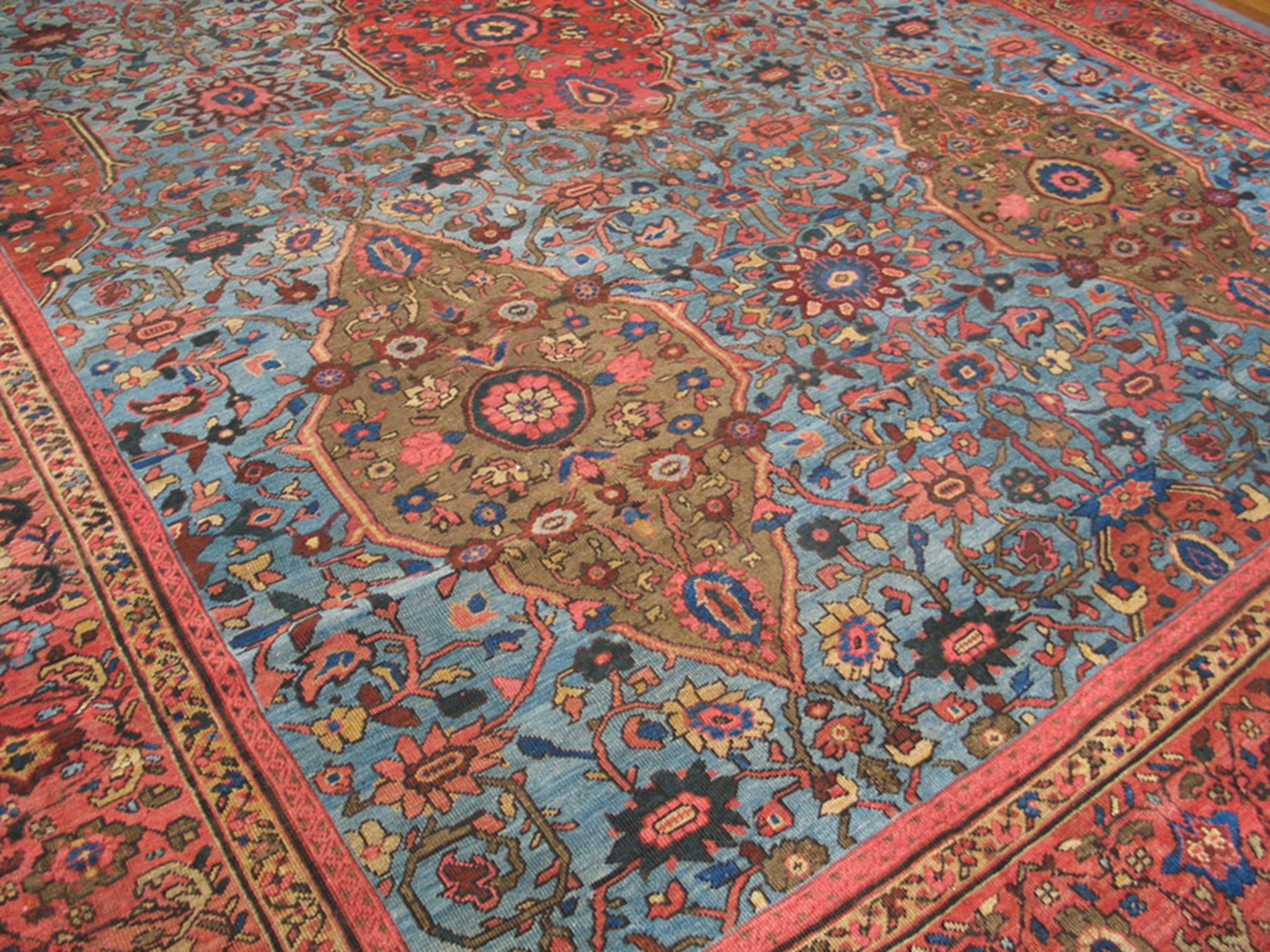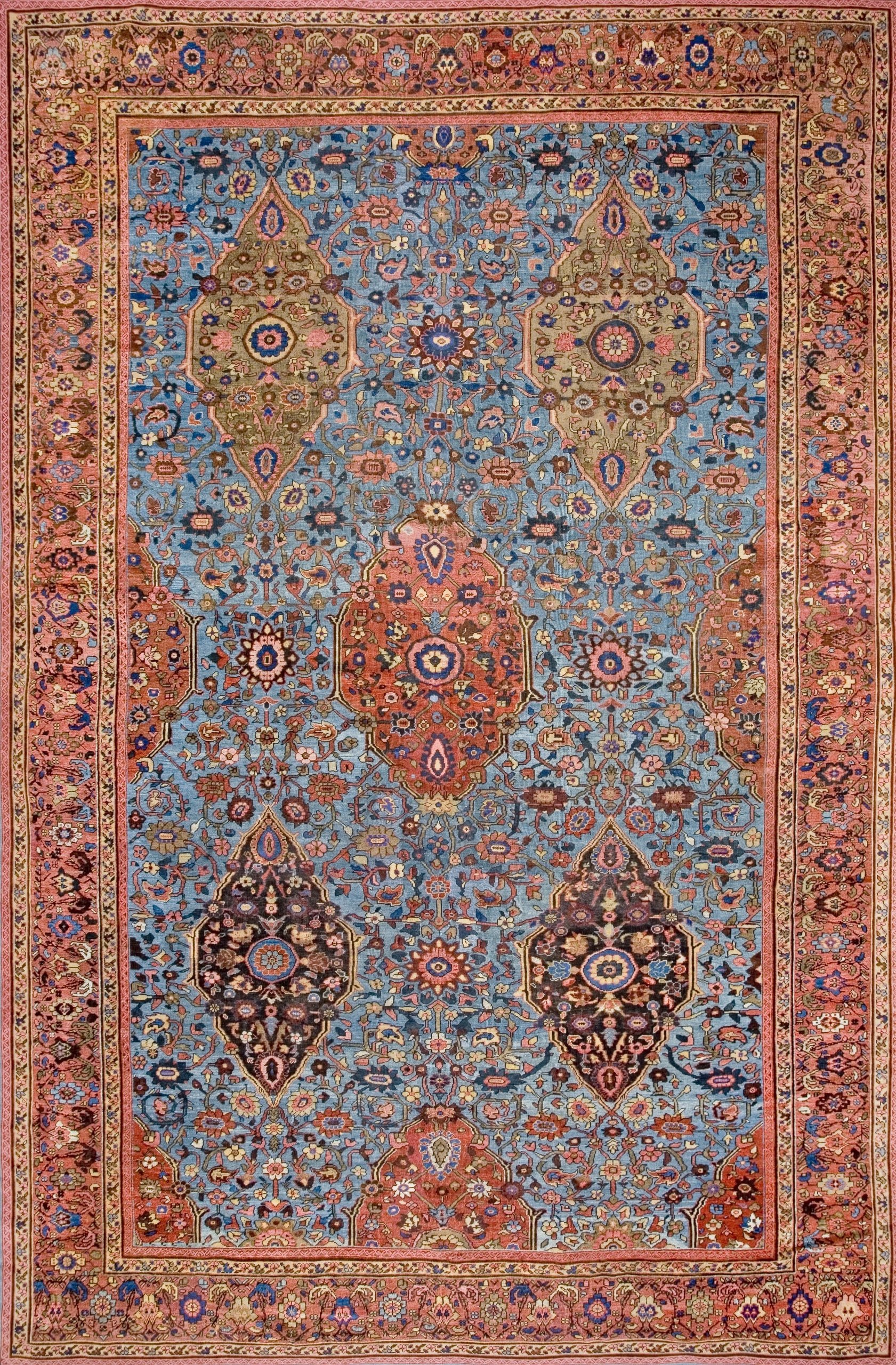 This nineteenth-century Persian Sultanabad carpet is a rare and ethereal example of the “Ziegler” era of weaving, distinguished by its exceptionally fine weave and a breathtaking happy sky-blue field. While the Sultanabad district (modern-day Arak) is traditionally associated with bold, rustic palettes and large-scale tribal motifs, this specific specimen represents the height of the late 19th-century refinement. During this period, the Anglo-Swiss firm Ziegler & Co. revolutionized the local industry by commissioning rugs that blended the rugged, soulful character of Persian village art with a more sophisticated, “breathable” aesthetic tailored for the grand manor houses of Europe. The choice of a “sky blue” ground is a mark of extreme rarity; achieved through a precise and delicate fermentation of indigo, this hue was intended to bring a sense of light and celestial airiness to the often-heavy Victorian interiors of the time.
