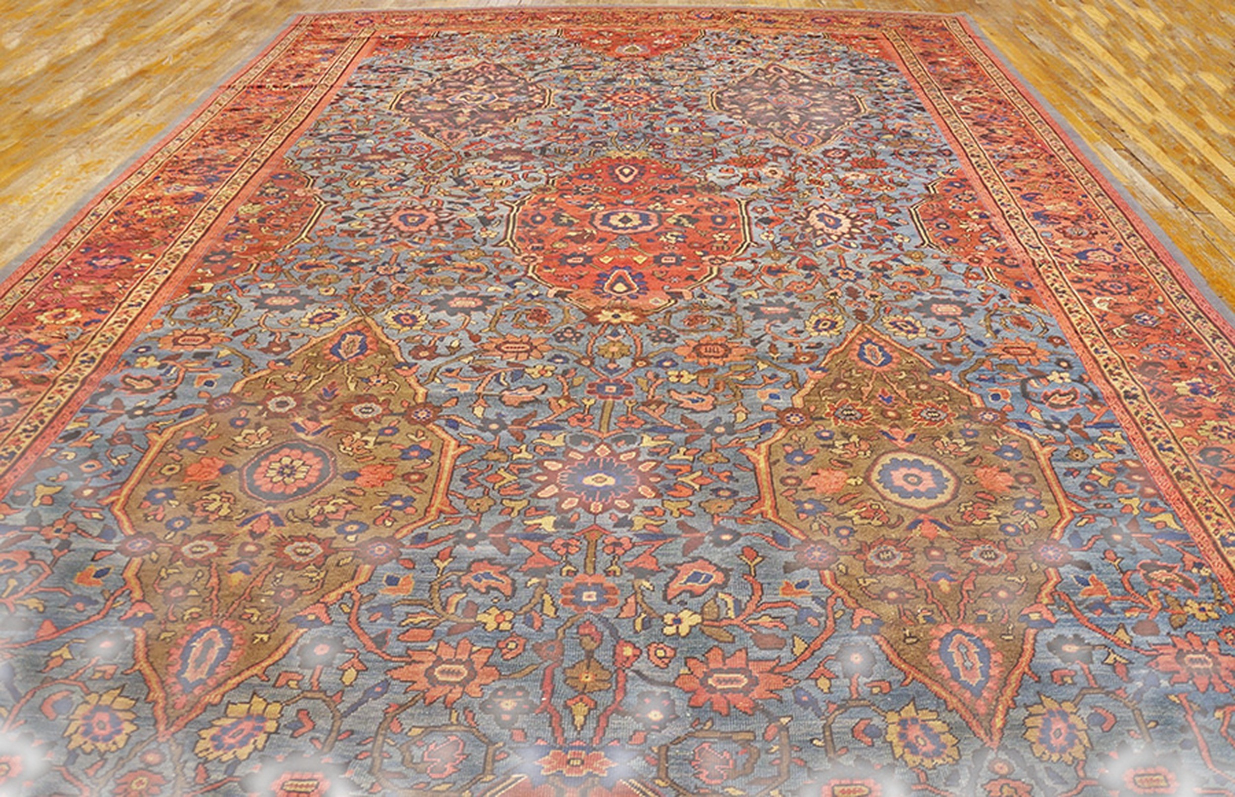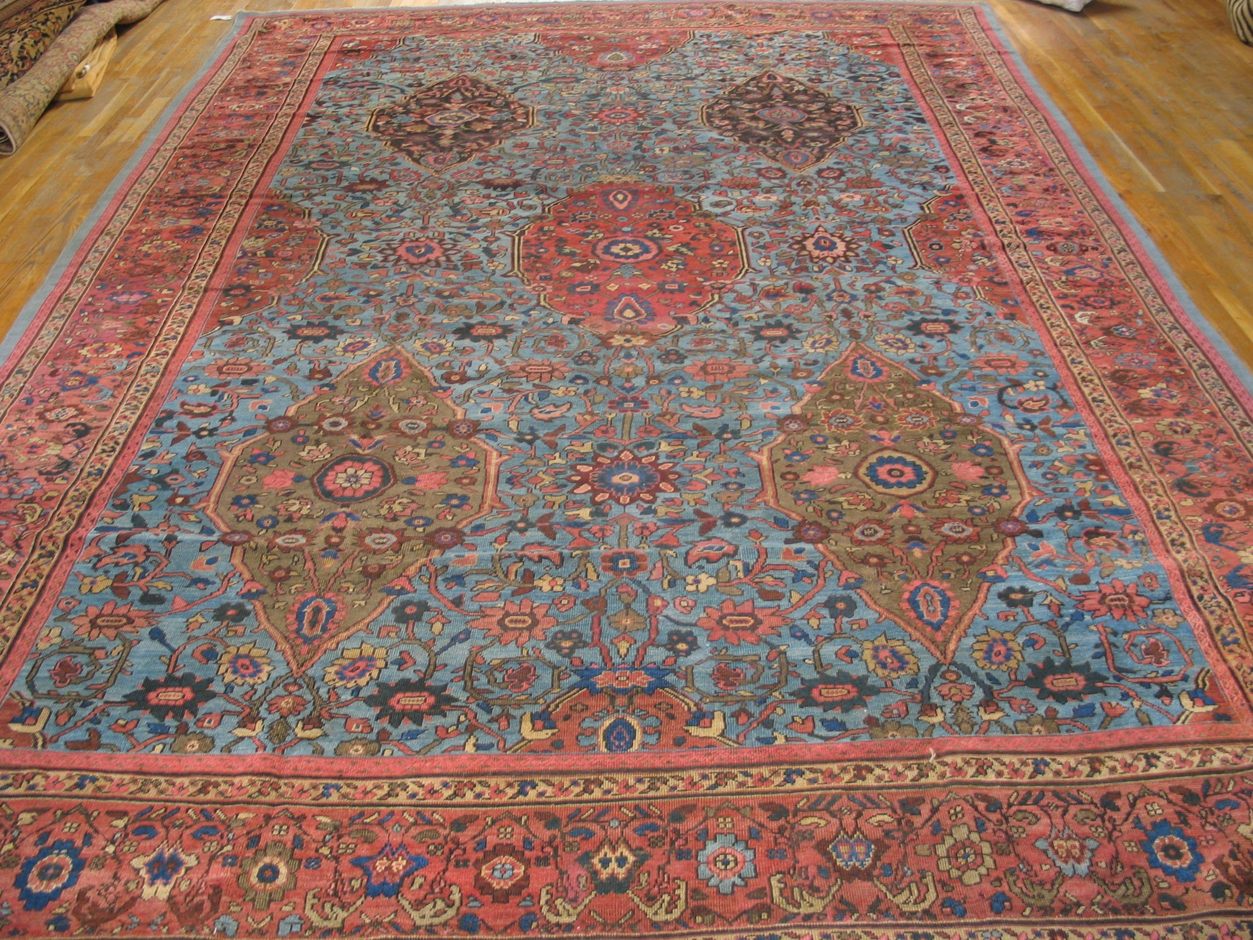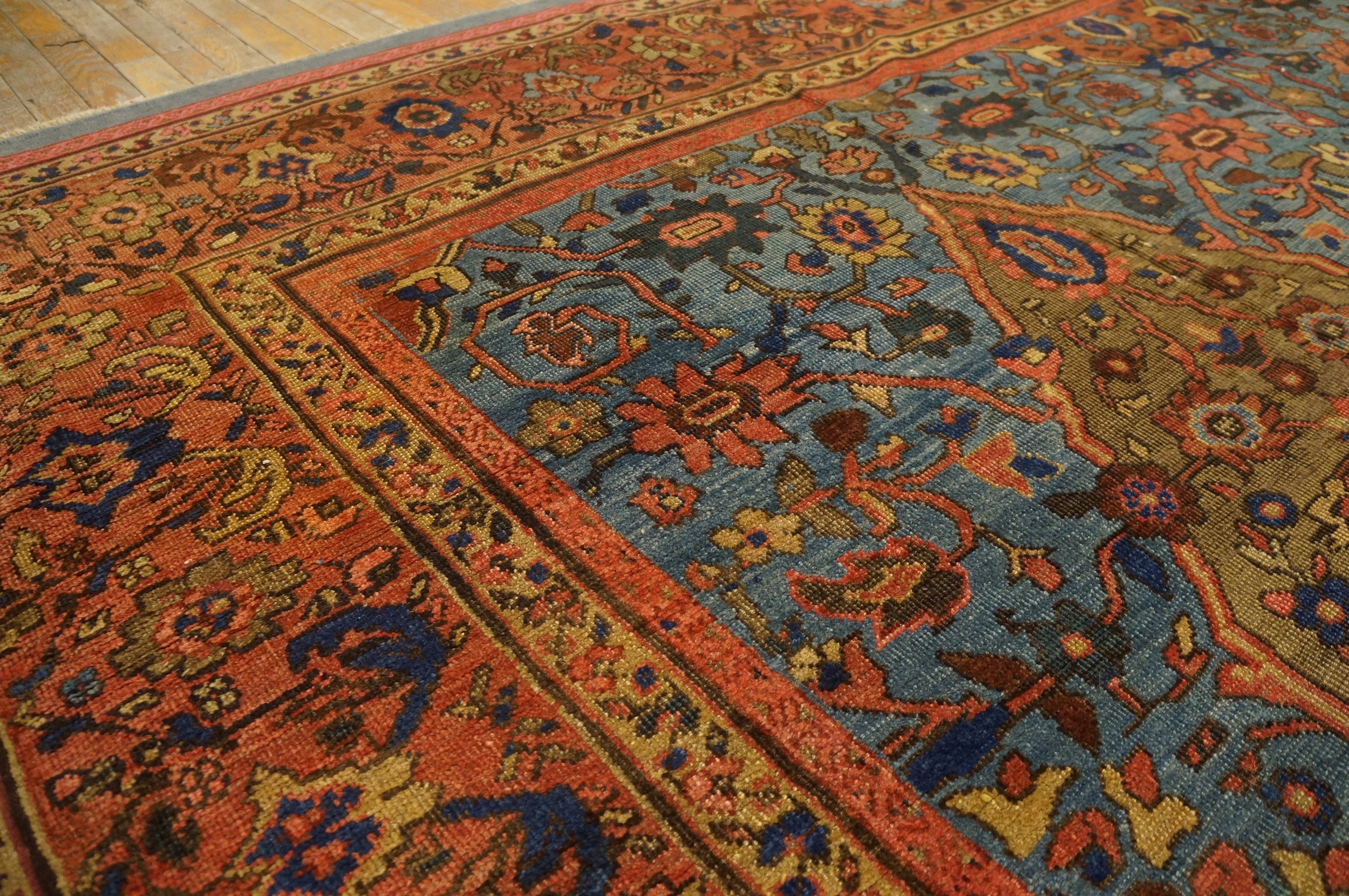 Historically, the antique Persian rugs from Sultanabad, in this specific colorway and level of fineness, were the “architect’s choice” for the most prestigious global commissions, favored for their ability to harmonize with both neoclassical architecture and more minimalist decorative movements. The borders act as a structural frame, utilizing a series of delicate guards and a primary border of repeating floral rosettes that ground the expansive energy of the central field. This carpet is more than a decorative object; it is a historical bridge between the tribal heritage of the Persian plateau and the refined sensibilities of the 19th-century international elite. To possess a fine-weave Sultanabad in this rare celestial blue is to hold a masterpiece of textile diplomacy—a work that represents a perfect synthesis of light, color, and enduring craftsmanship.