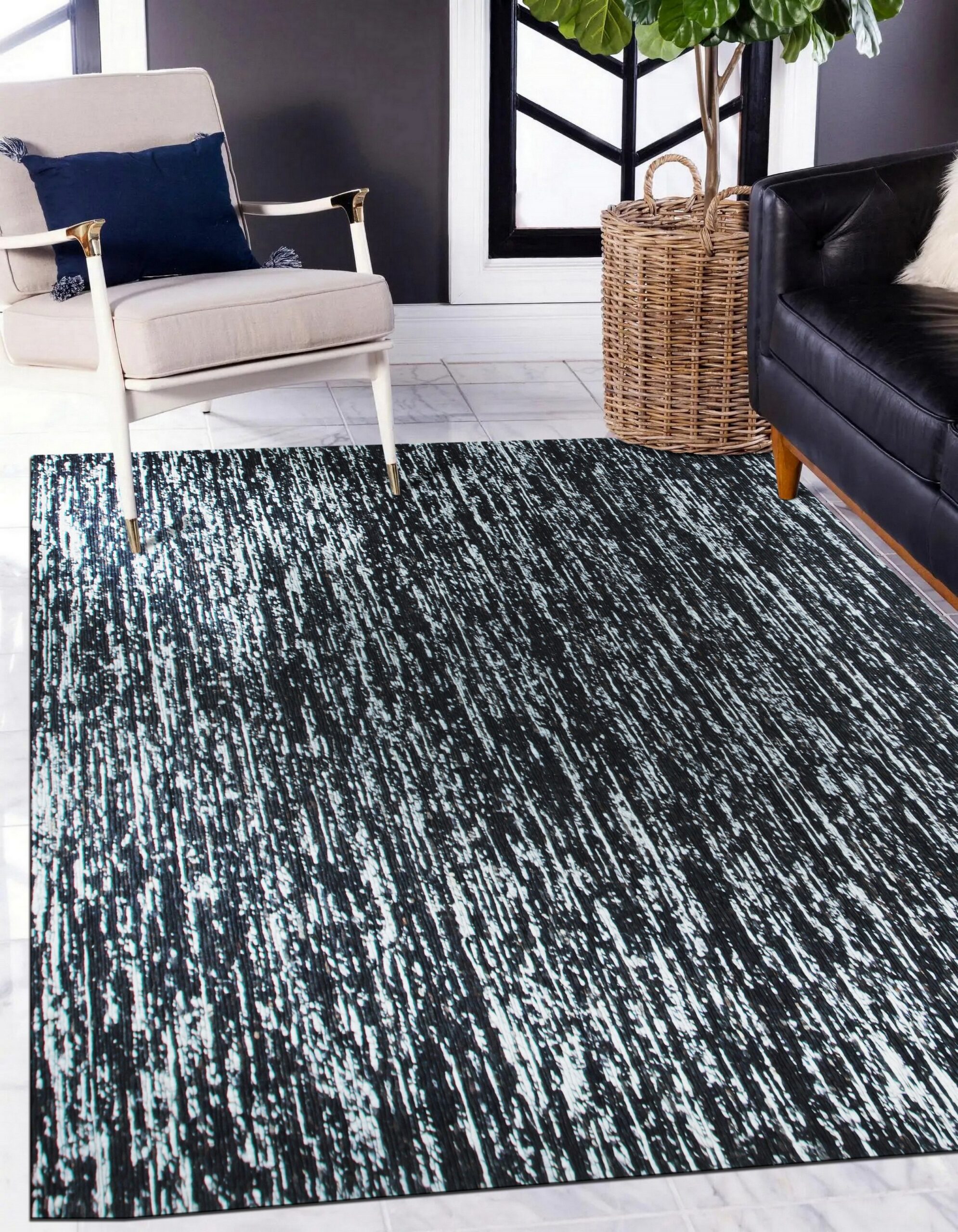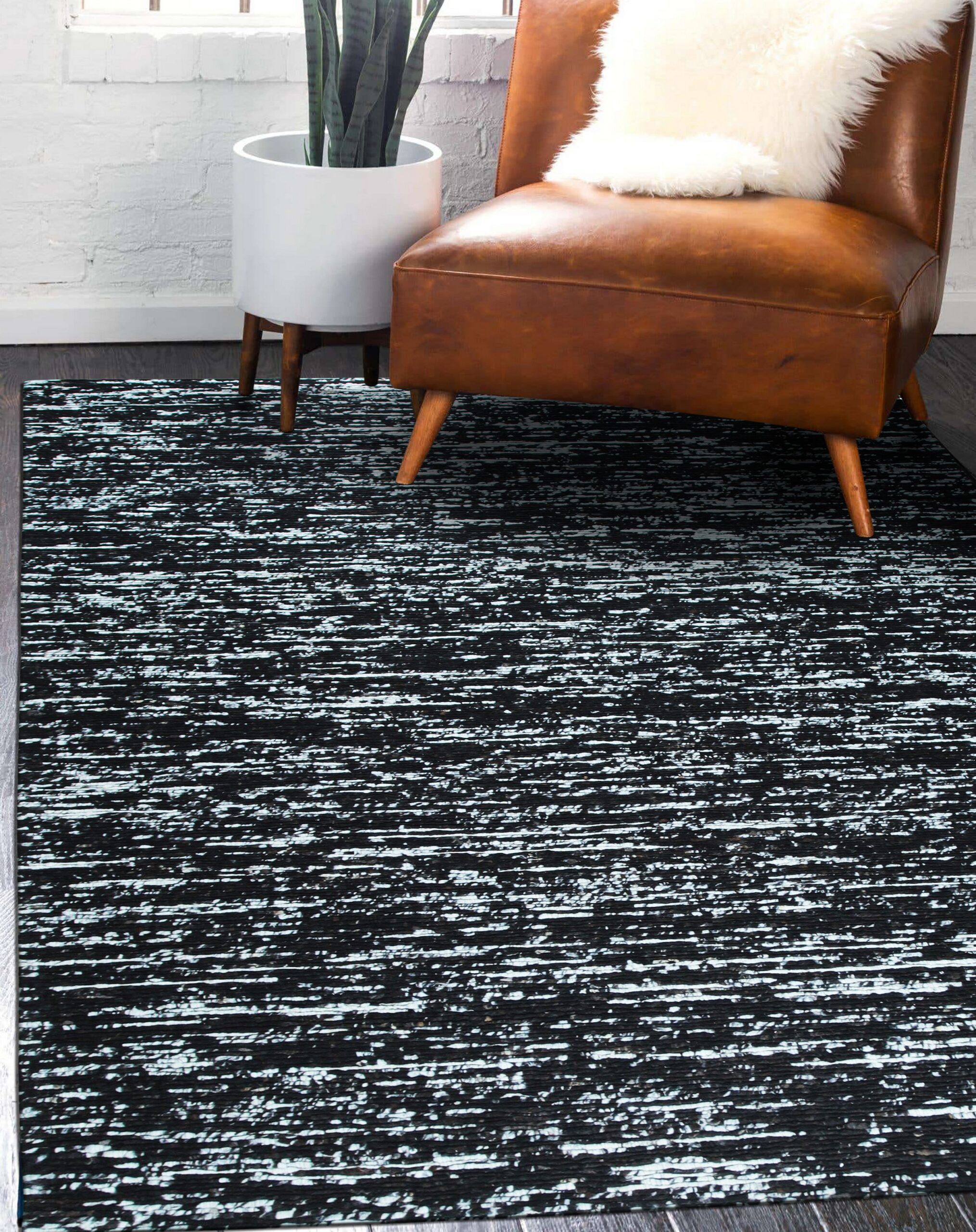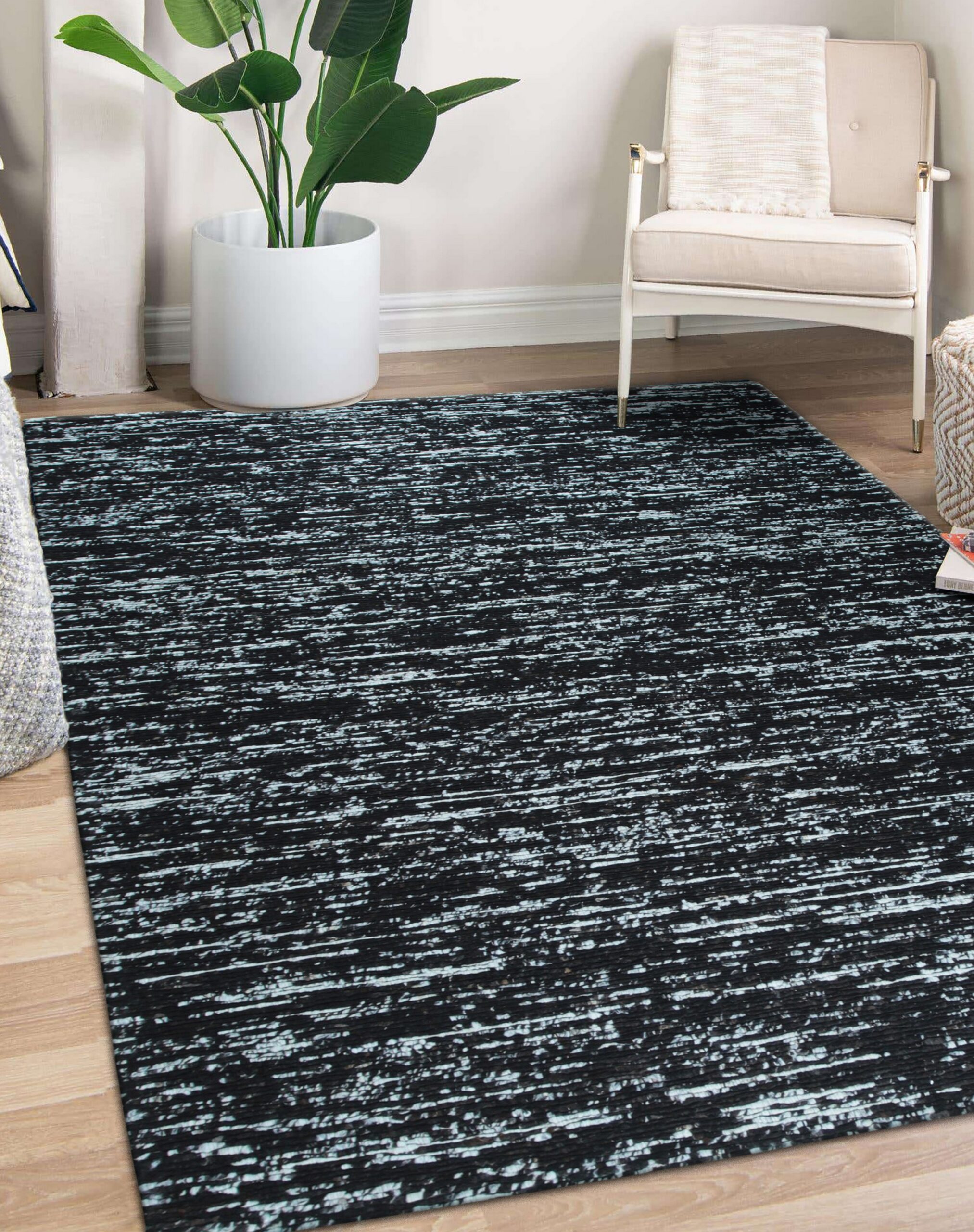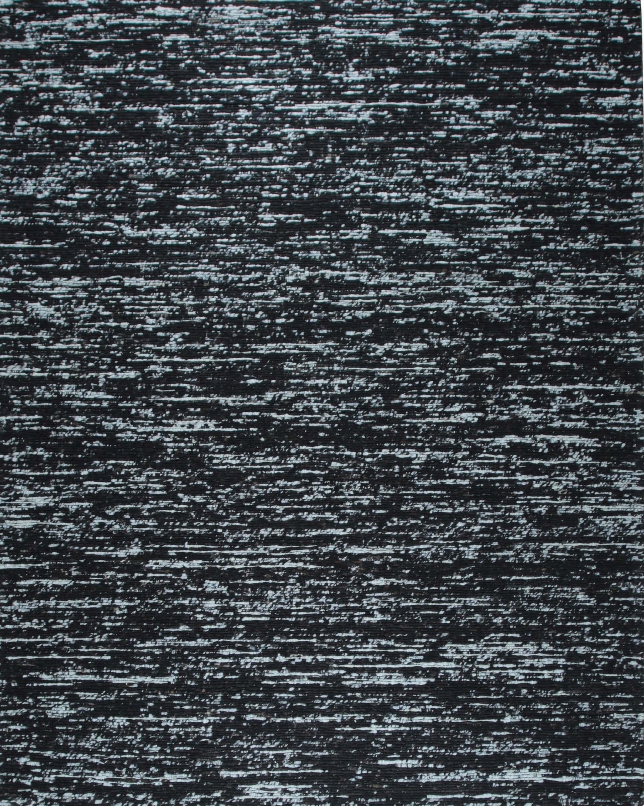 The Fiona rug presents a striking, high-contrast visual field. Its monochromatic palette, dominated by deep black and punctuated by horizontal white striations, creates a dynamic, almost kinetic effect. This distressed appearance makes it an exceptional choice among black color rugs for spaces requiring graphic impact without overwhelming pattern.
