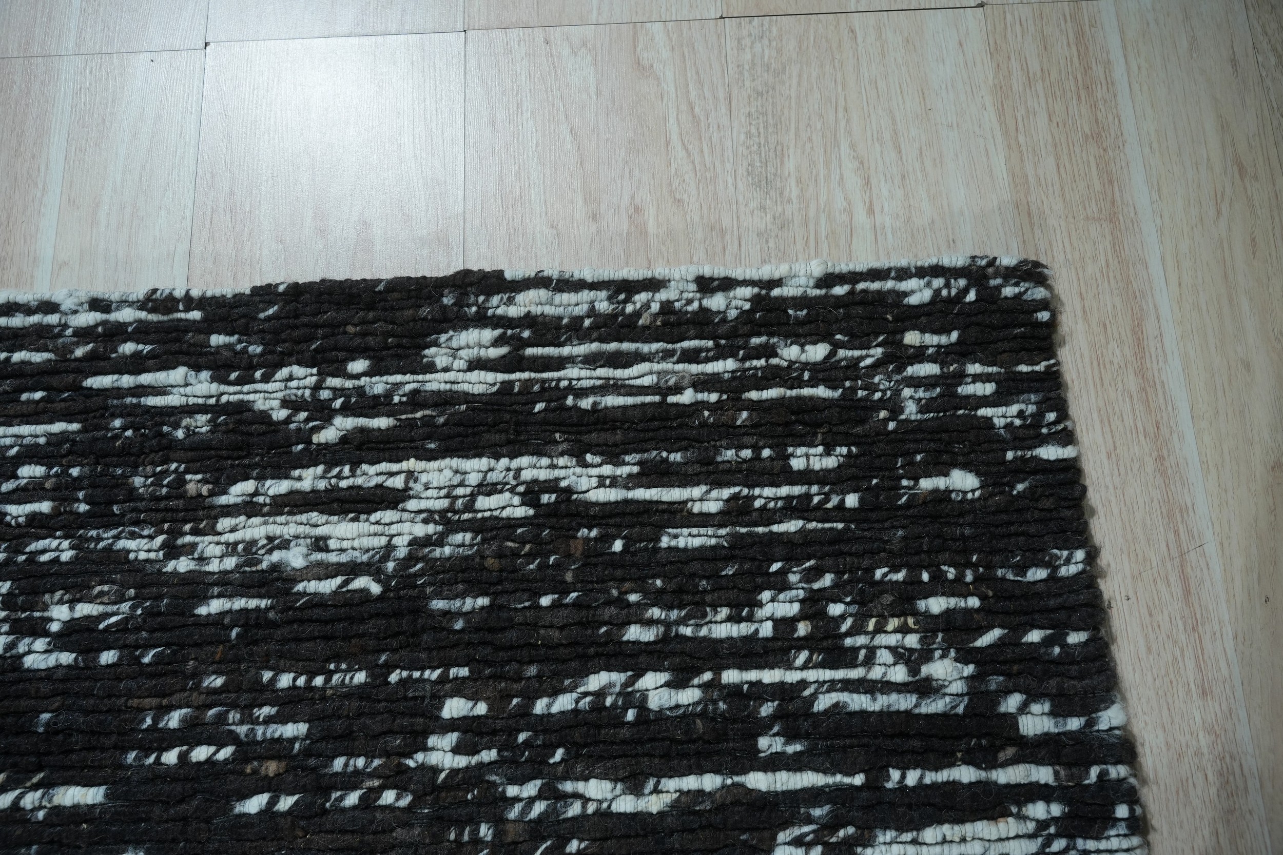 Fiona Rustic Black Flatweave Wool Rug, Country of Origin: India. This contemporary flatweave piece reinterprets traditional texture through a highly modern lens. Woven with robust wool, this rug exemplifies the fine craftsmanship often associated with Indian rugs.