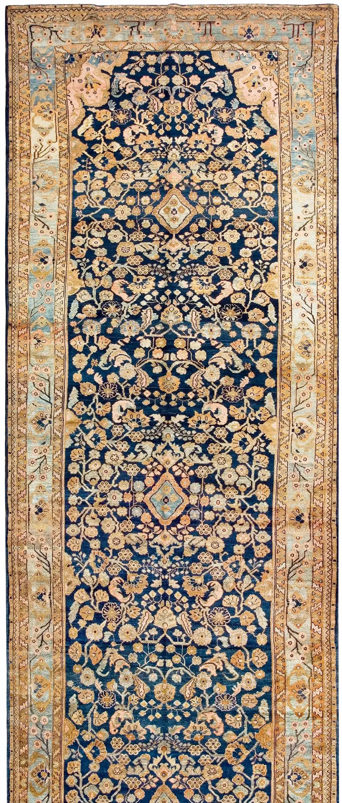 The commanding field of this piece is defined by a saturated, near-midnight indigo, providing a dramatic backdrop for the sprawling, all-over Herati-inspired design. The use of rich saffron and ochre tones creates a luminous contrast, highlighting the intricate vine work. This striking palette makes it a superb example of blue color rugs that can anchor a sophisticated interior space.