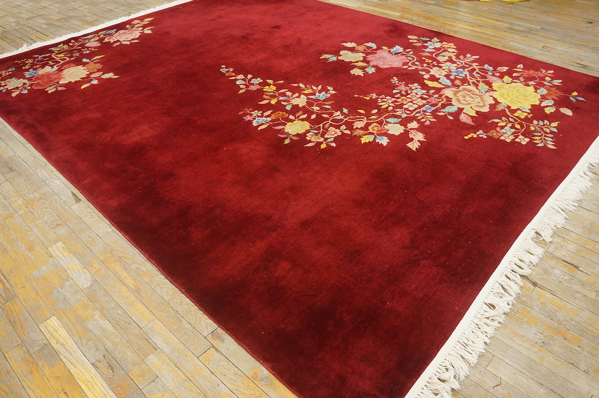 Antique Chinese – Art Deco Chinese Floral Coral 1930s Rug, Circa Date: 1930s. This exceptional example of early 20th-century antique Chinese weaving captures the essence of the Art Deco movement through its bold, asymmetrical design and deep, saturated field.