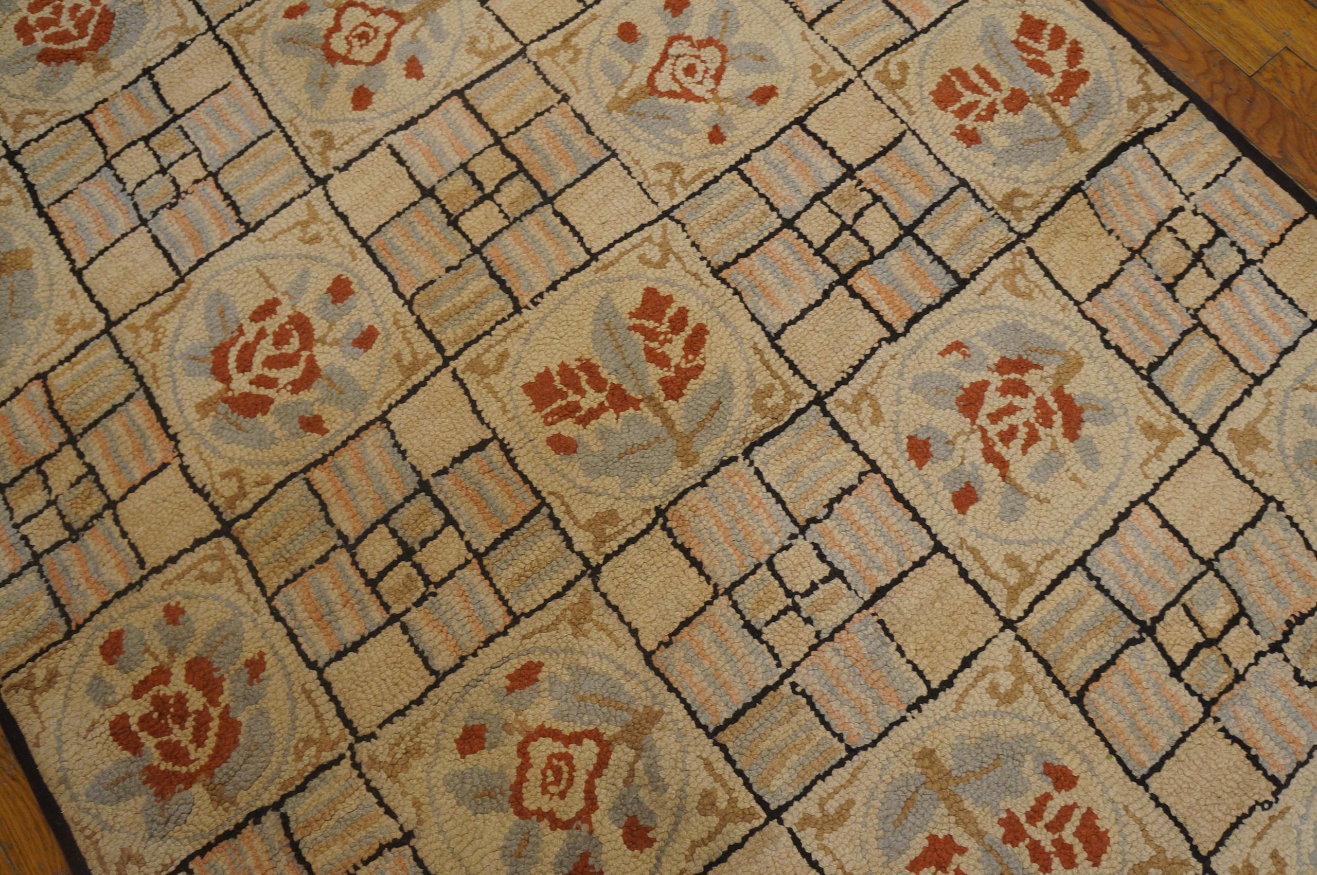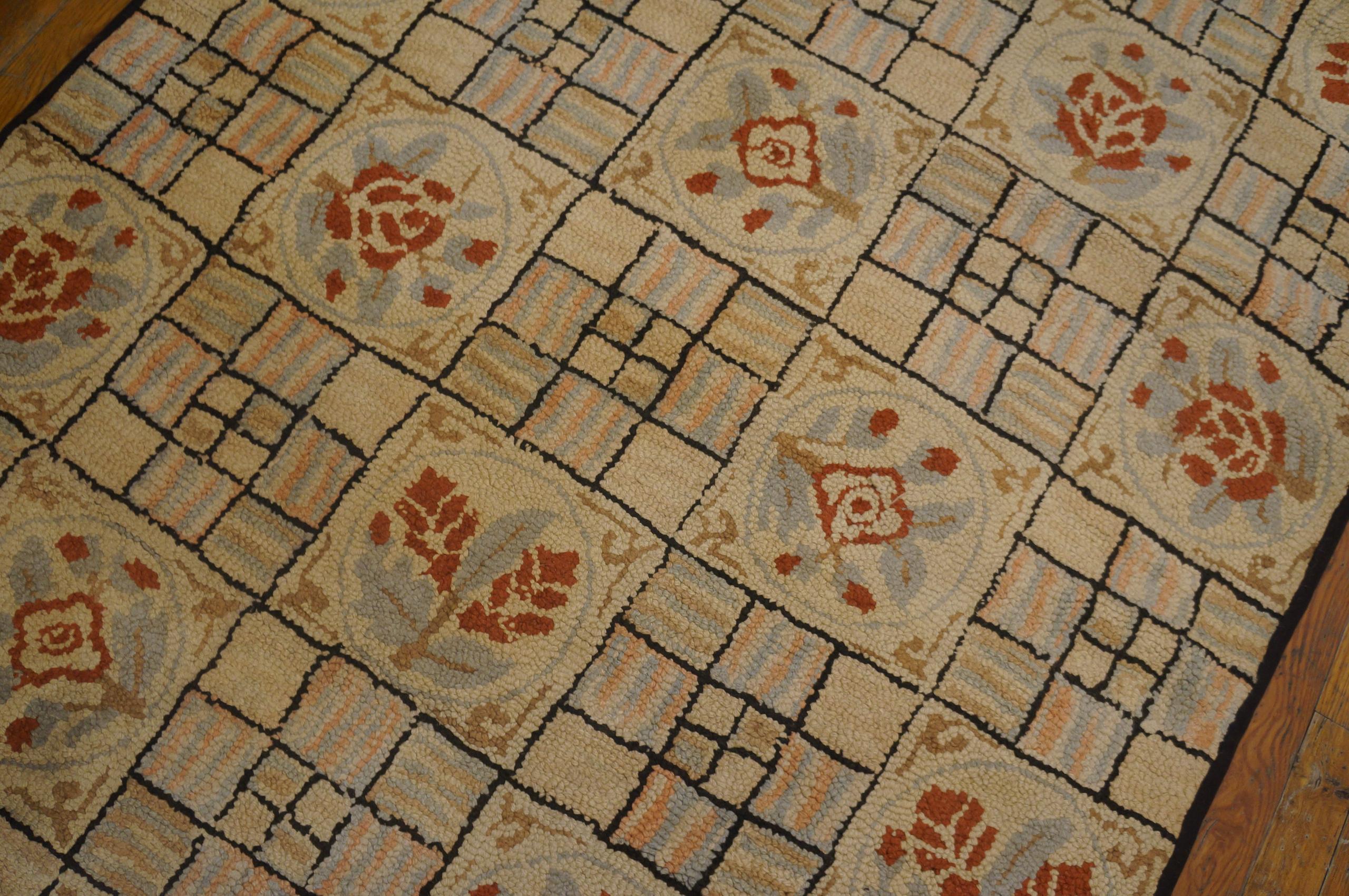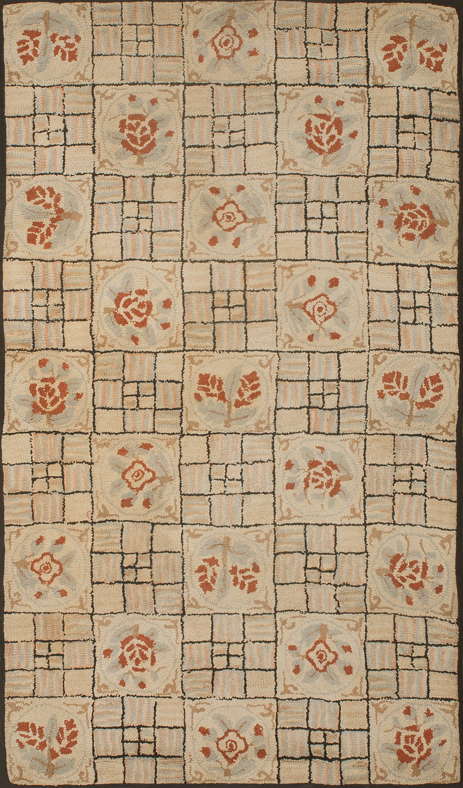 Floral Inlay Ivory Antique American Geometric Folk Art Basket Weave Design Hooked Rug