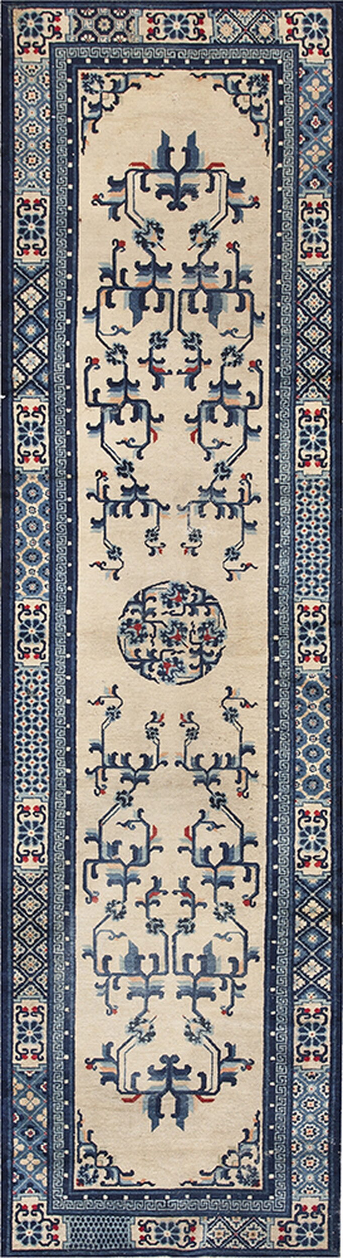 Floral Medallion Hand Knotted Pile Wool Ivory Beige Cream White Rectangle Antique 1900s Rug, Circa Date: 1900s. This exceptional piece is a refined example of early 20th-century Chinese weaving, characterized by its elegant, narrow format and restrained palette. The expansive field utilizes a sophisticated blend of ivory beige cream white color, providing a luminous canvas for the complex, deep indigo designs.