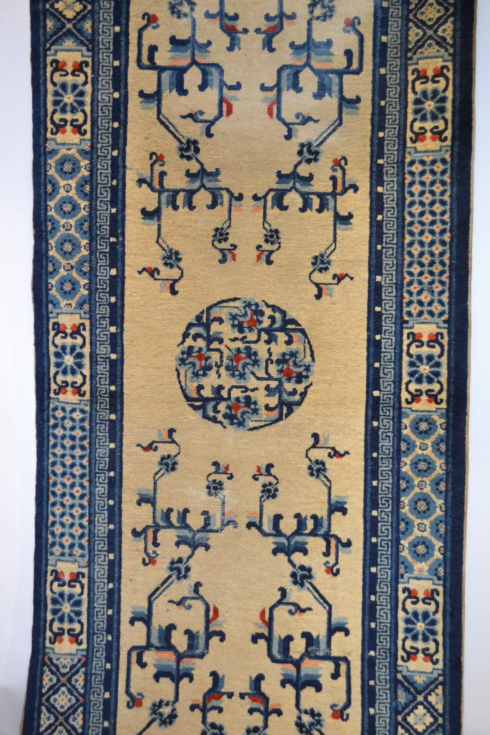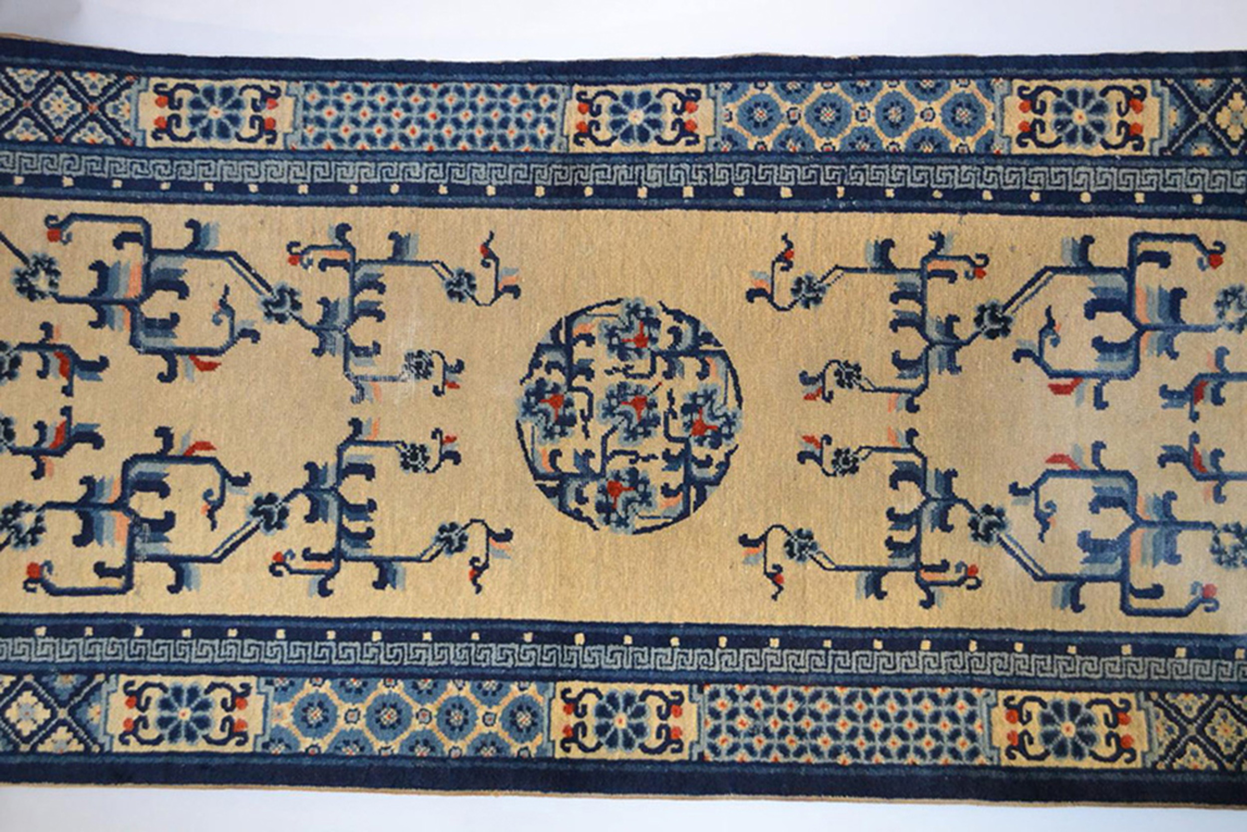 The central design features a striking circular floral medallion flanked by highly stylized, symmetrical motifs rendered primarily in deep blue and pale azure. These abstract forms, characteristic of the period’s Peking style, suggest traditional Chinese iconography, creating a dynamic yet balanced visual rhythm across the length of the piece. The overall composition places it firmly within the category of floral rugs, despite the graphic, abstract nature of the patterning.