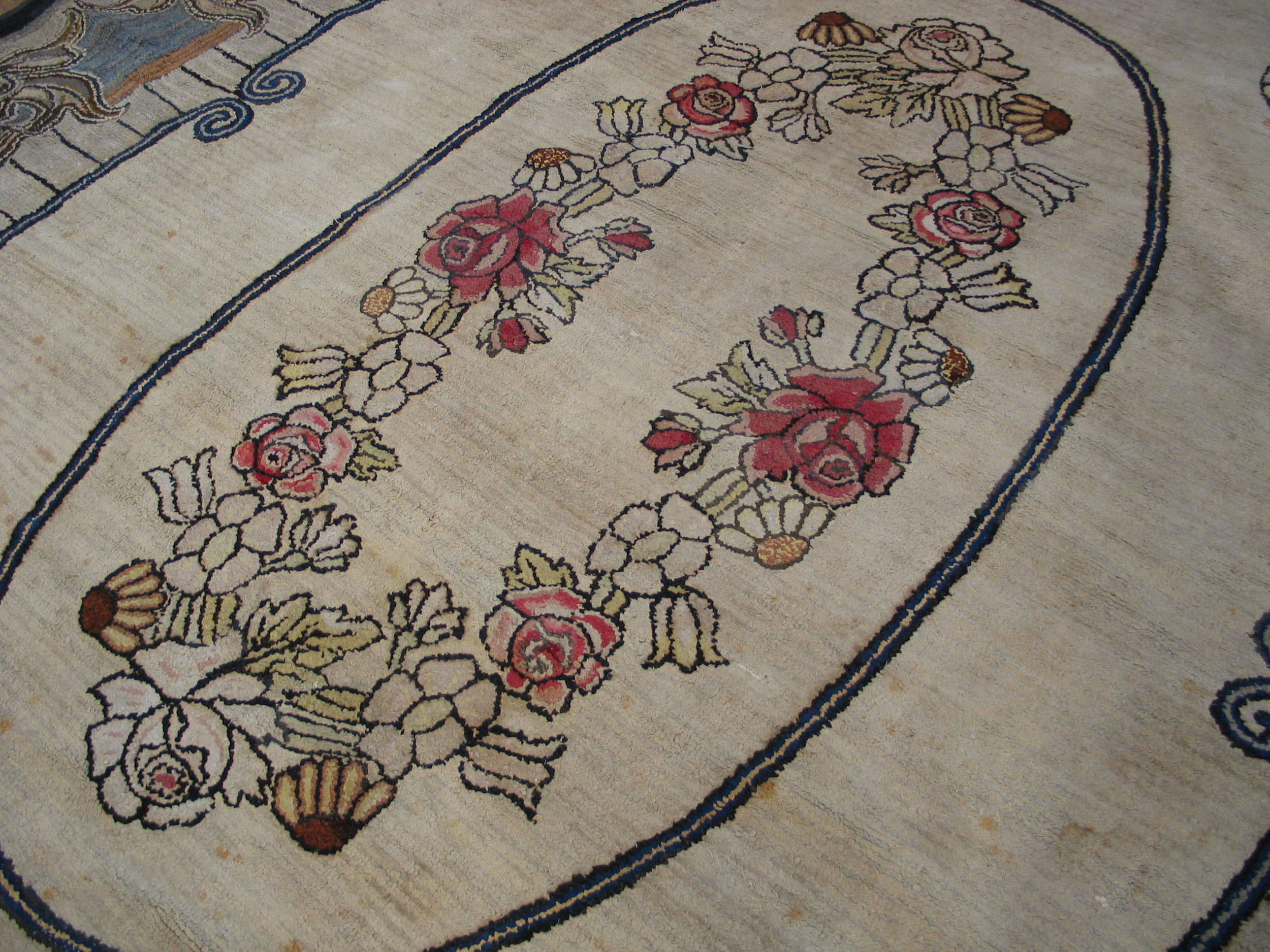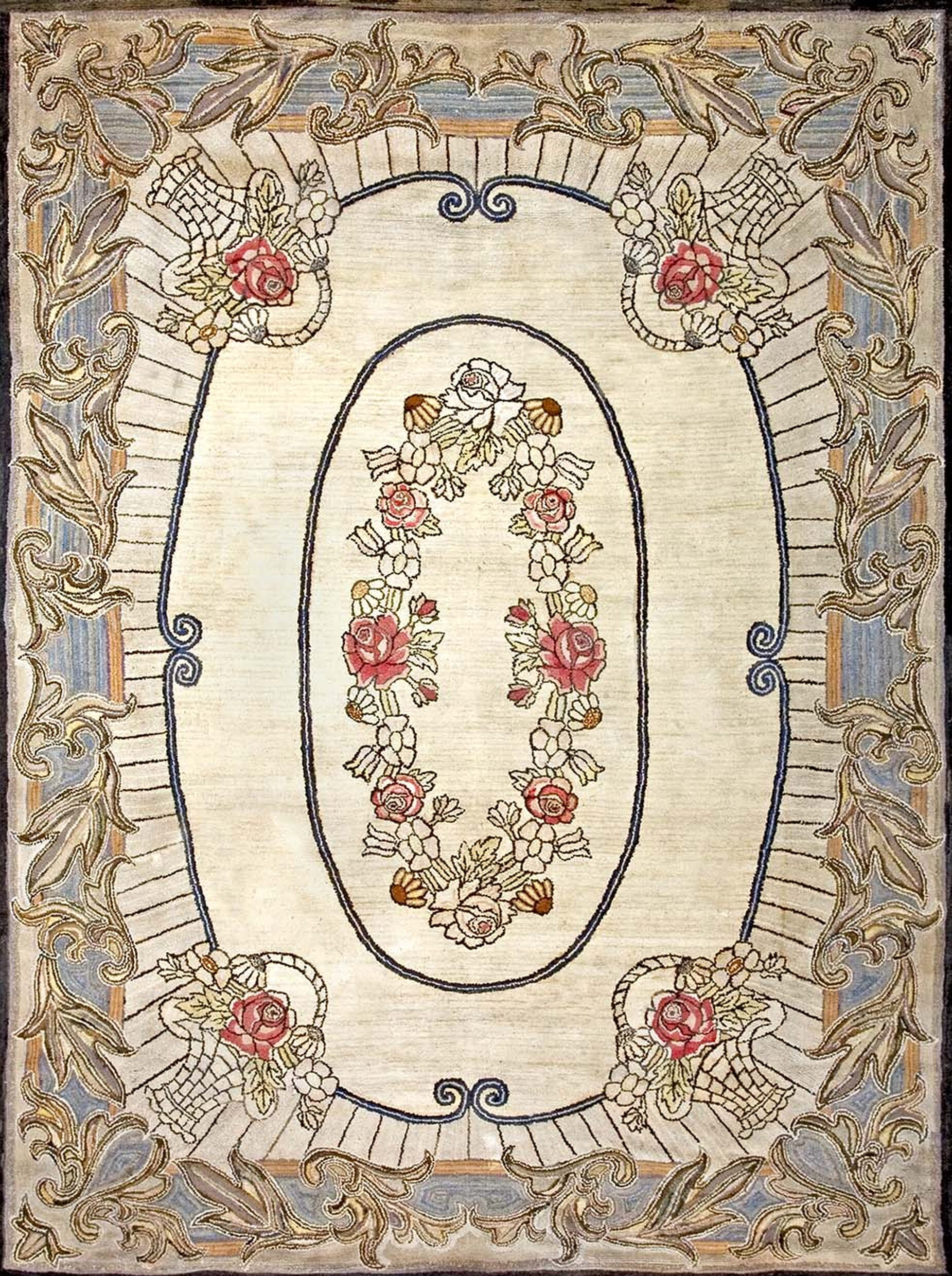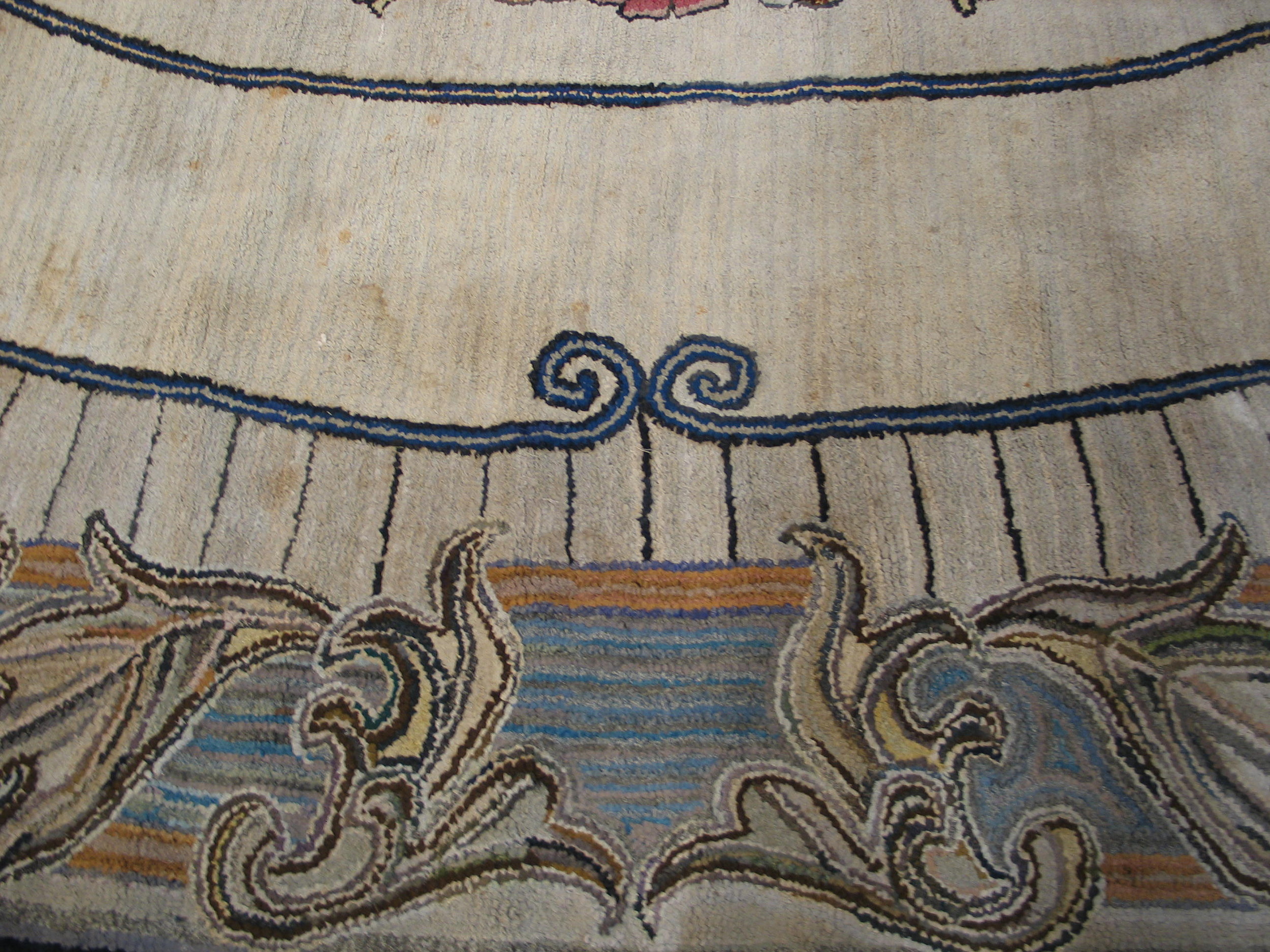 Floral Medallion Ivory Beige Cream White Rectangle 1930s Hooked – Loop Pile Wool & Cotton Antique Rug, Circa Date: 1930s. This exceptional textile represents the sophisticated evolution of American hooked work during the Art Deco era, utilizing a dense wool and cotton loop pile construction. The craftsmanship elevates this piece beyond typical folk art, presenting a highly refined design that seamlessly integrates into a collection of fine antique rugs.