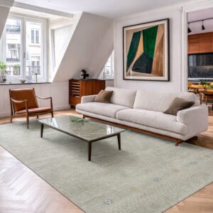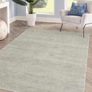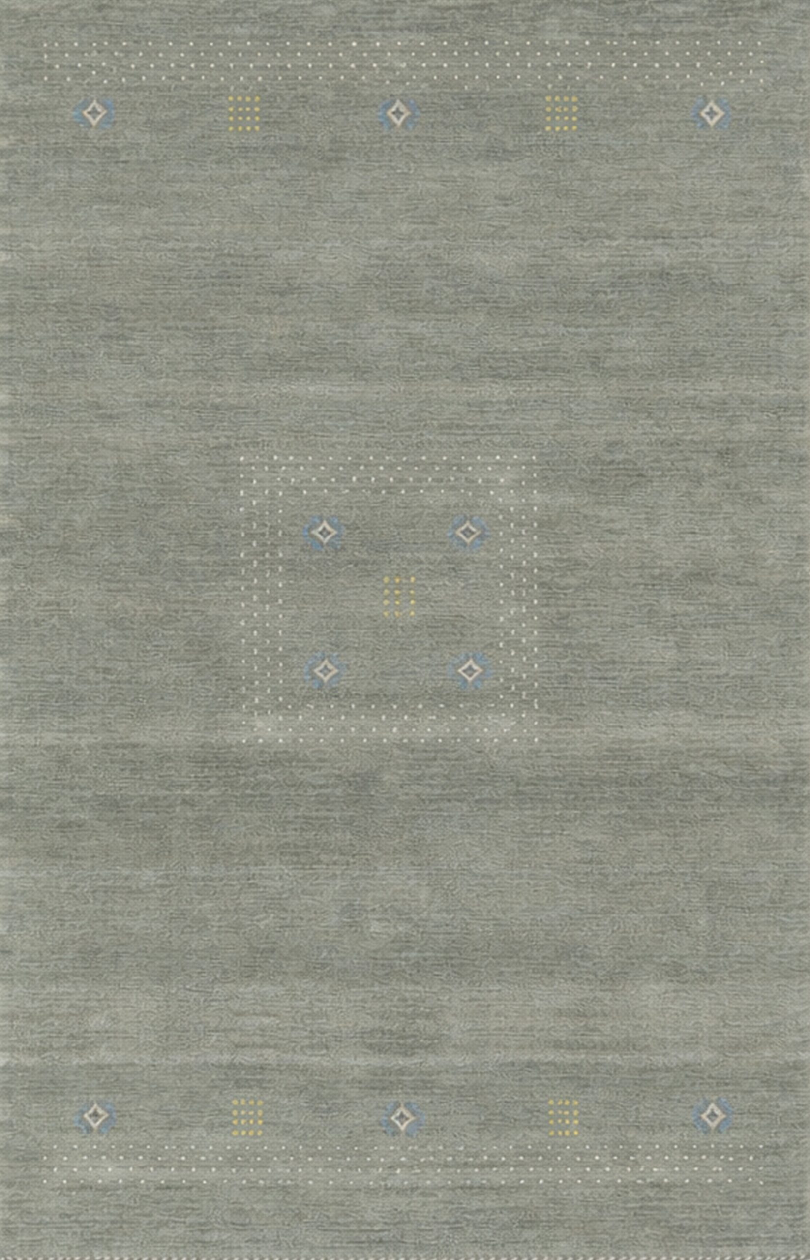 While minimalist in overall appearance, the Freya rug features carefully placed, primitive geometric elements—small diamonds and dotted squares—rendered in contrasting pale and ochre tones. This restrained ornamentation prevents the piece from feeling stark, offering visual interest without compromising the clean lines favored in new area rugs.