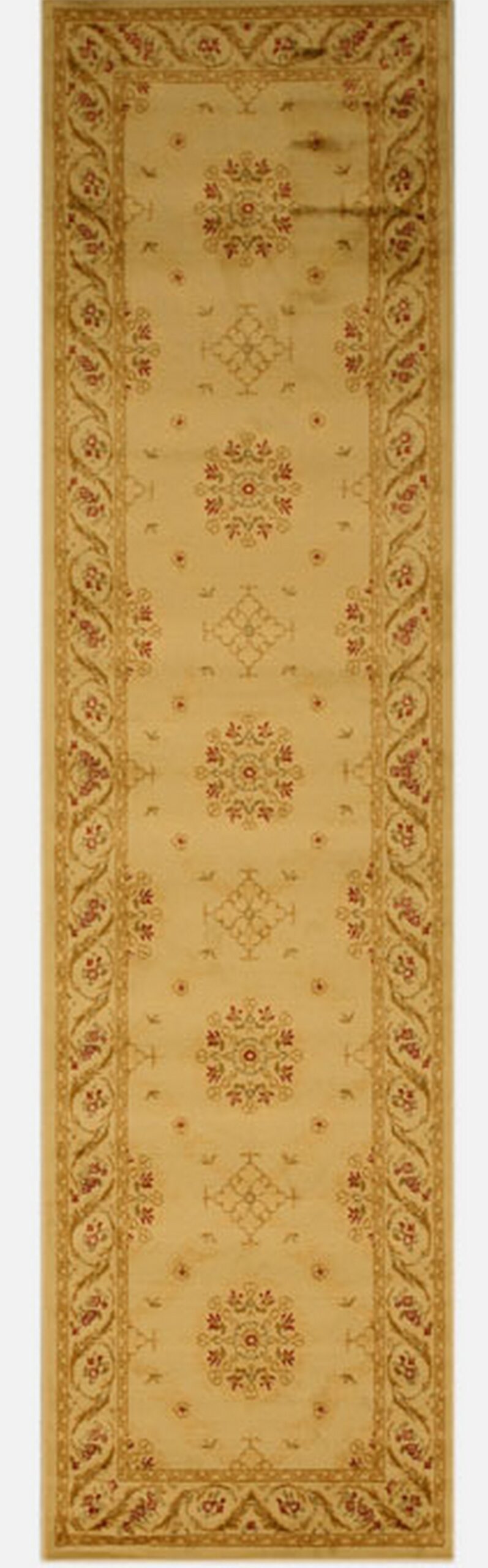 The palette is dominated by soft, buttery tones, creating a foundation of understated elegance. Accents of deep rose and taupe define the floral sprays within the medallions and the detailed border, perfectly suited for those seeking ivory beige cream rugs to brighten a space while maintaining traditional warmth.