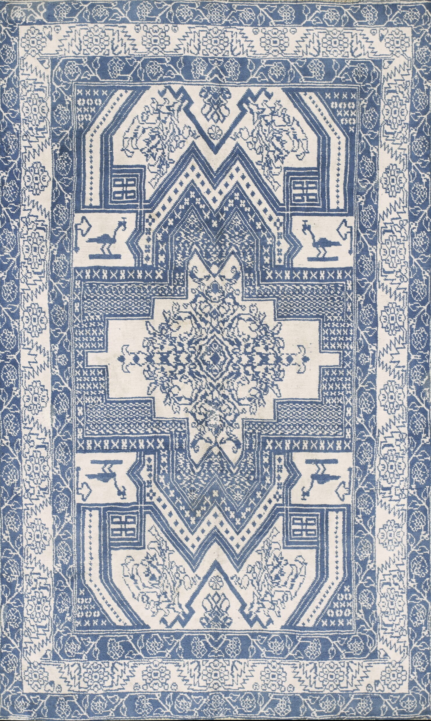 The central design features a highly stylized medallion surrounded by stepped borders and intricate minor details, including abstract zoomorphic figures. The overall composition relies heavily on bold linearity and repetition, placing this piece firmly within the tradition of geometric rugs that prioritize structure over purely curvilinear forms.