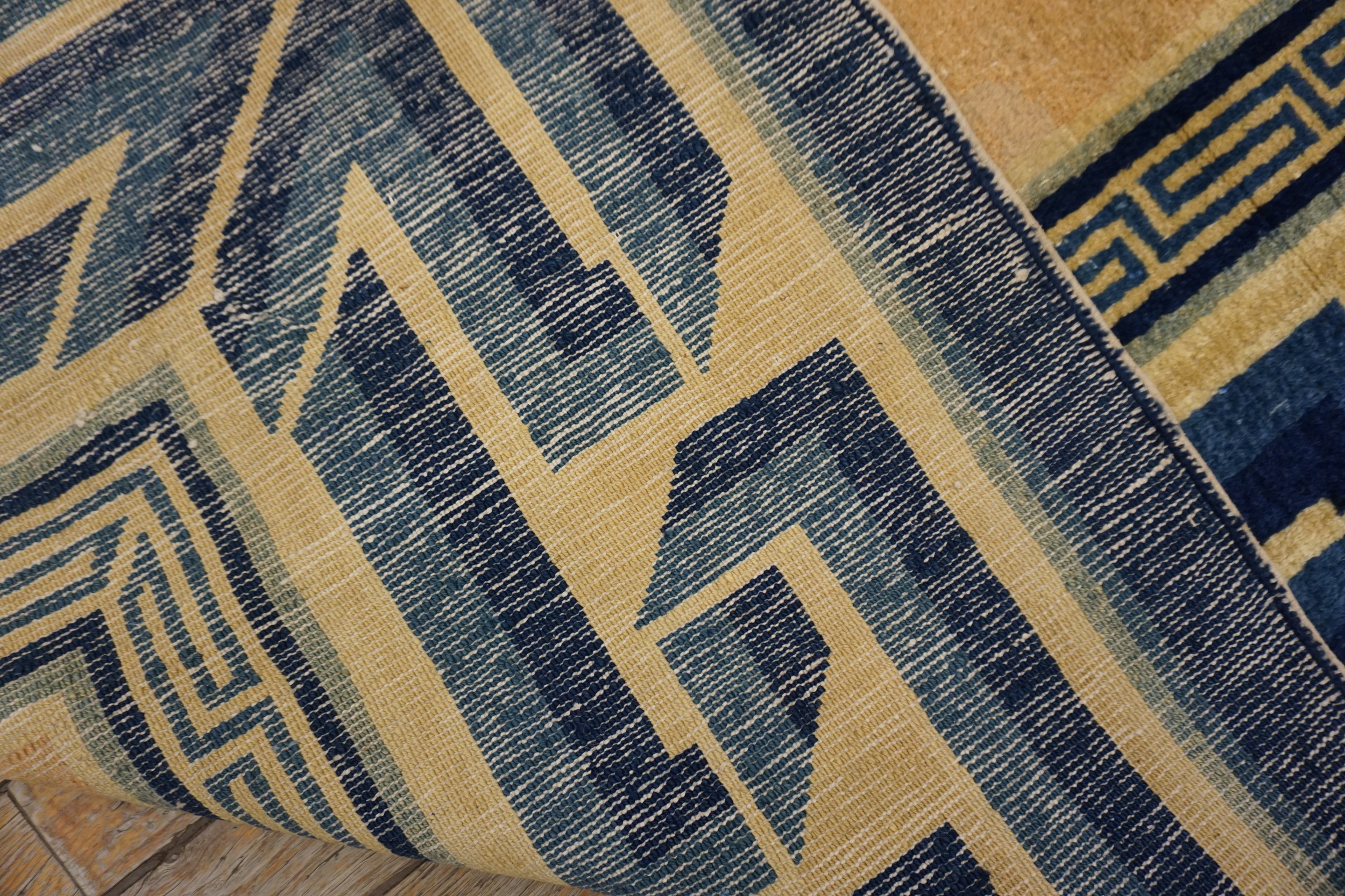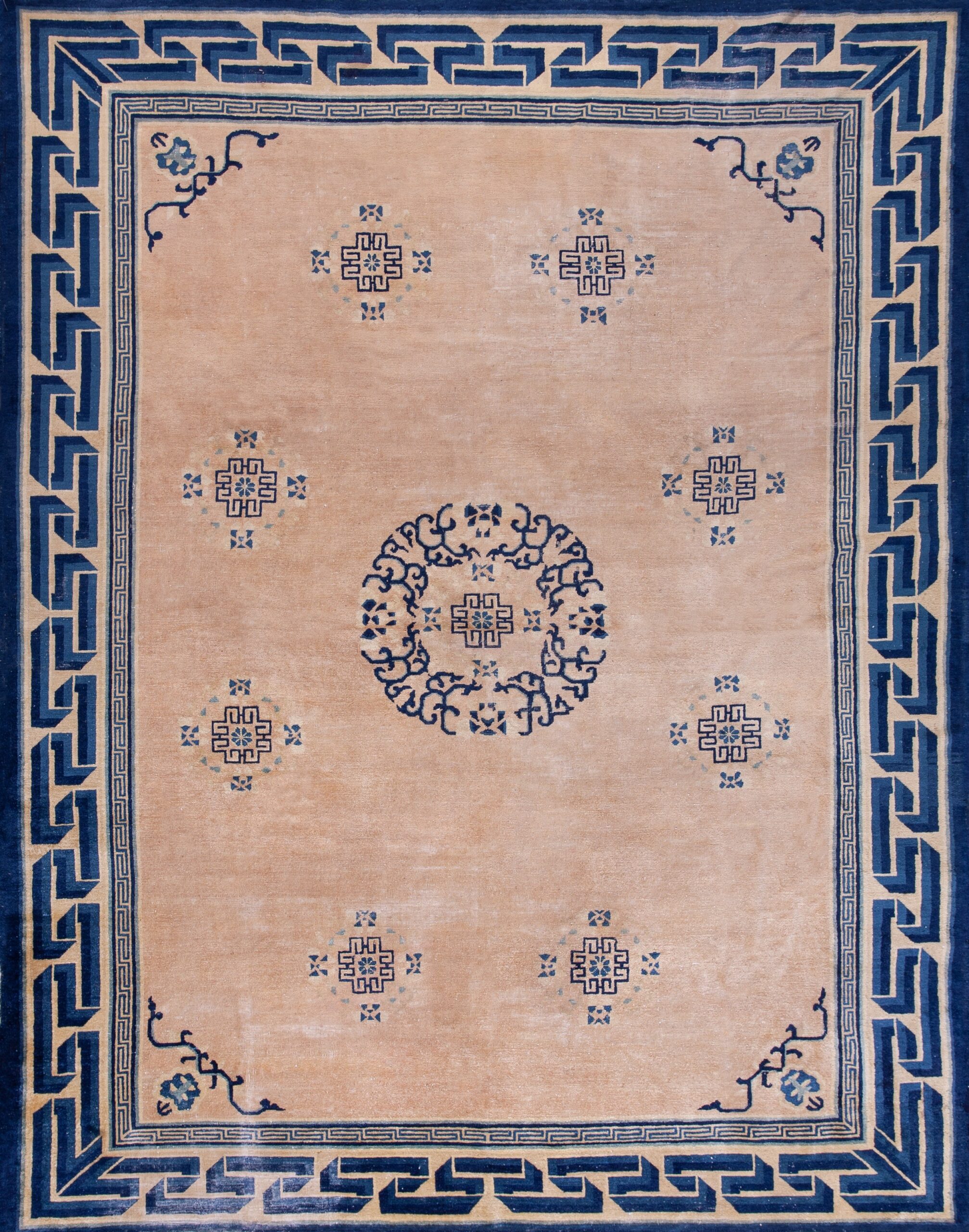 Centered by a finely detailed circular medallion, the design employs a spare scattering of traditional Chinese symbols, balancing negative space with intricate detail. The overall aesthetic leans toward simplified forms and bold outlines, classifying this piece among the most desirable geometric rugs of the period.