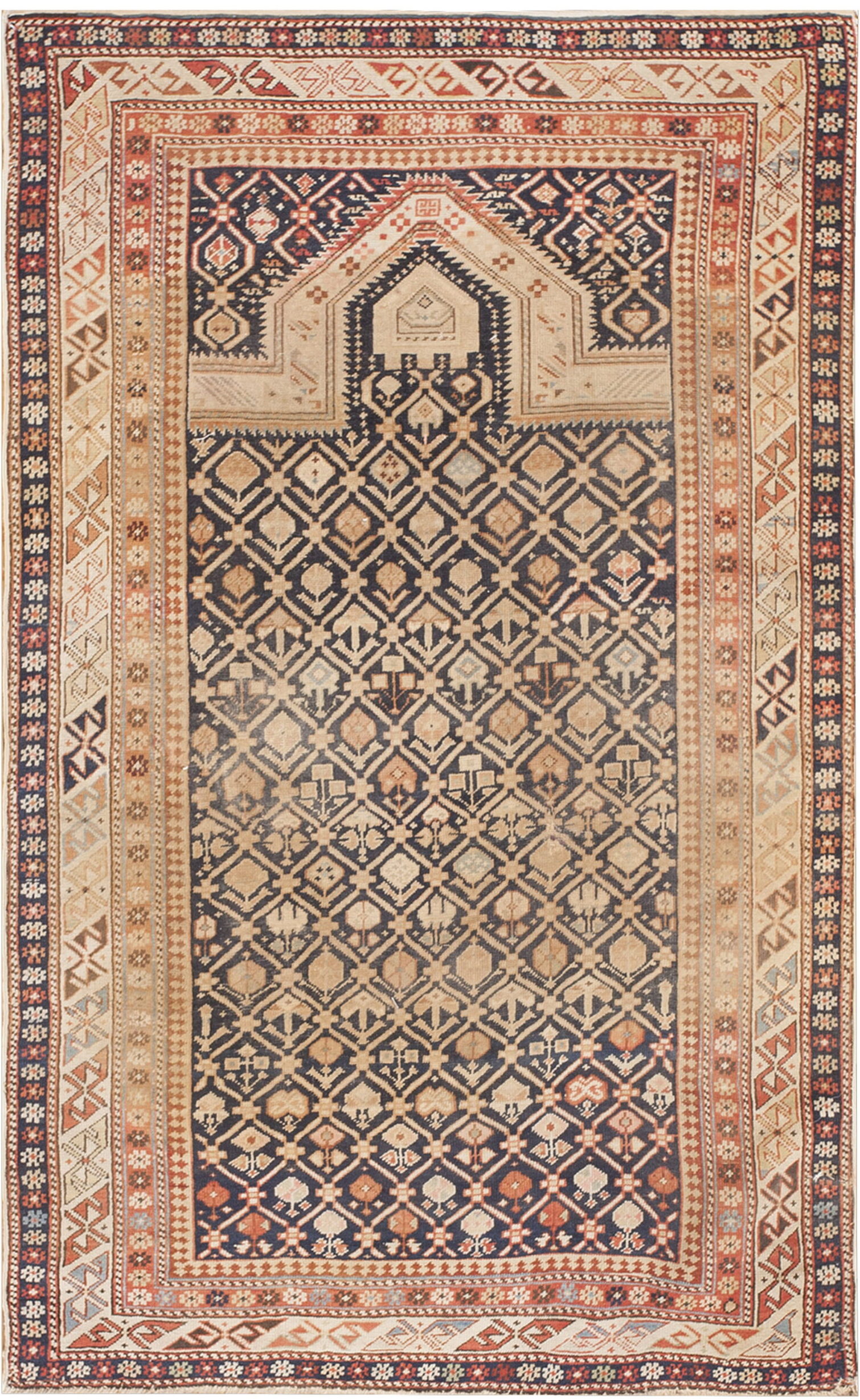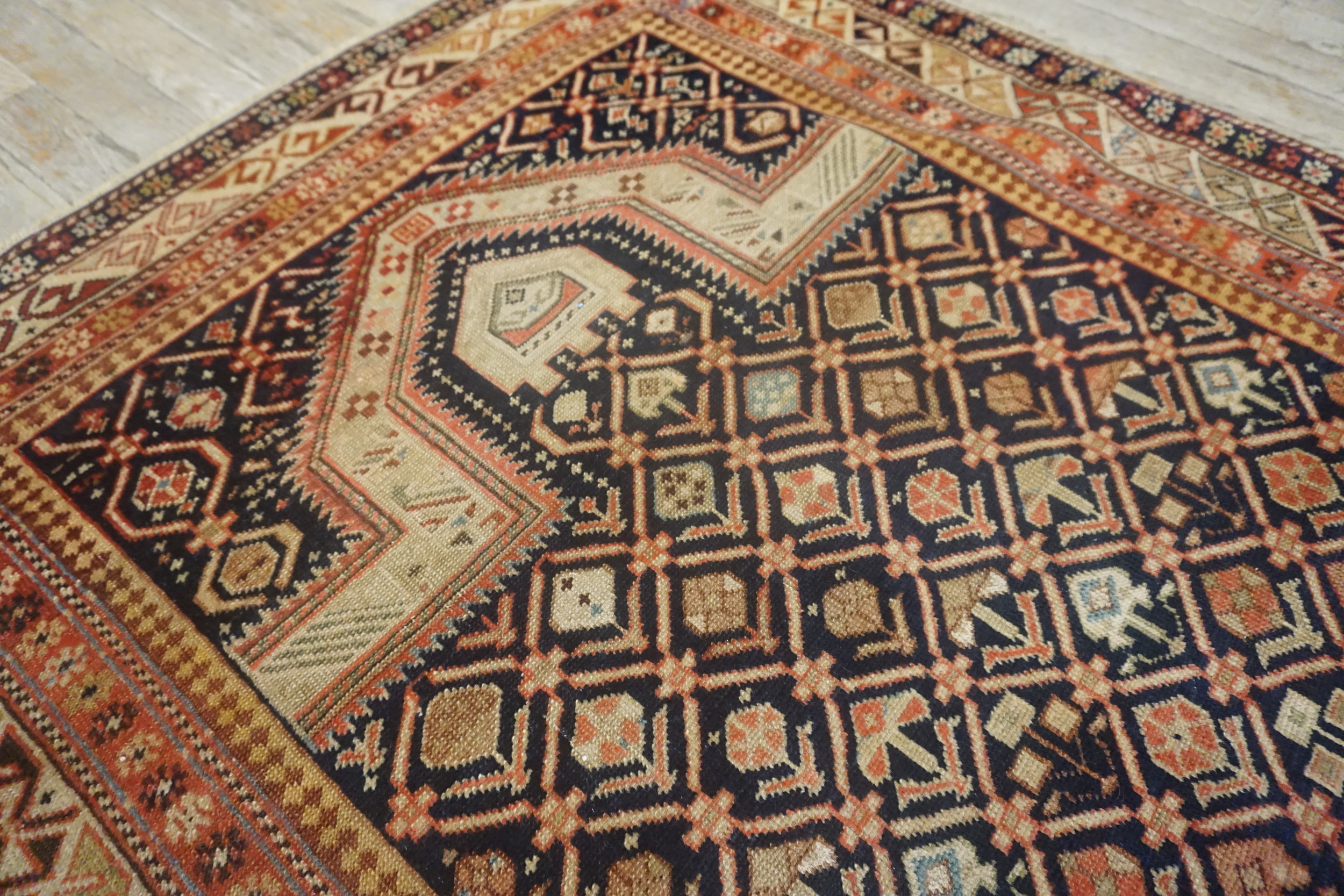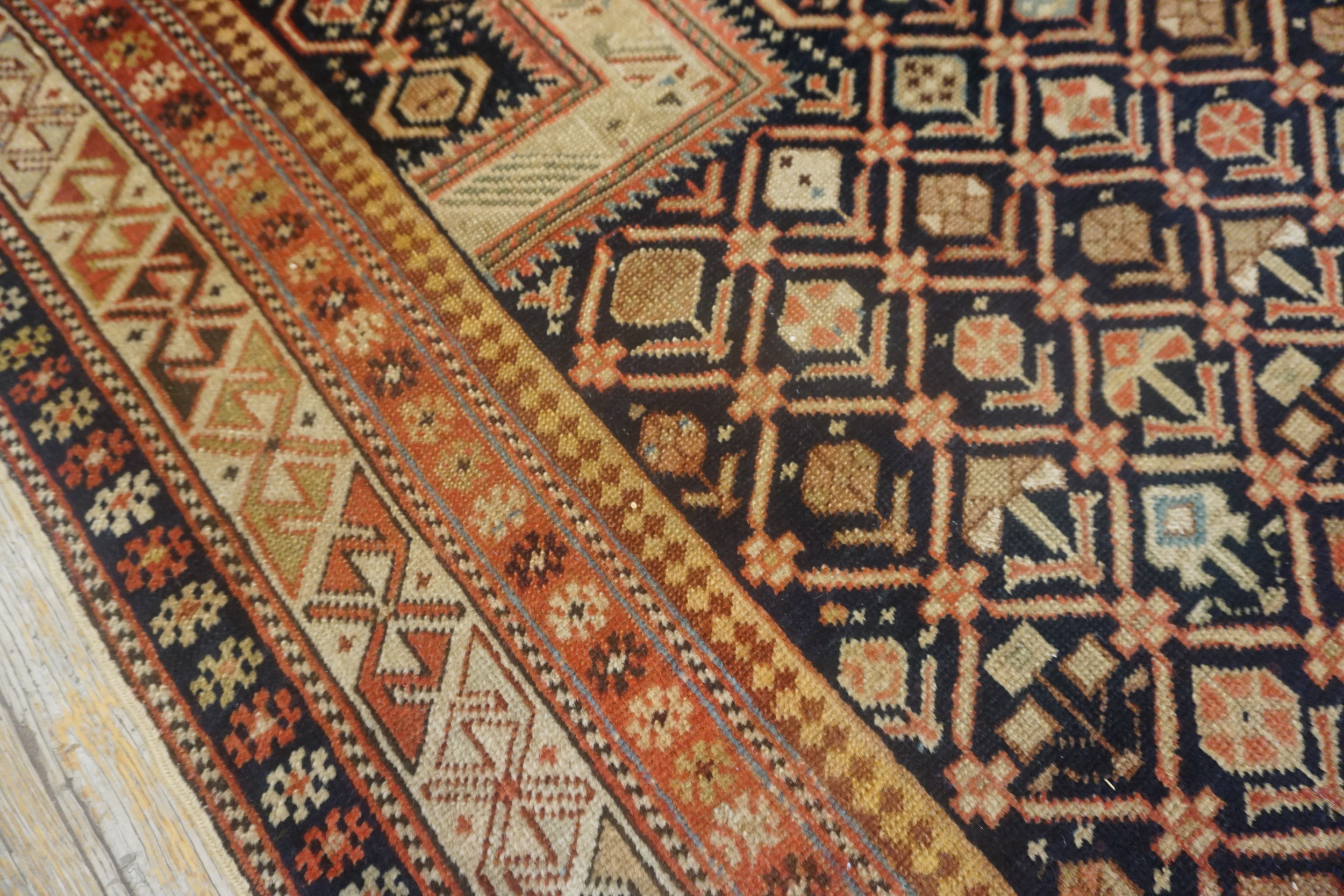 The palette is defined by the striking contrast between the rich, saturated indigo ground and the natural ivory and camel tones of the motifs. The use of deep, resonant blue color rugs is characteristic of the finest natural dyes employed by Caucasian weavers of this era, complemented by accents of madder red and terracotta in the complex border system.