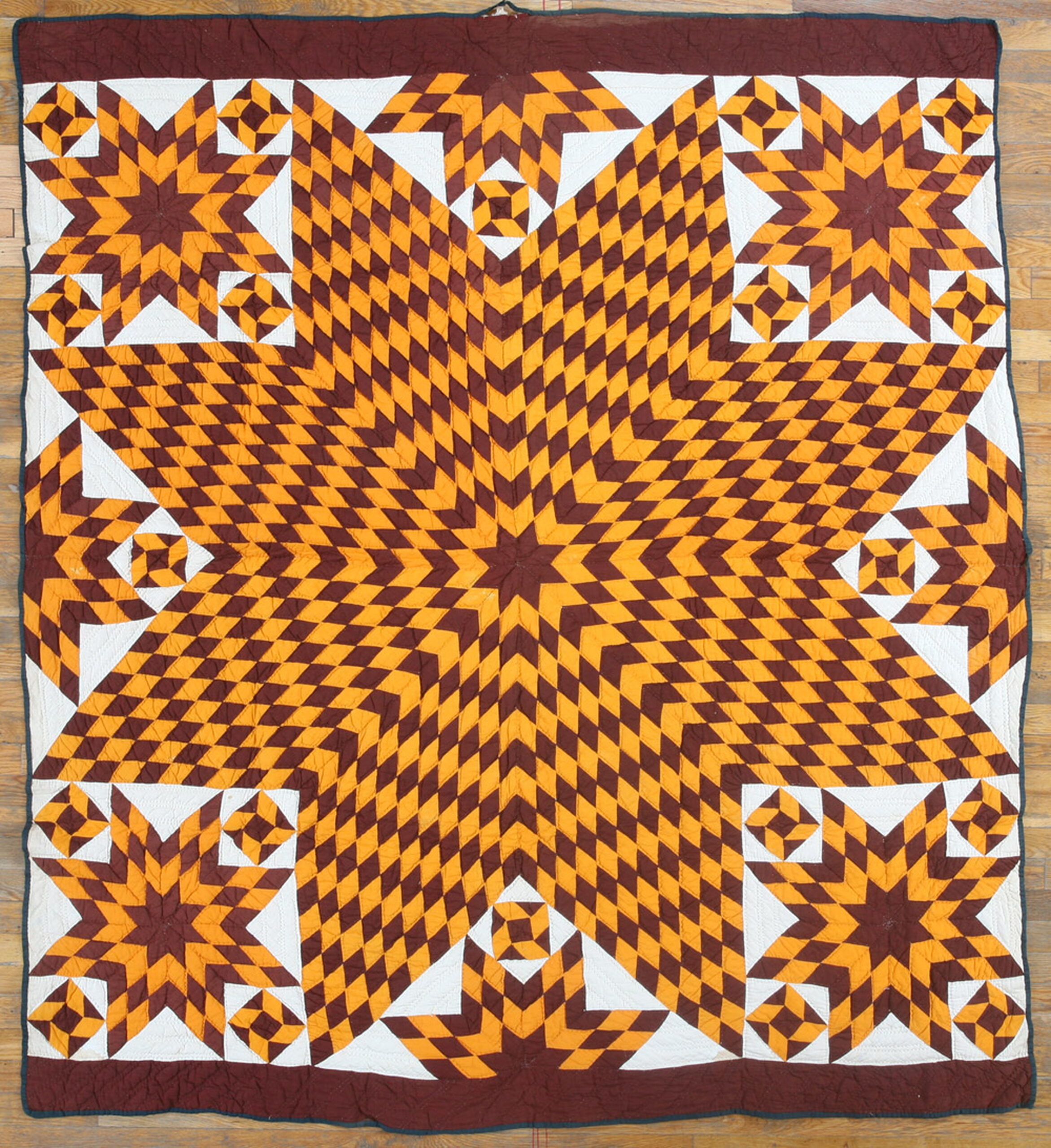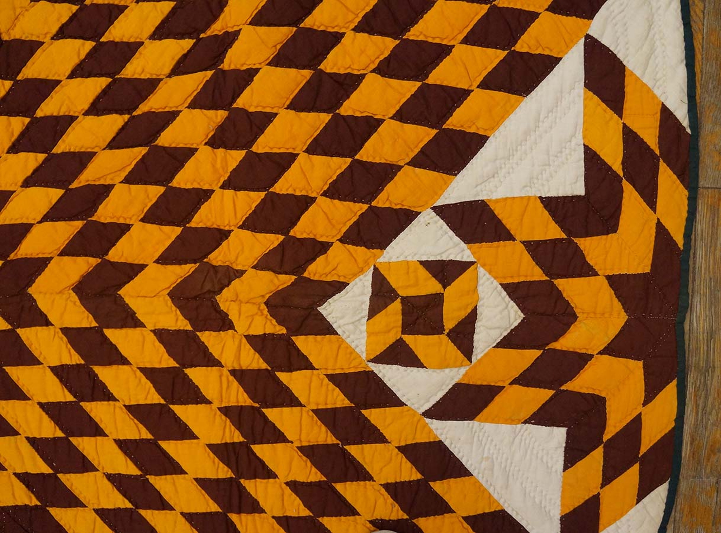 A rich, high-contrast palette defines this piece, utilizing deep maroon and brilliant gold-ochre set against crisp white accents. These saturated hues fall squarely into the category of multicolor jewel tones, lending the textile a warm, earthy radiance characteristic of American craftsmanship from the 1920s.