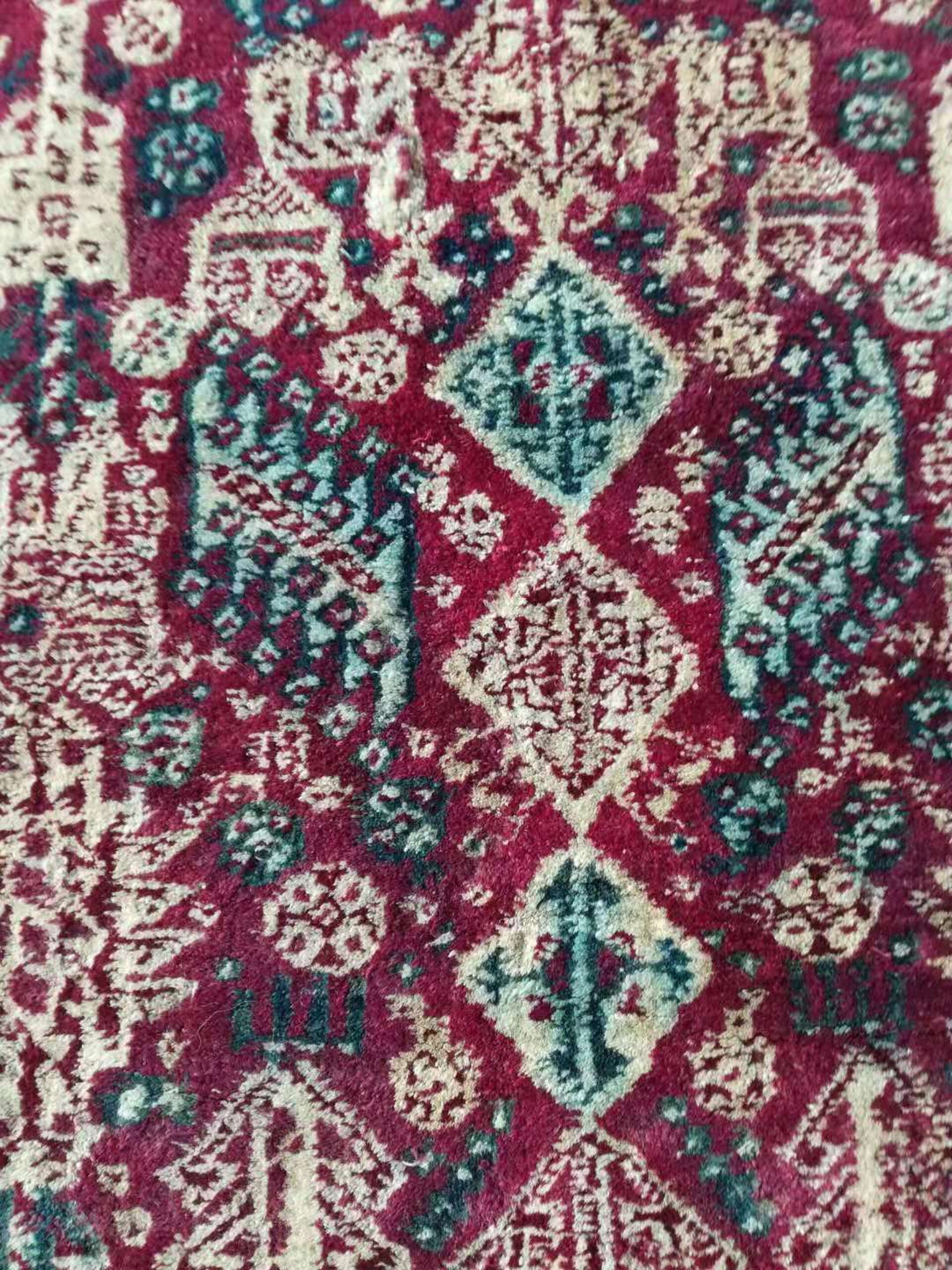 Woven entirely in high-quality wool, the rug features a rich madder field punctuated by stylized geometric motifs in cream and dark teal. Classified as a small scatter size, this format is highly sought after for its versatility, providing a necessary layer of texture and historical depth without dominating the room’s existing design elements.