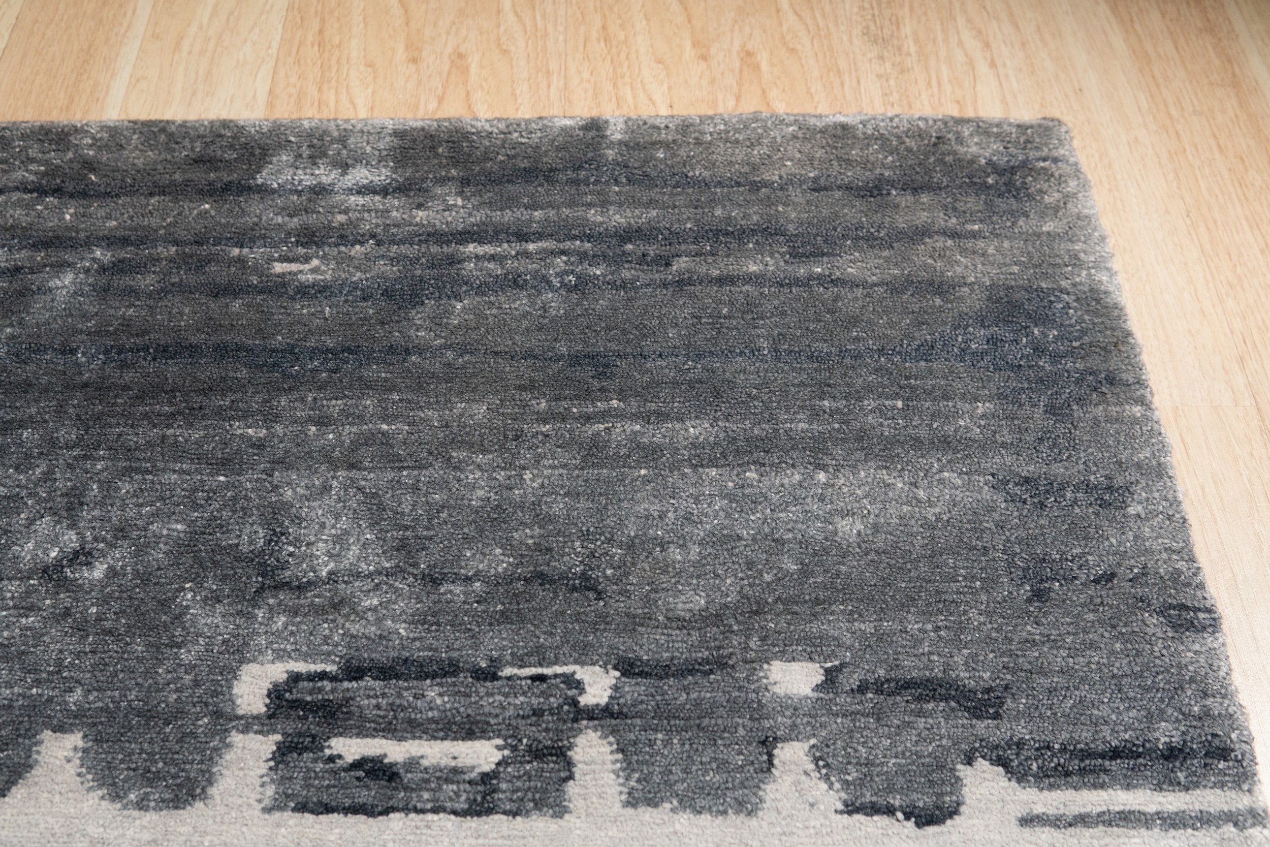 The design employs an intentionally blurred or “abrash” effect, suggesting the patina of age while remaining distinctly current. This technique prevents the abstract pattern from dominating the space, allowing the rug to serve as a textural backdrop rather than a sharp focal point. The complex interplay of charcoal, slate, and light silver defines the overall gray color rugs palette, providing immense versatility for various decorative schemes.