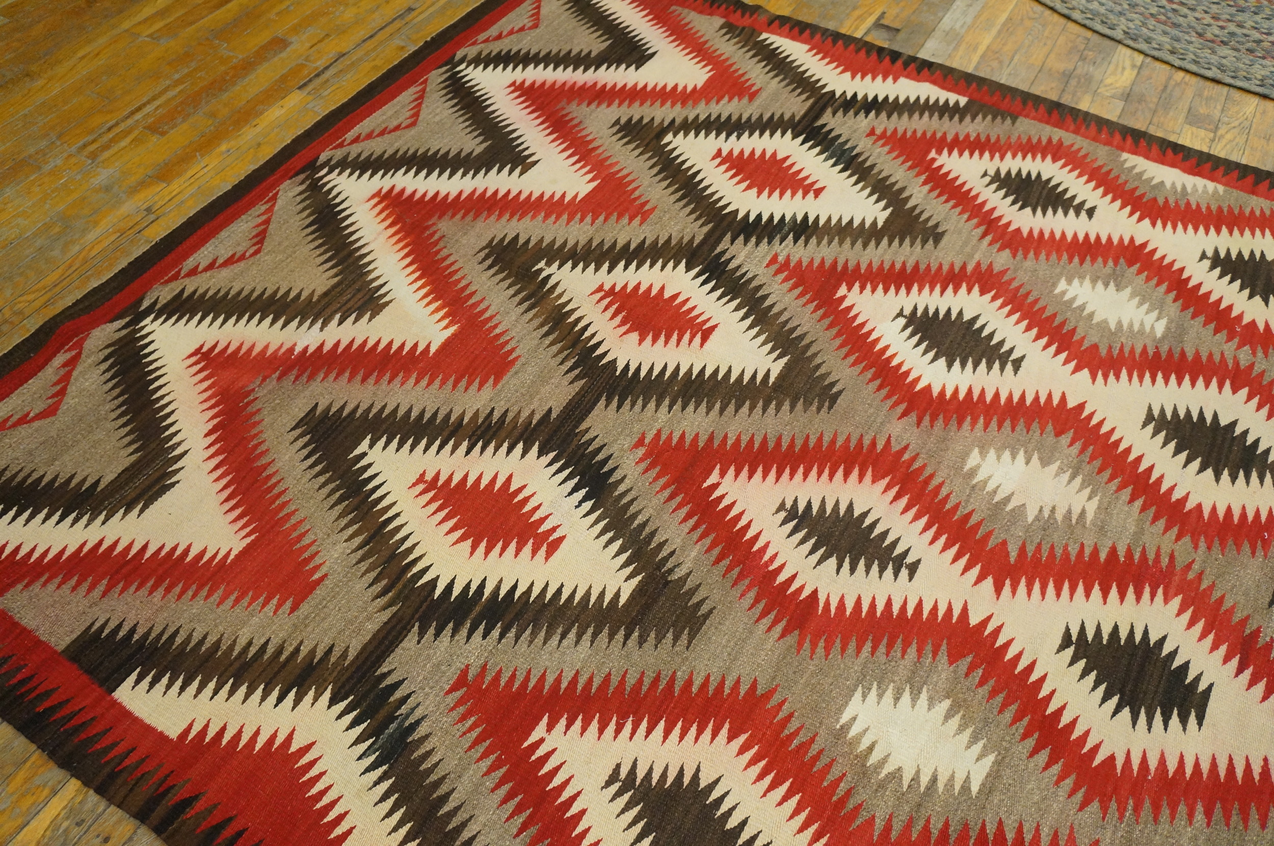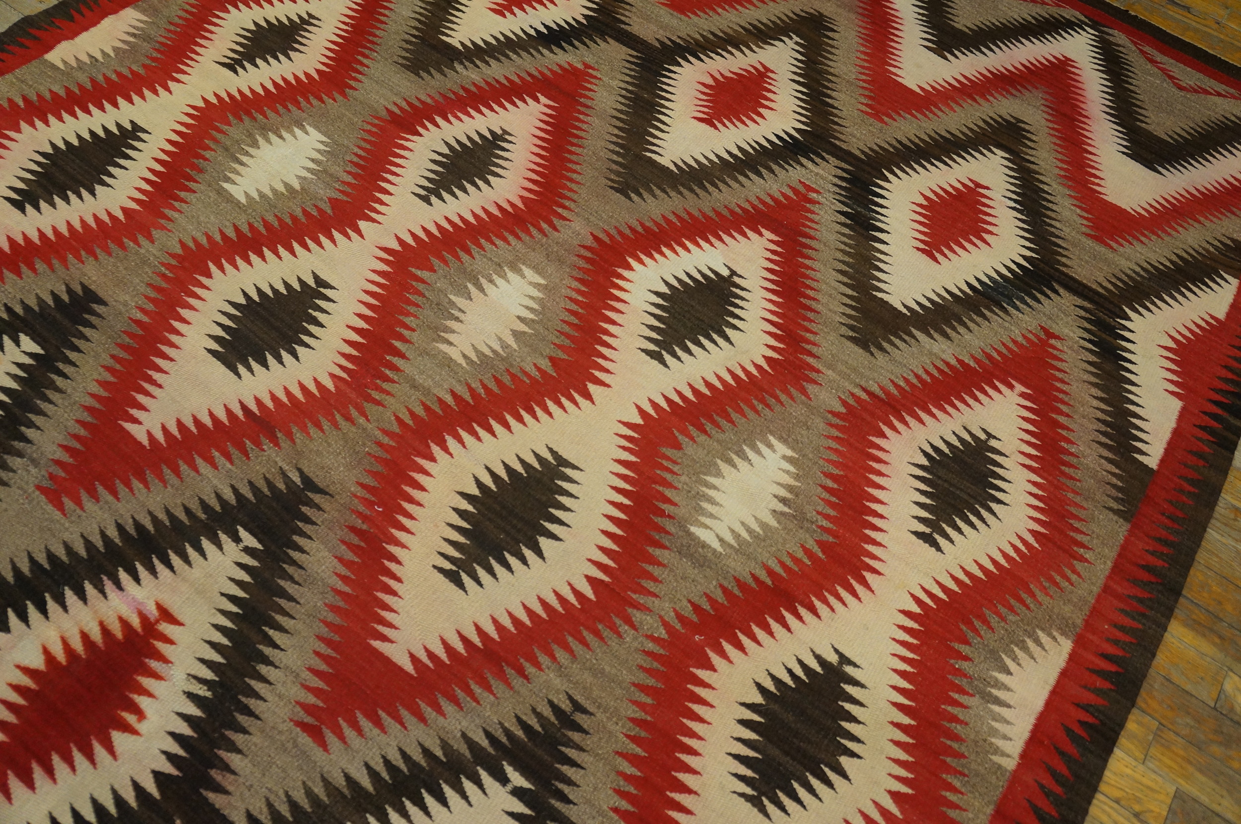 Antique Allover Geometric Wool Flat Weave Gray 1920s Rug, Circa Date: 1920s. This exceptional textile from the 1920s features a bold, dynamic design characterized by a continuous, serrated diamond motif. The composition utilizes an allover pattern that fills the entire field, creating visual energy typical of early 20th-century geometric weaving traditions.