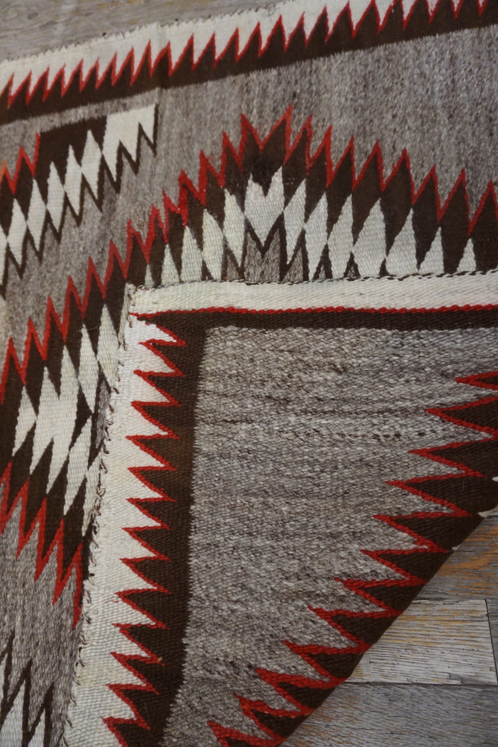 The palette is dominated by a striking, variegated gray field, providing a sophisticated backdrop for the high-contrast motifs. This subtle, heathered tone makes it a versatile addition to collections favoring gray color rugs. The natural wool, likely hand-spun, lends a rich texture to the tight, durable flat weave structure, characteristic of traditional American textiles.