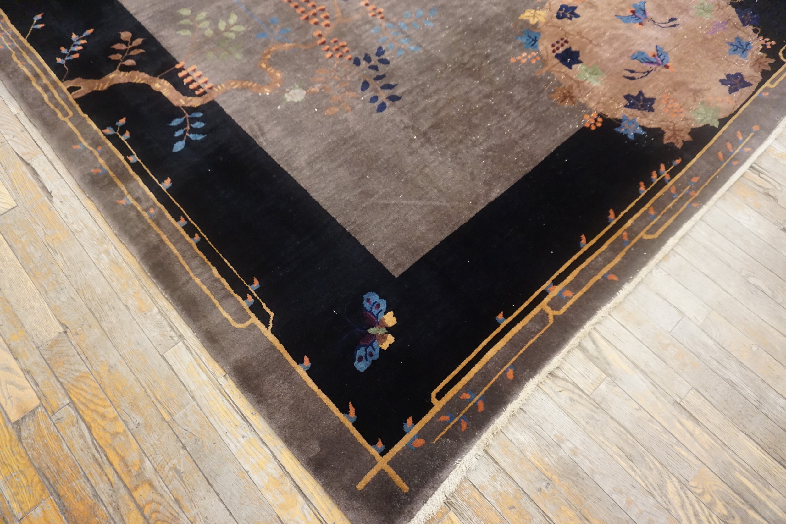 Antique Chinese – Art Deco Gray 1920s Rug, Circa Date: 1920s. This exceptional Art Deco piece captures the transitional elegance of the period, demonstrating how Chinese weavers interpreted the modern aesthetic. The expansive field is dominated by a deep, sophisticated taupe, placing it among the most sought-after gray color rugs of the era.
