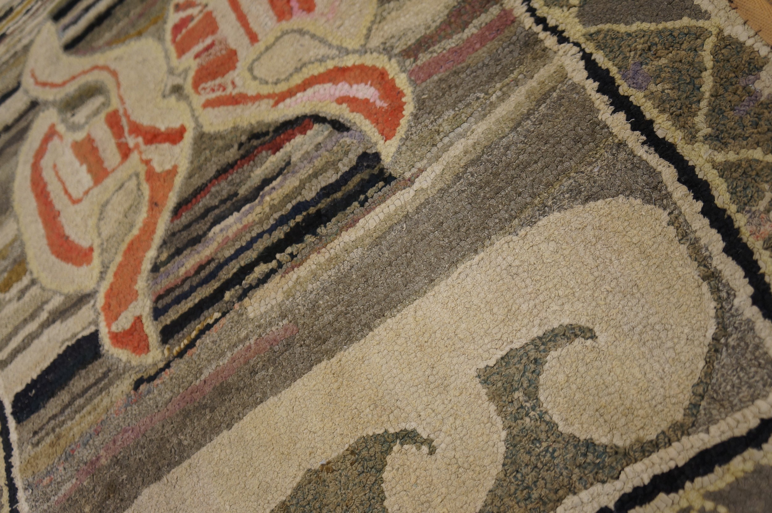 The borders act as a soft architectural frame, often echoing the dominant colors of the central motifs to “lock in” the composition. The result is a textile that feels like a “painting for the floor.” To possess this Antique Gray American Hooked rug is to own a monument to the resourcefulness and artistic soul of the New World—a work that brings a sense of historical gravity and quiet, modern sophistication to any interior sanctuary.