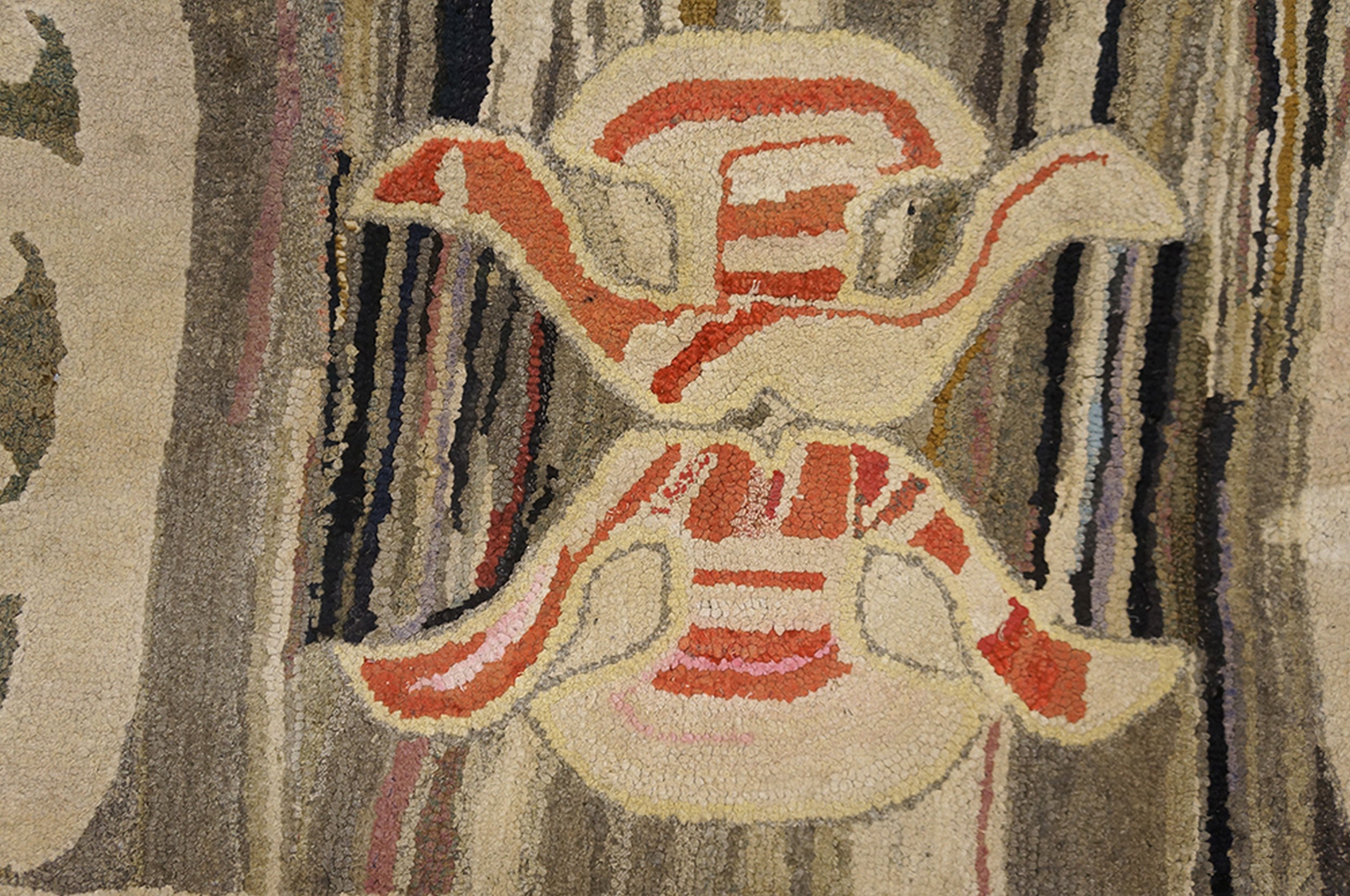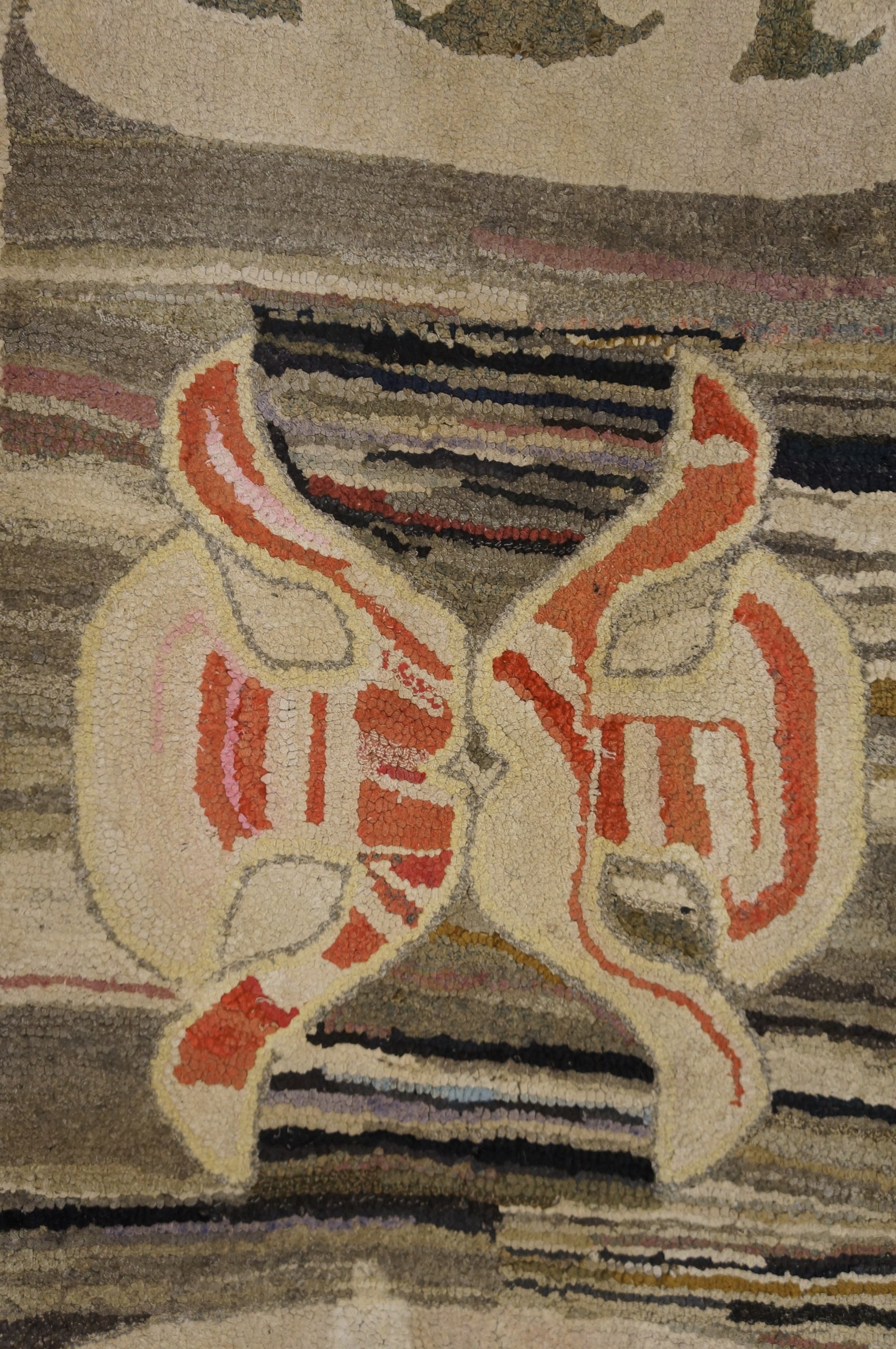 This early 20th-century American Hooked rug is a sophisticated example of “Textile Fine Art,” bridging the gap between utilitarian domestic craft and modern abstract expressionism. While many hooked American folk art rugs from this era utilized floral or pictorial themes, this particular specimen is distinguished by its highly artistic, painterly approach and its nuanced, contemporary palette, making it a “connoisseur’s piece” for collectors of Americana.