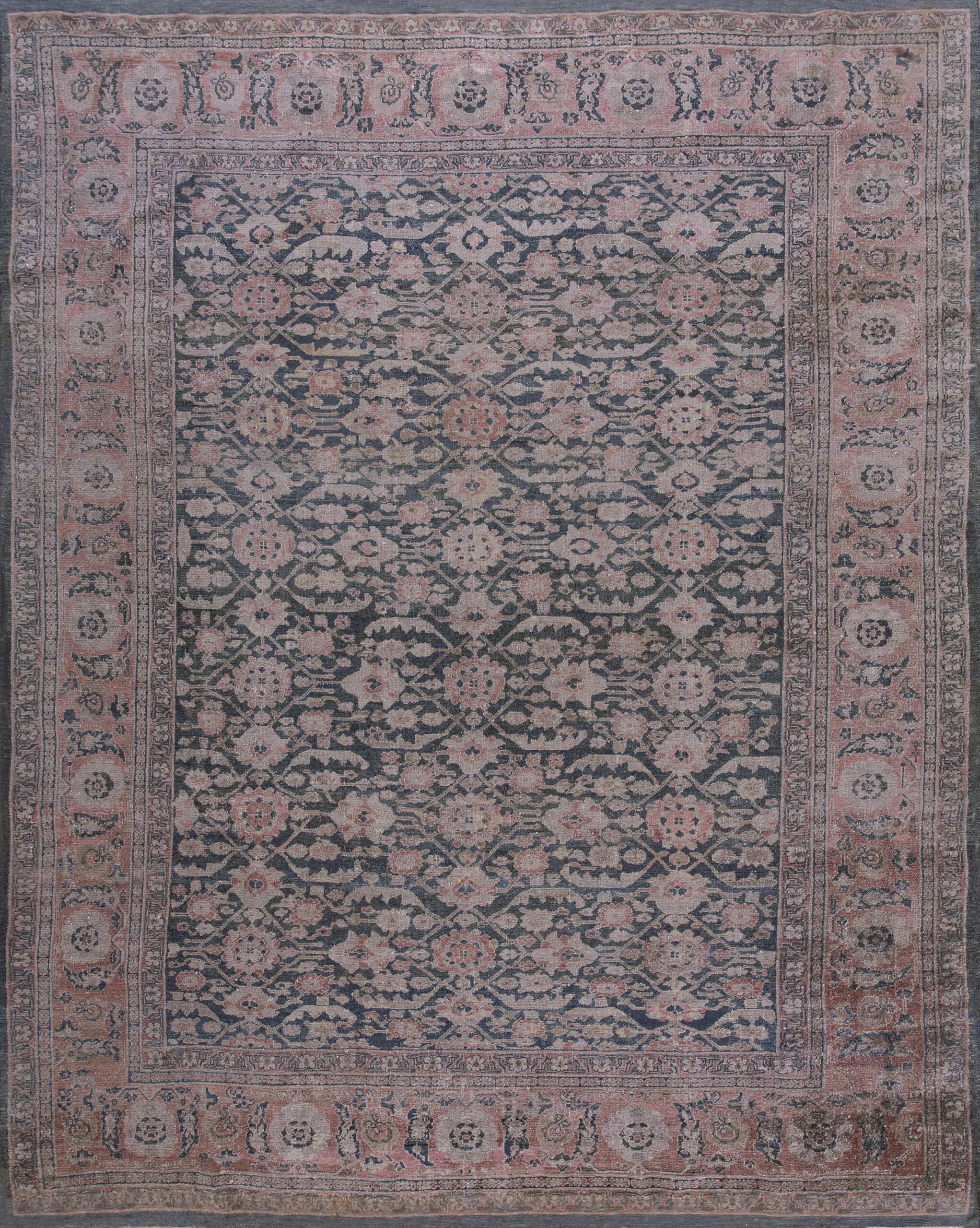 The palette is dominated by a deep indigo ground softened by decades of use, allowing the secondary colors to emerge as gentle, muted tones. The overall effect is a highly desirable gray color rugs aesthetic, where subtle rose and taupe highlights prevent the piece from feeling monolithic, adding depth and warmth to the faded field.