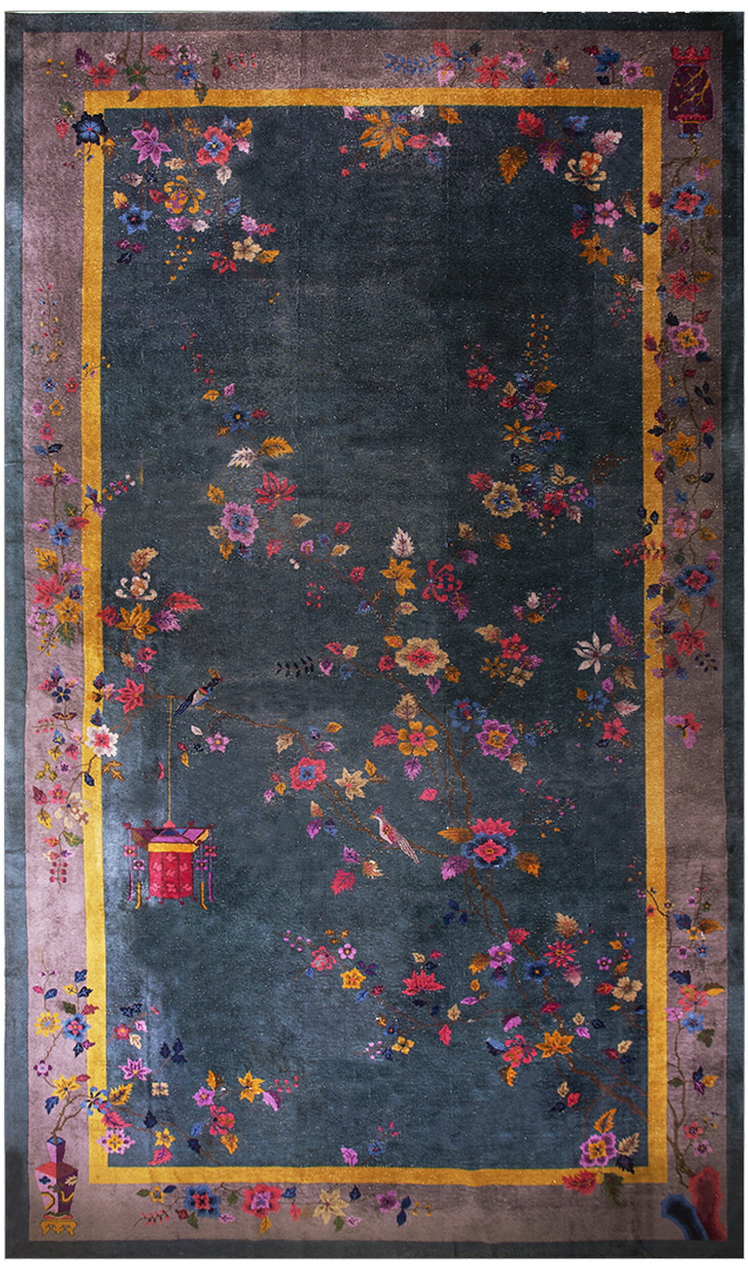The striking depth of the field, a saturated, moody hue, places this piece among the most desirable green Color Rug examples. The composition is classic Chinese Art Deco, utilizing expansive negative space to emphasize the delicate, naturalistic depiction of flowering branches, birds, and a hanging lantern.