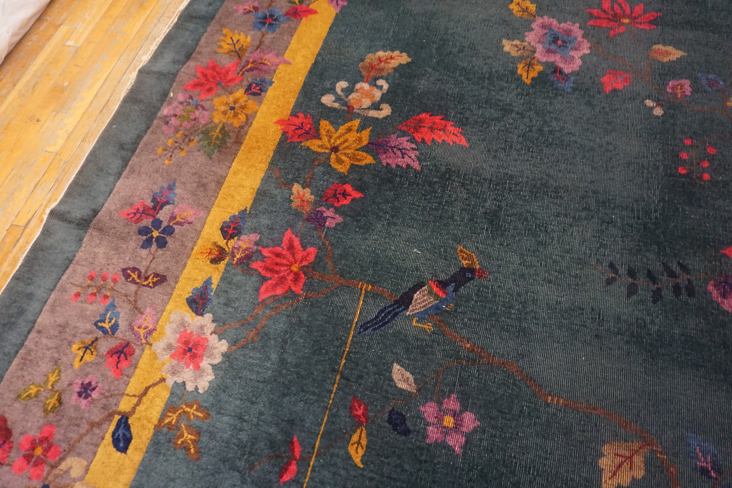 Antique Chinese – Art Deco Oversized Large Big Wool Green Rug, Country of Origin: China, Circa Date: 1920s. This magnificent Art Deco carpet exemplifies the sophisticated transition occurring in Chinese rugs during the 1920s, blending traditional motifs with the bold, modern aesthetics of the West.