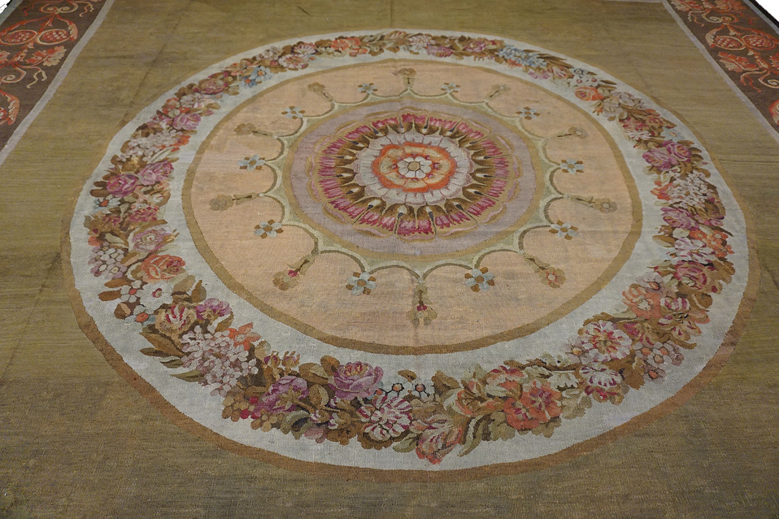 The composition is anchored by a central floral medallion, a design hallmark that traces its lineage back to the Louis XVI era and the subsequent French Restoration. These medallions were often inspired by the “cartoons” (full-scale design sketches) produced by prominent court painters such as Jean-Baptiste Huët or Pierre-Josse Perrot. In this specific piece, the medallion is framed by delicate garlands and scrolling foliate borders, which serve to ground the exuberant floral motifs with a sense of architectural order. The symmetry and scale of the medallions were not merely aesthetic choices; they were designed to mirror the ornate plasterwork of the ceilings above, creating a harmonious “total environment” within the aristocratic homes of the nineteenth-century haute bourgeoisie.