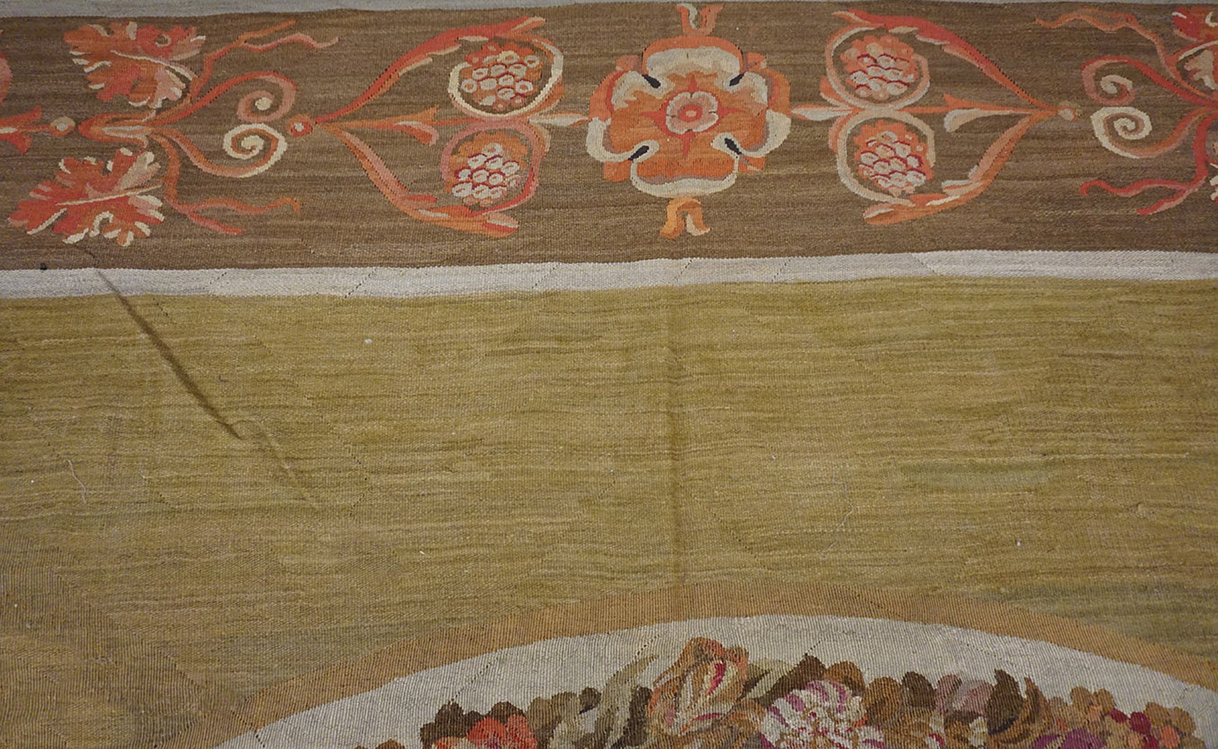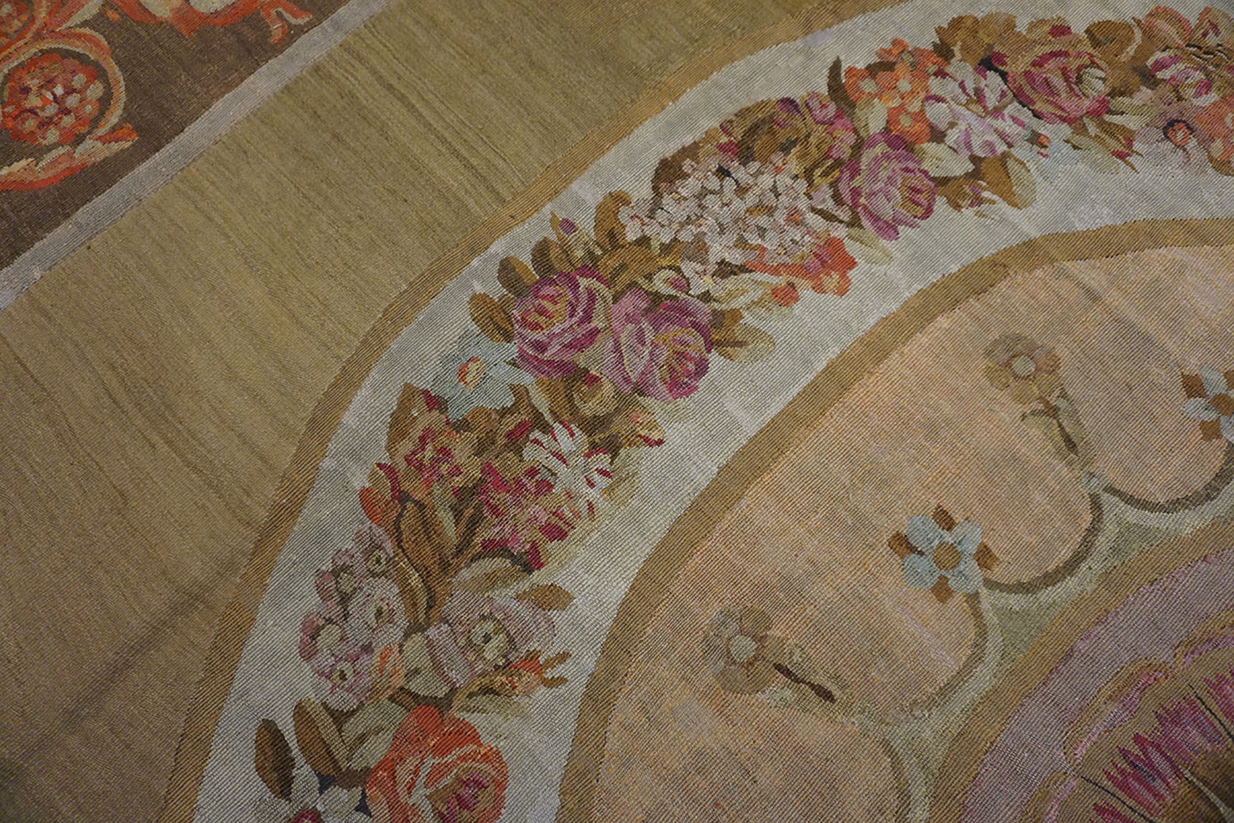 From a historical perspective, the Aubusson region became the epicenter of European flatweave production because of the unique properties of the River Creuse. The river’s water was exceptionally low in lime, making it ideal for the washing and dyeing of wool, which resulted in the luminous, enduring colors seen in this beautiful antique French rug. During the mid-to-late 1800s, as the Industrial Revolution began to introduce machine-made alternatives, these hand-woven Aubussons remained the gold standard for luxury, prized for their “surface calm” and their ability to anchor a room without the visual weight of a high pile. Today, a square-format Aubusson in such a vibrant, unconventional colorway remains a true collector’s find, representing a period when French textile art reached a pinnacle of decorative refinement and botanical realism.