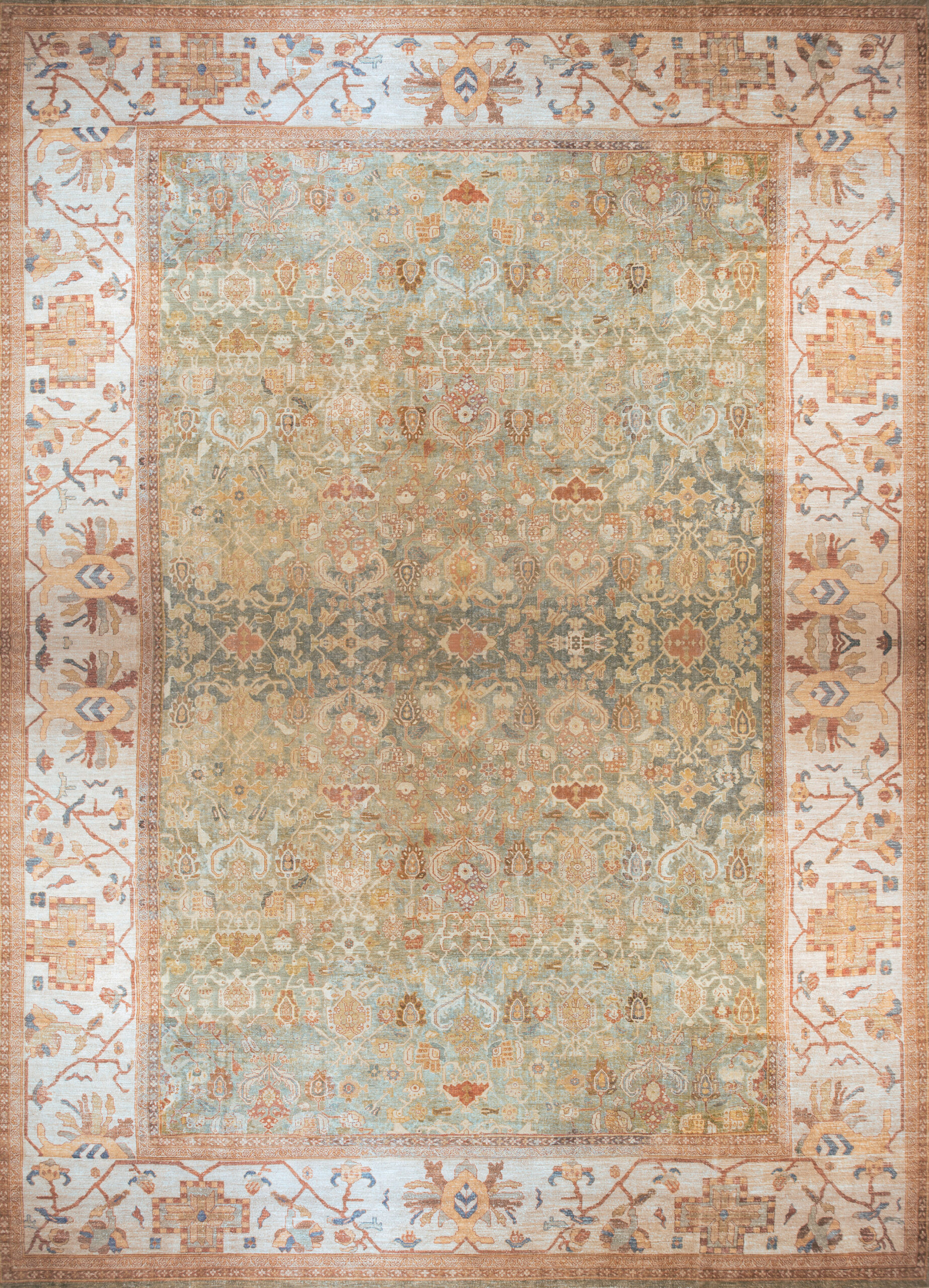 The field is dominated by a beautifully aged, soft celadon hue, establishing it firmly among desirable green color rugs. This specific palette, achieved through natural dyes, allows the intricate, stylized palmettes and vinery to float across the surface. The design is characteristic of Sultanabad rugs, utilizing large-scale repeating elements that provide both complexity and visual clarity.
