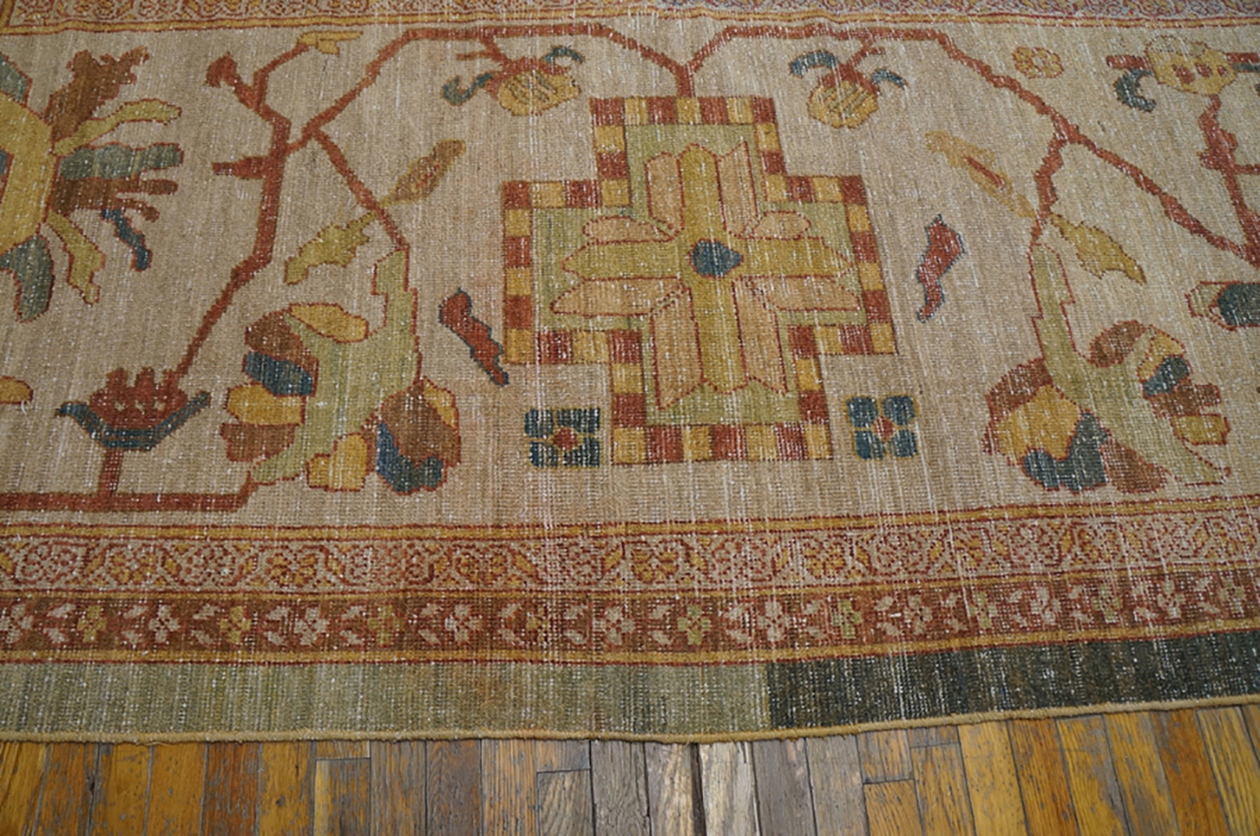 Measuring generously, this piece is classified as a large oversized big rug, making it an ideal anchor for expansive drawing rooms or grand dining halls. The sheer scale enhances the impact of the all-over design, allowing the subtle shifts in tone and texture—hallmarks of genuine age—to be fully appreciated across the vast expanse of the wool pile.