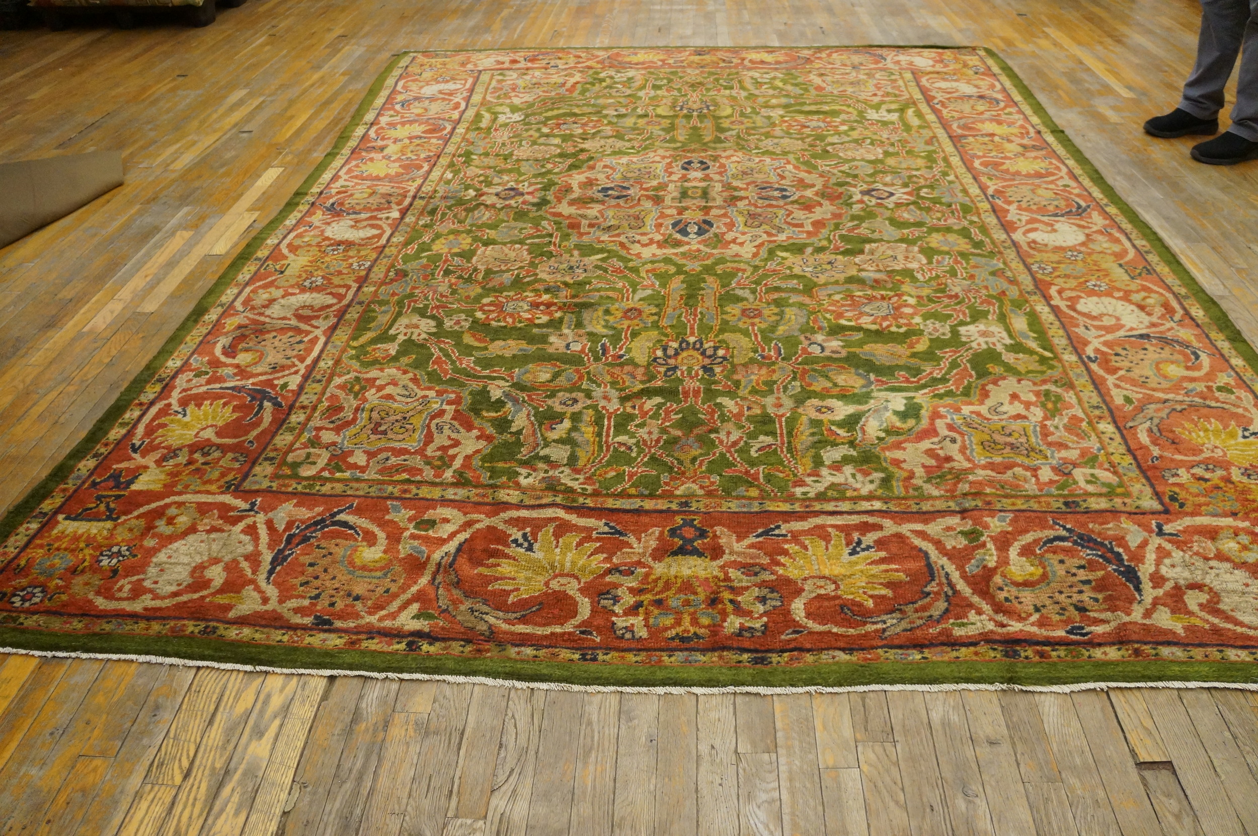 Antique Sultanabad Persian Green 1890s Rug, Circa Date: 1890s. This magnificent example of 19th-century Persian weaving exemplifies the grandeur associated with Sultanabad rugs. Originating from the Arak region, these pieces were highly sought after by Western markets for their sophisticated designs and robust structure, positioning them among the most desirable antique rugs of the period.