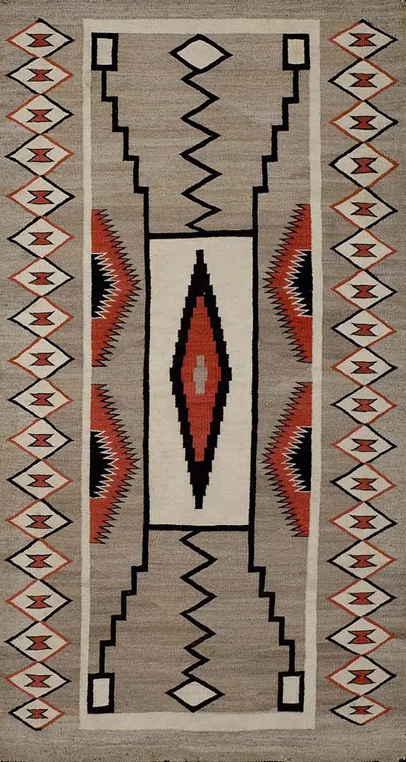 At the heart of the composition lies the Center of the World (or the Lake of Emergence), a potent focal point from which the narrative unfolds. From this nucleus, four stepped “lightning” bolts radiate toward the corners of the rug. These diagonal vectors connect the center to the four rectangular motifs in the corners, traditionally representing the Four Sacred Mountains that define the boundaries of the Diné Tah: