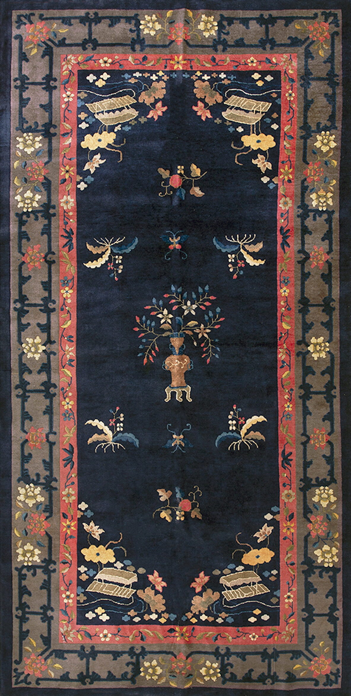 The deep, saturated indigo field provides a dramatic backdrop for the meticulously rendered traditional motifs. This stunning use of a rich blue color rugs highlights the delicate balance of the composition, featuring a central vase overflowing with blossoms, flanked by stylized butterflies and auspicious cloud bands.